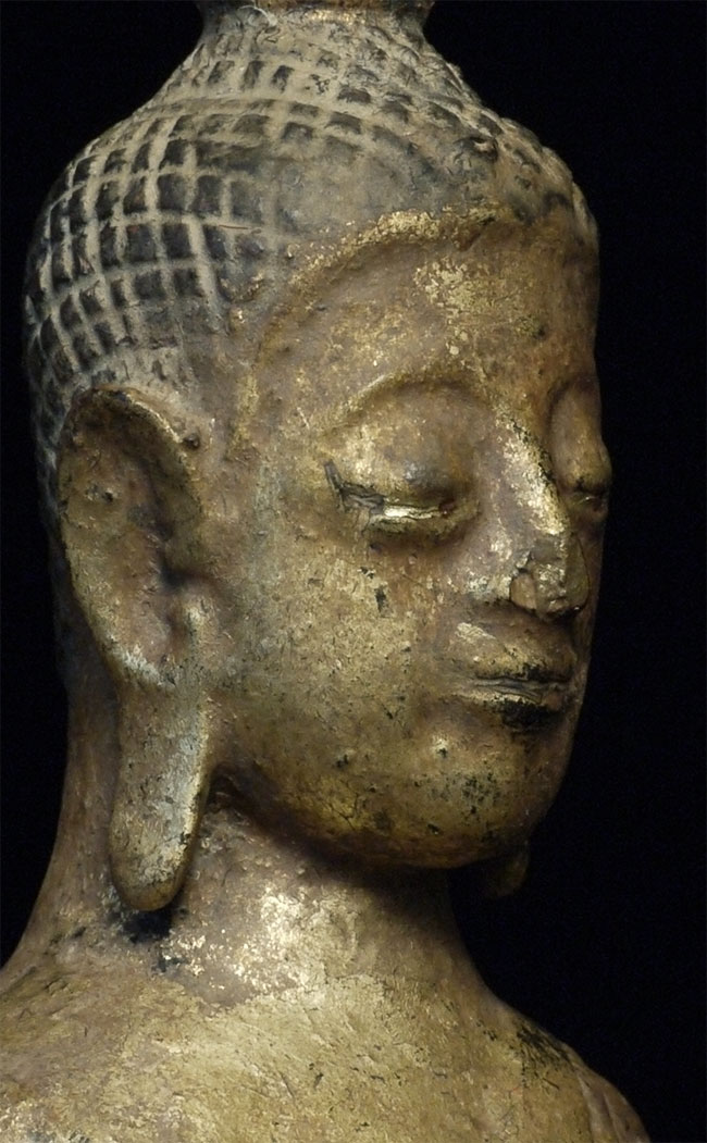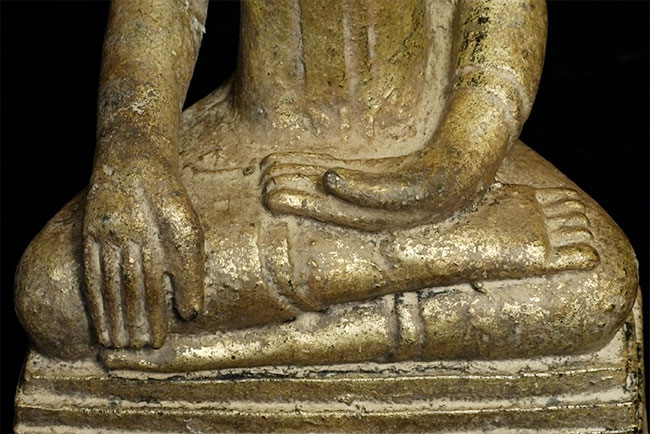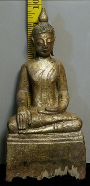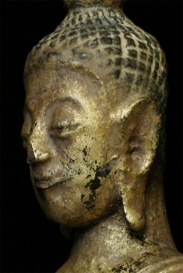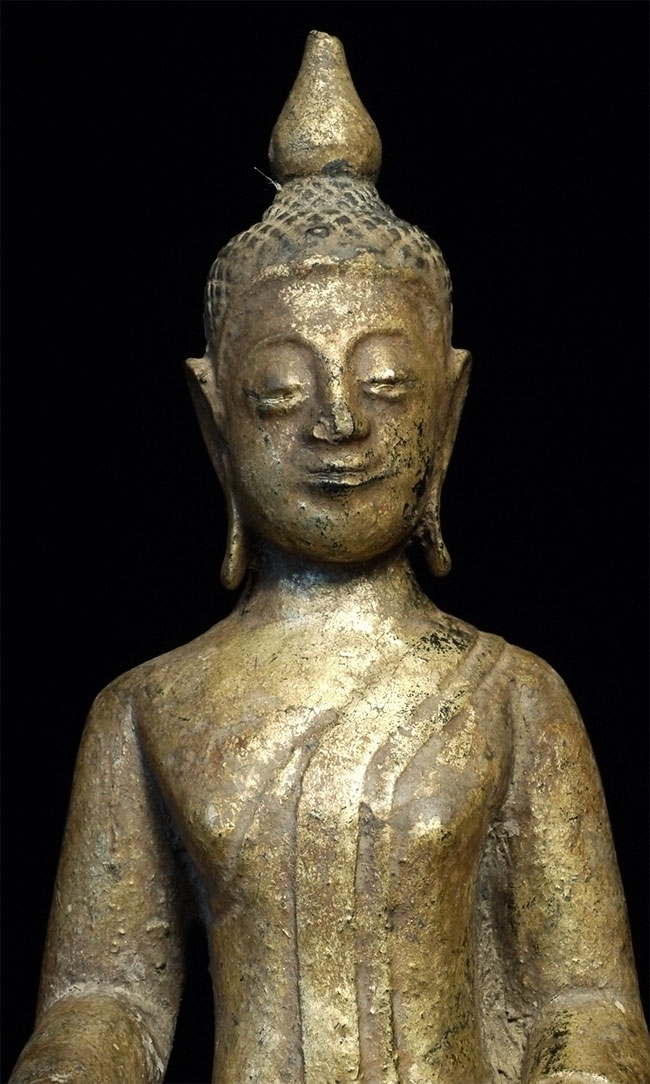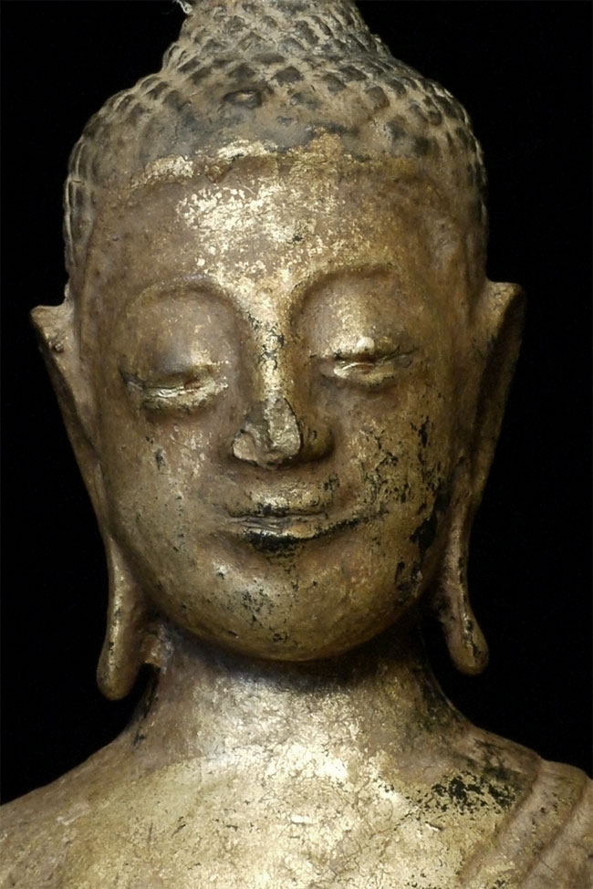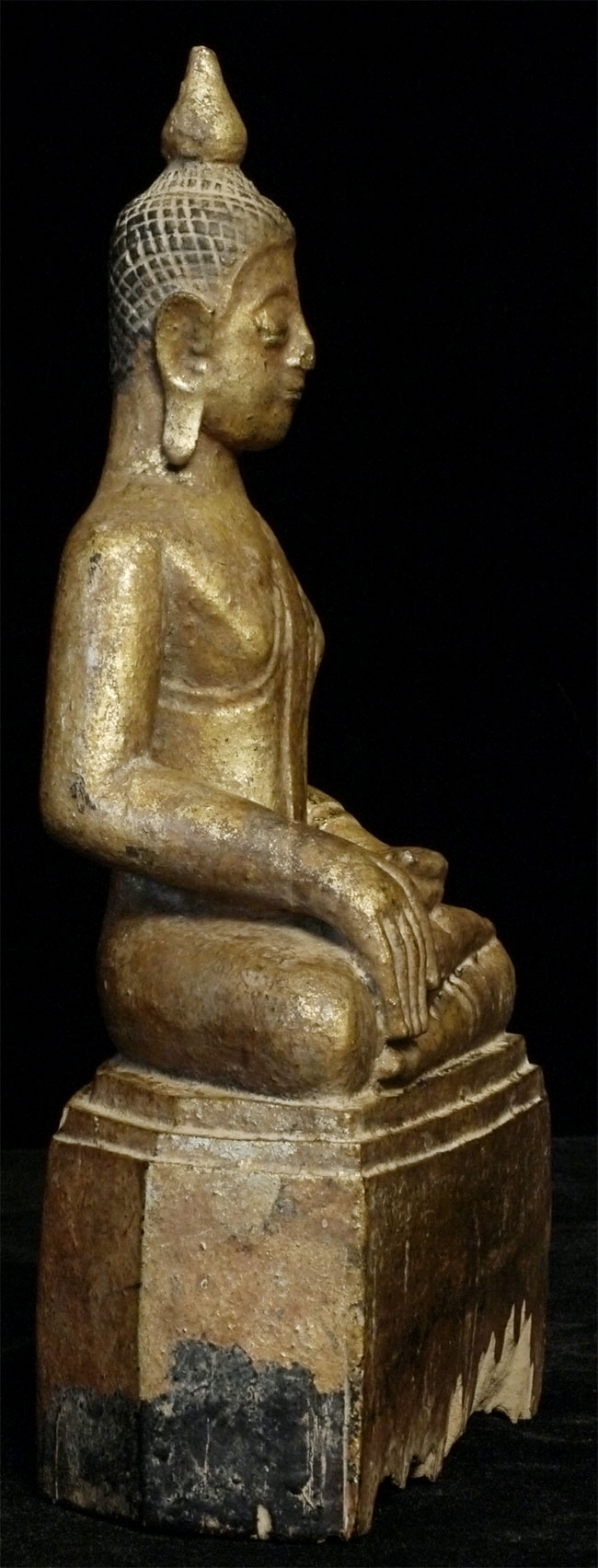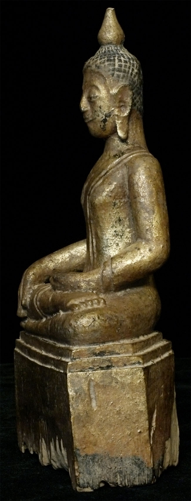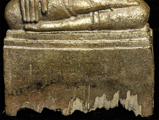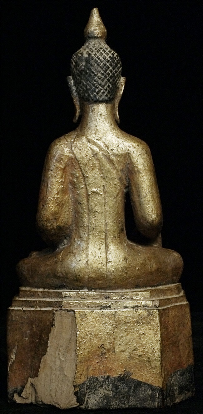 Antique Northern Thai Buddha. Inscription on the front of the base. Sits 9.75 inches tall.