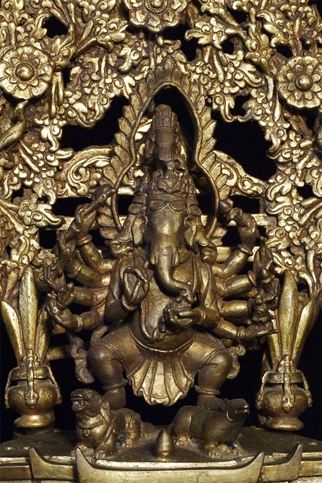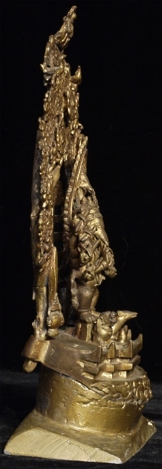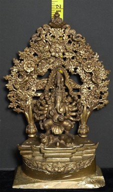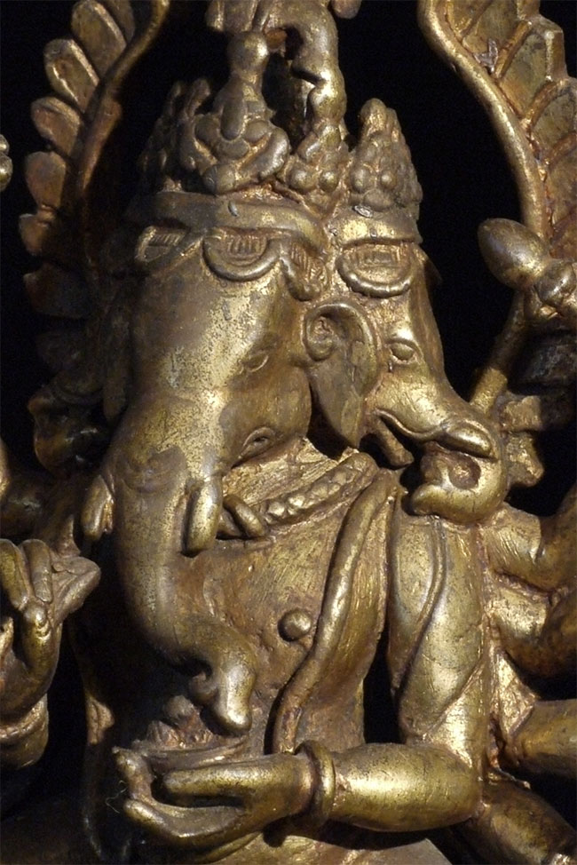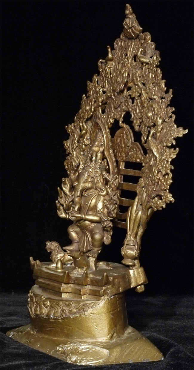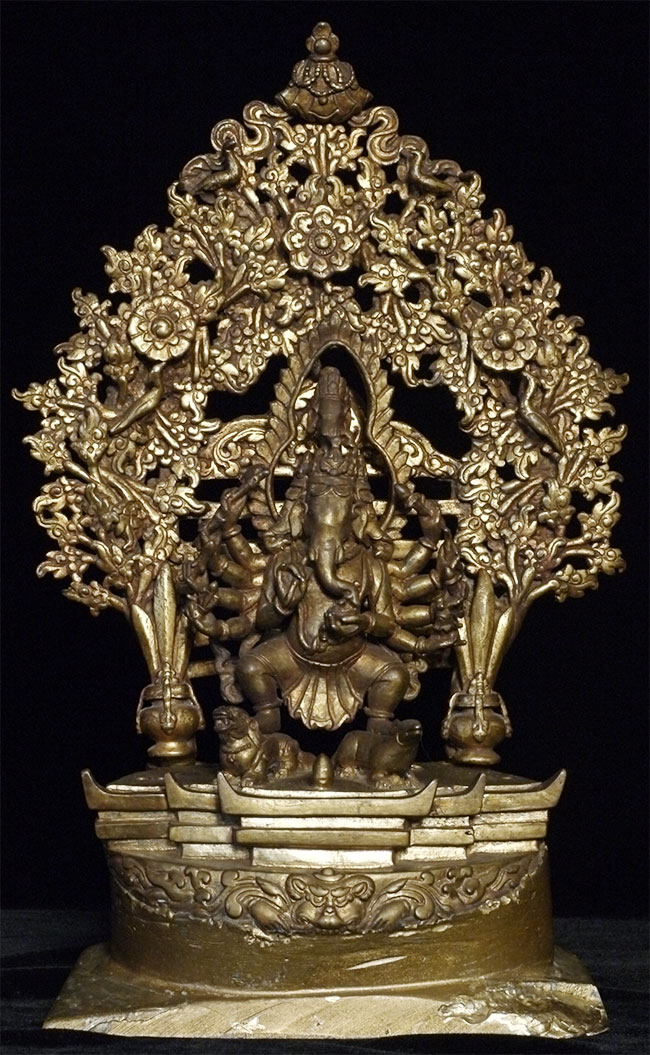 Wonderful 19thC tantric Hindu bronze Ganesh. Extremely intricate, with great detail. Animated and very expressive. Extremely heavy. Stands 11.75" tall, base measures approximately 6.5" x 3.75". Possibly originally part of a large elaborate oil lamp, and converted to current form by adding lead base and elaborate back-plate. Either Nepalese or Mix of Indian figure and Nepalese back-plate. Was modified in mid 20thC together with item 6609 to create a set, though each being sold separately(see photo of both items side by side). Some loss/damage to lead base. Beautiful!