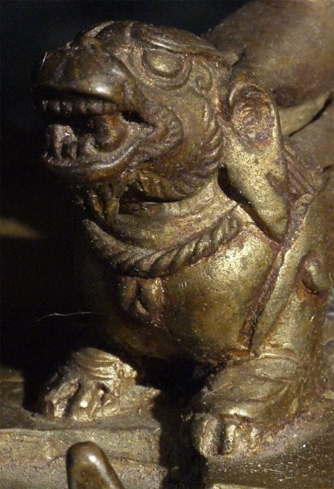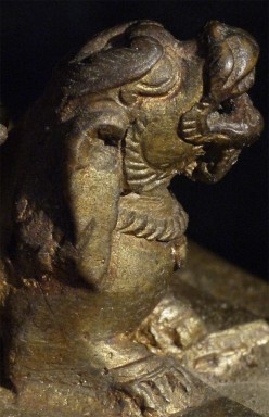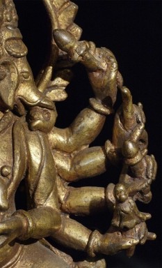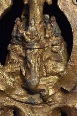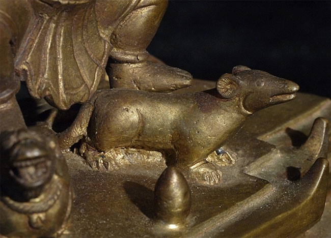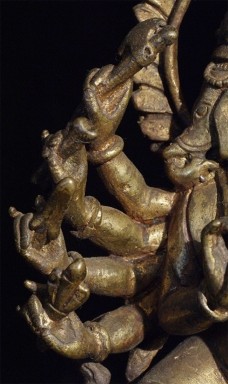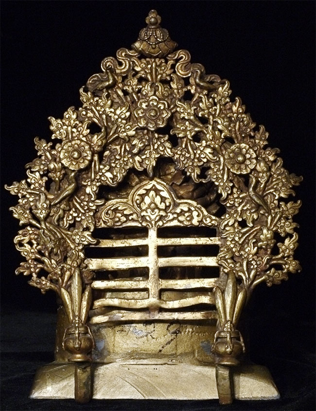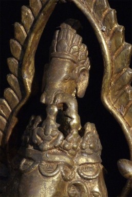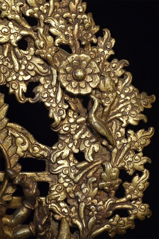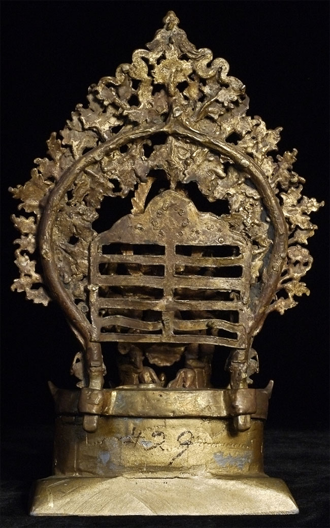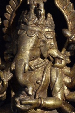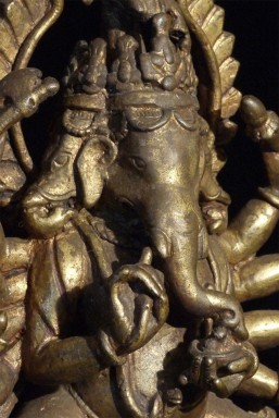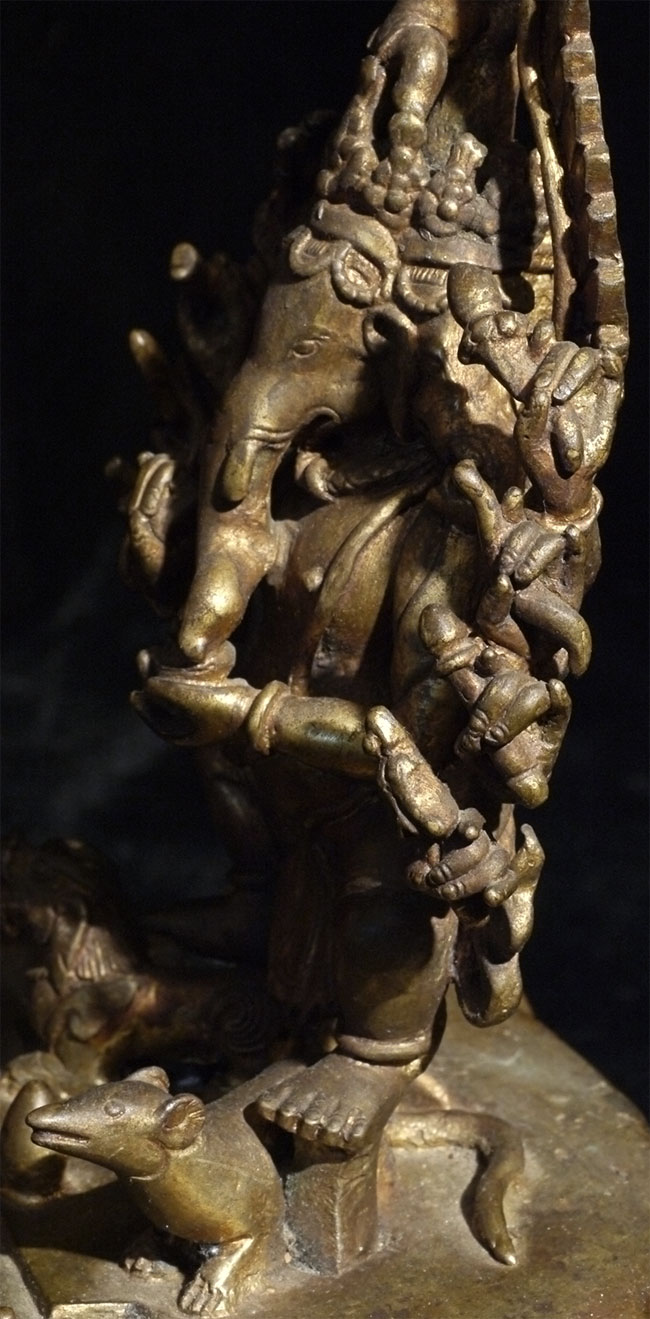 Wonderful 19thC tantric Hindu bronze Ganesh. Extremely intricate, with great detail. Animated and very expressive. Extremely heavy. Stands 11.75" tall, base measures approximately 6.5" x 3.75". Possibly originally part of a large elaborate oil lamp, and converted to current form by adding lead base and elaborate back-plate. Either Nepalese or Mix of Indian figure and Nepalese back-plate. Was modified in mid 20thC together with item 6609 to create a set, though each being sold separately(see photo of both items side by side). Some loss/damage to lead base. Beautiful!