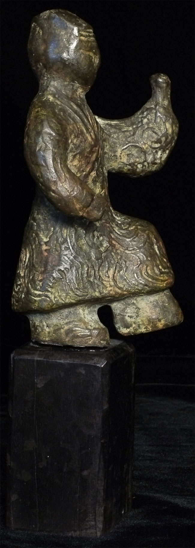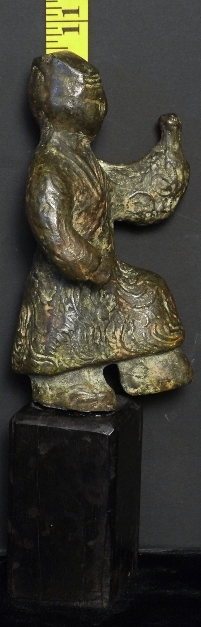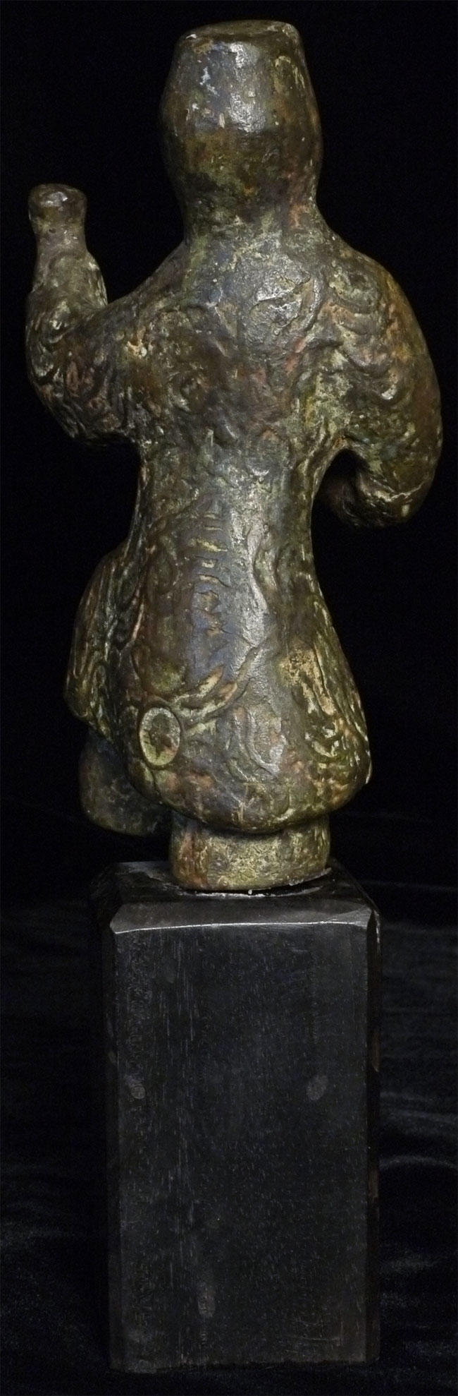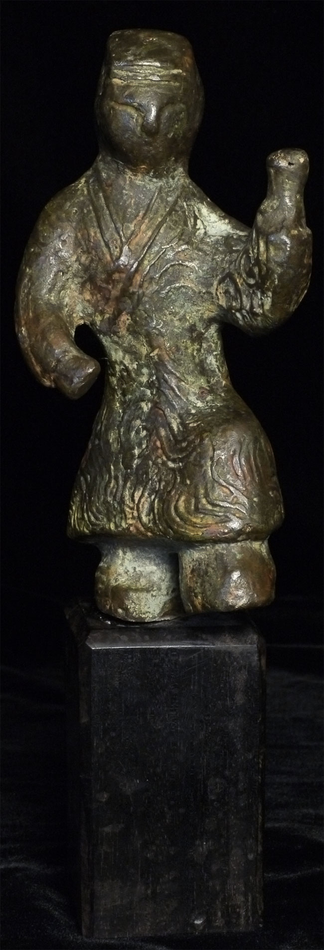 An early bronze Chinese figure in a martial arts stance. Hard to date- may be a tomb piece, though any related pieces I've seen have been fired in clay or been made or wood. Appears to be polychrome remains in the robes. Has a custom high quality ebony base. Bronze alone is 6.75" tall, 10 and 3/8"with the base.