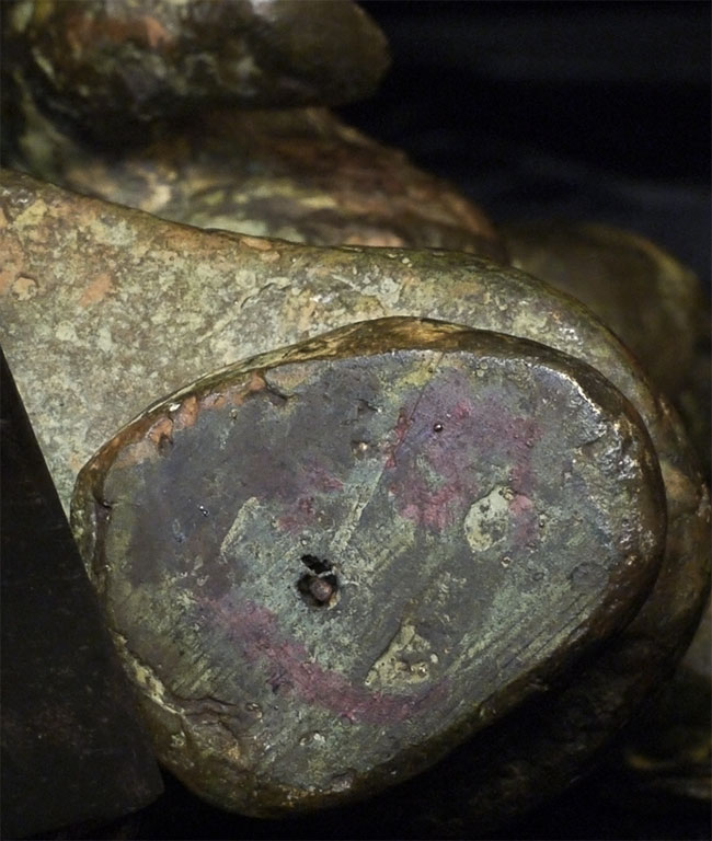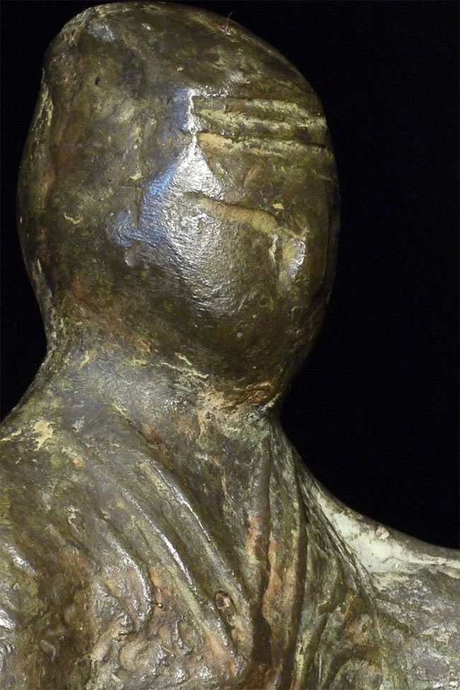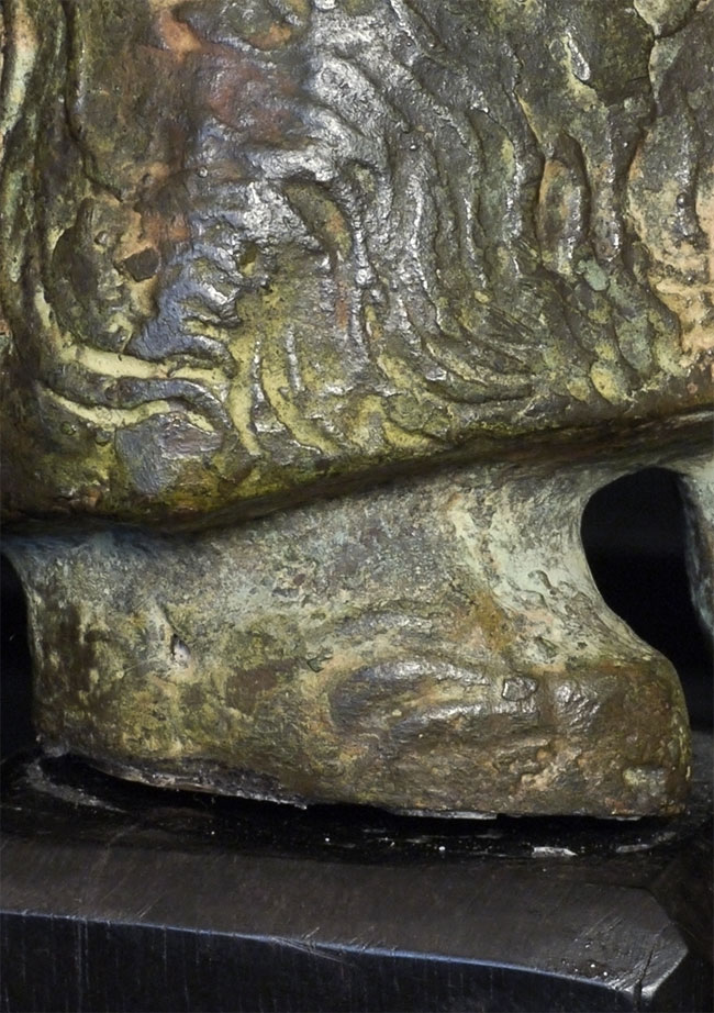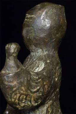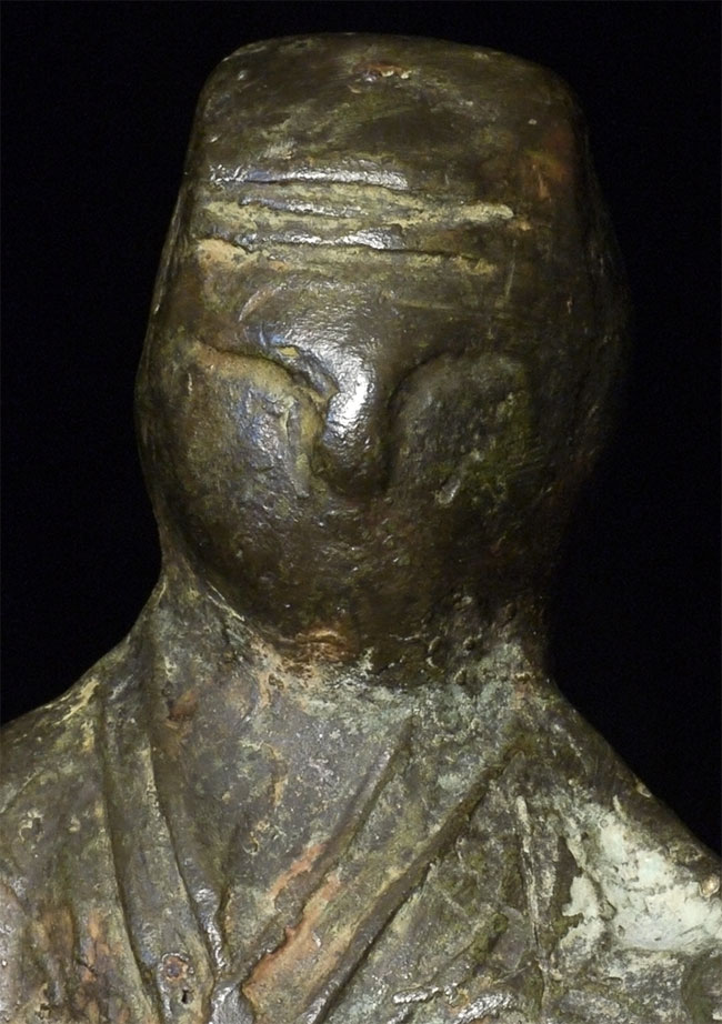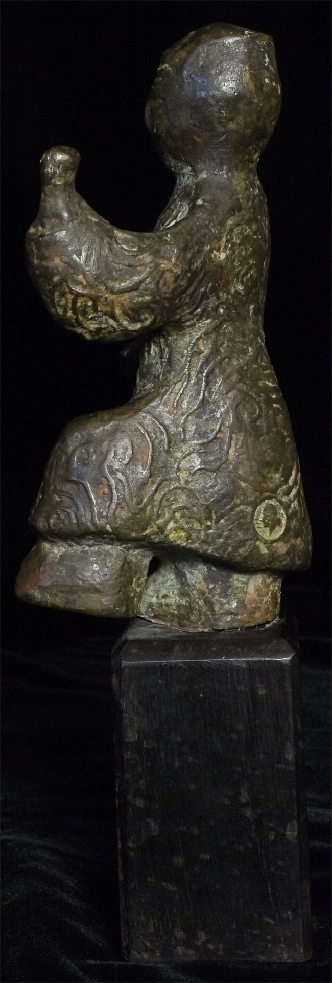 An early bronze Chinese figure in a martial arts stance. Hard to date- may be a tomb piece, though any related pieces I've seen have been fired in clay or been made or wood. Appears to be polychrome remains in the robes. Has a custom high quality ebony base. Bronze alone is 6.75" tall, 10 and 3/8"with the base.