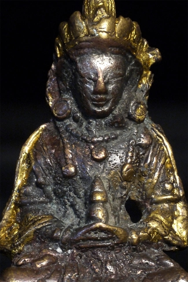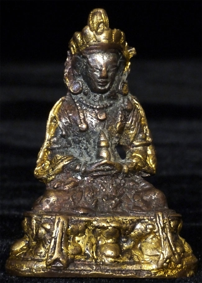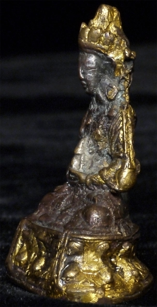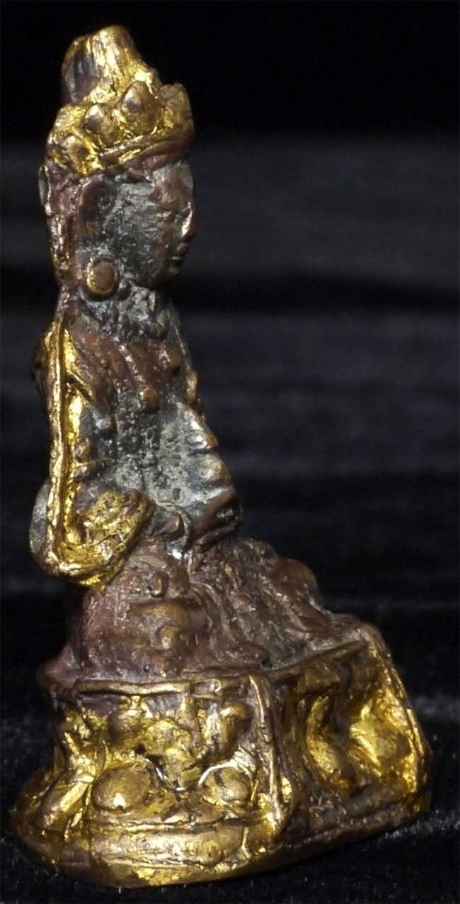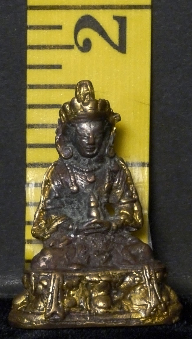 Great Mongolian folk Miniature, with different colored gilding (silver and gold)- excavated from a ruined temple site, reportedly in the 1980's with a metal detector. Mongolia had over 2 000 temples destrpyed in a single day when the Soviets invaded in the late 1920's. . At first I thought this was a fake, but upon inspection I have come to believe that this (and the 2 other related pieces I purchased which were excavated from the same site 6624 and 6626). In classic Mongolian style, the metals are unusual, the casting is provincial. Loss of an arm. Sits only 1.5 nches tall. Purchased over 20 years ago when Mongolia was opening to the west. Quite rare- these 3 are the only 3 authentic old 3 metal pieces like them I have come across.