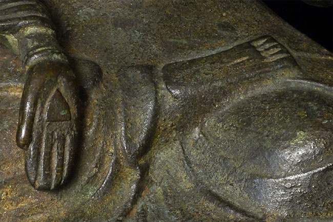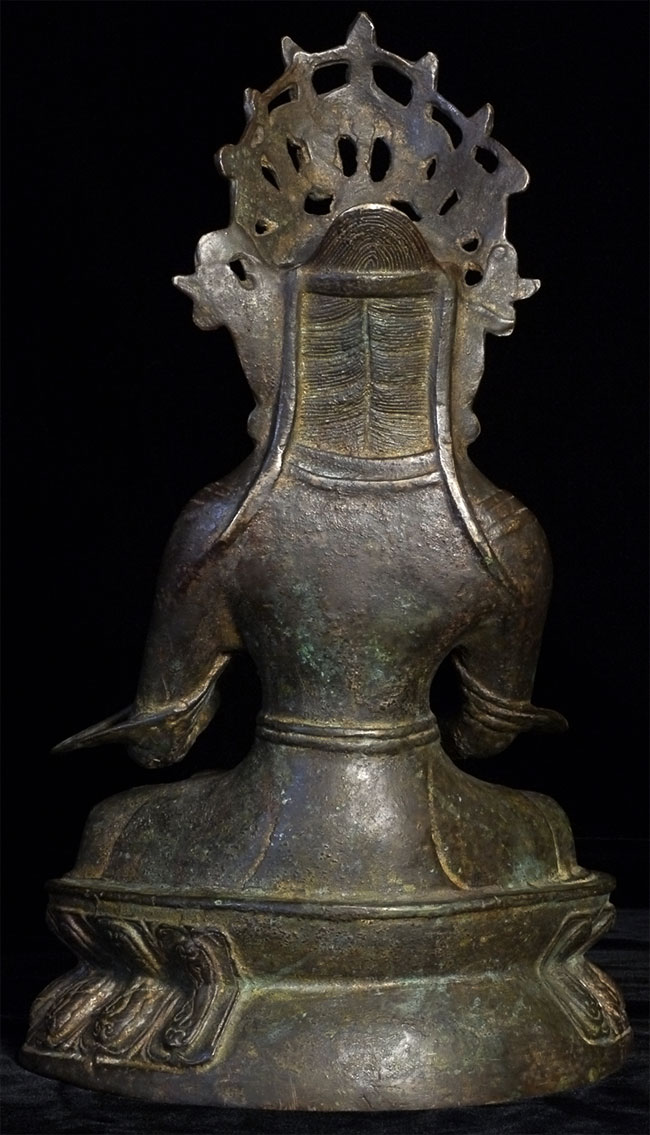 Unusual antique Chinese bronze Buddha in a Ming style . I do not believe this is one of the multitude of new fakes flooding the market, but is a provincial piece, and is likely 19thC. Purchased many years ago from a mid-west estate. The hands are tiny and the crown is huge. The face is very well sculpted, and the overall effect is very pleasing. Large at 13.75 inches tall, 8.5 inches wide, 6.5 inches deep