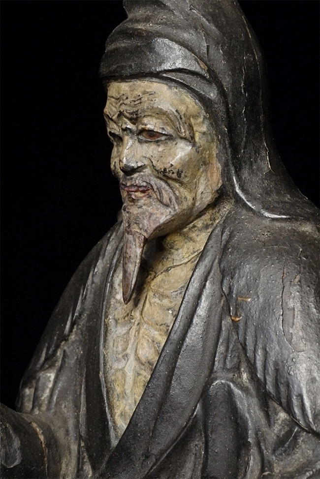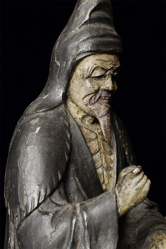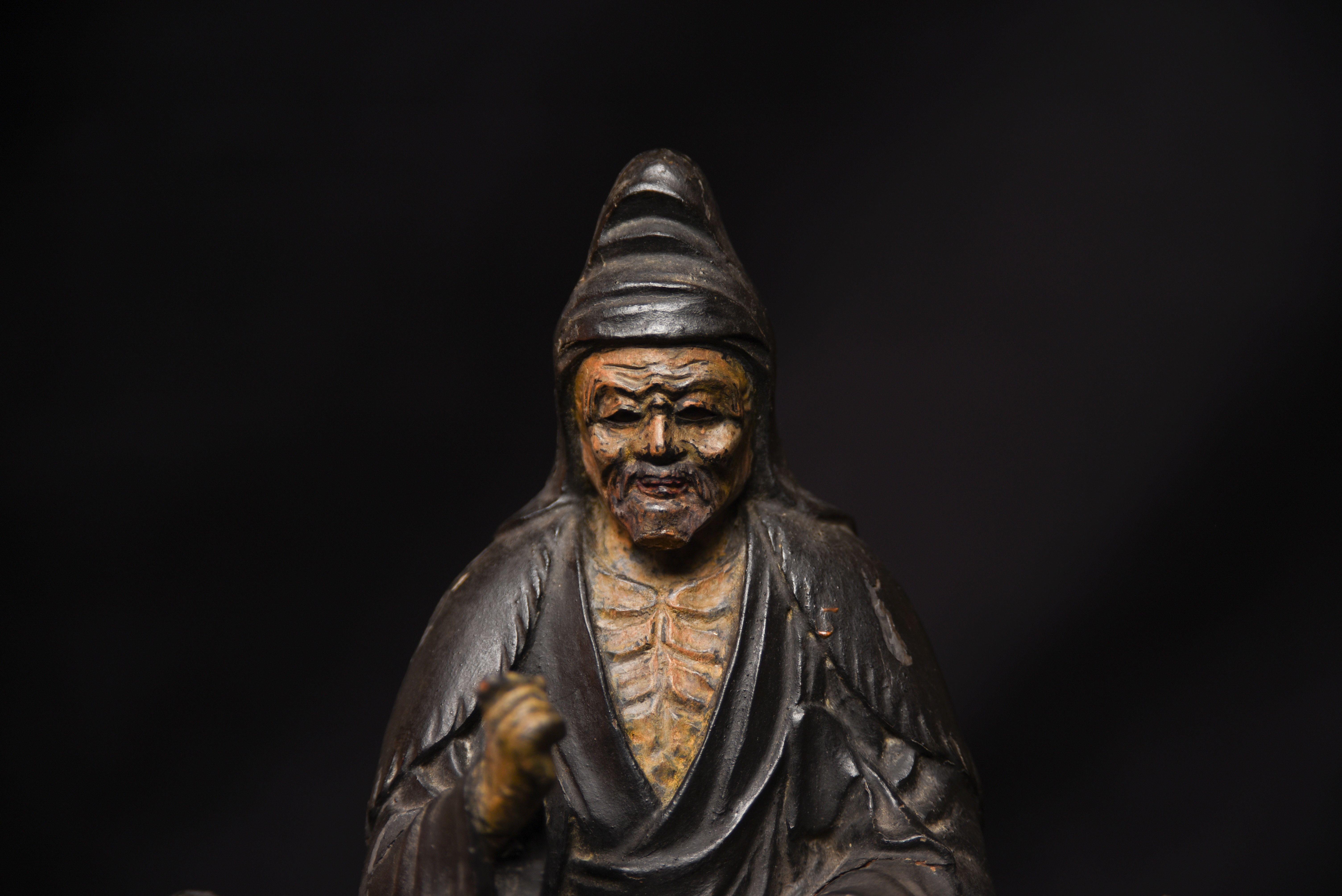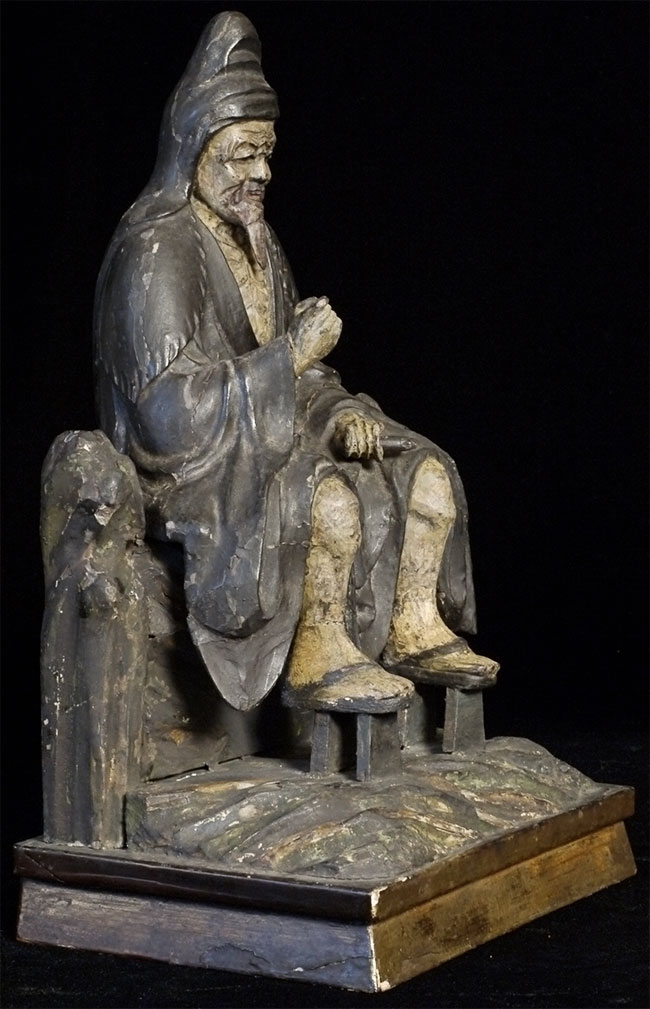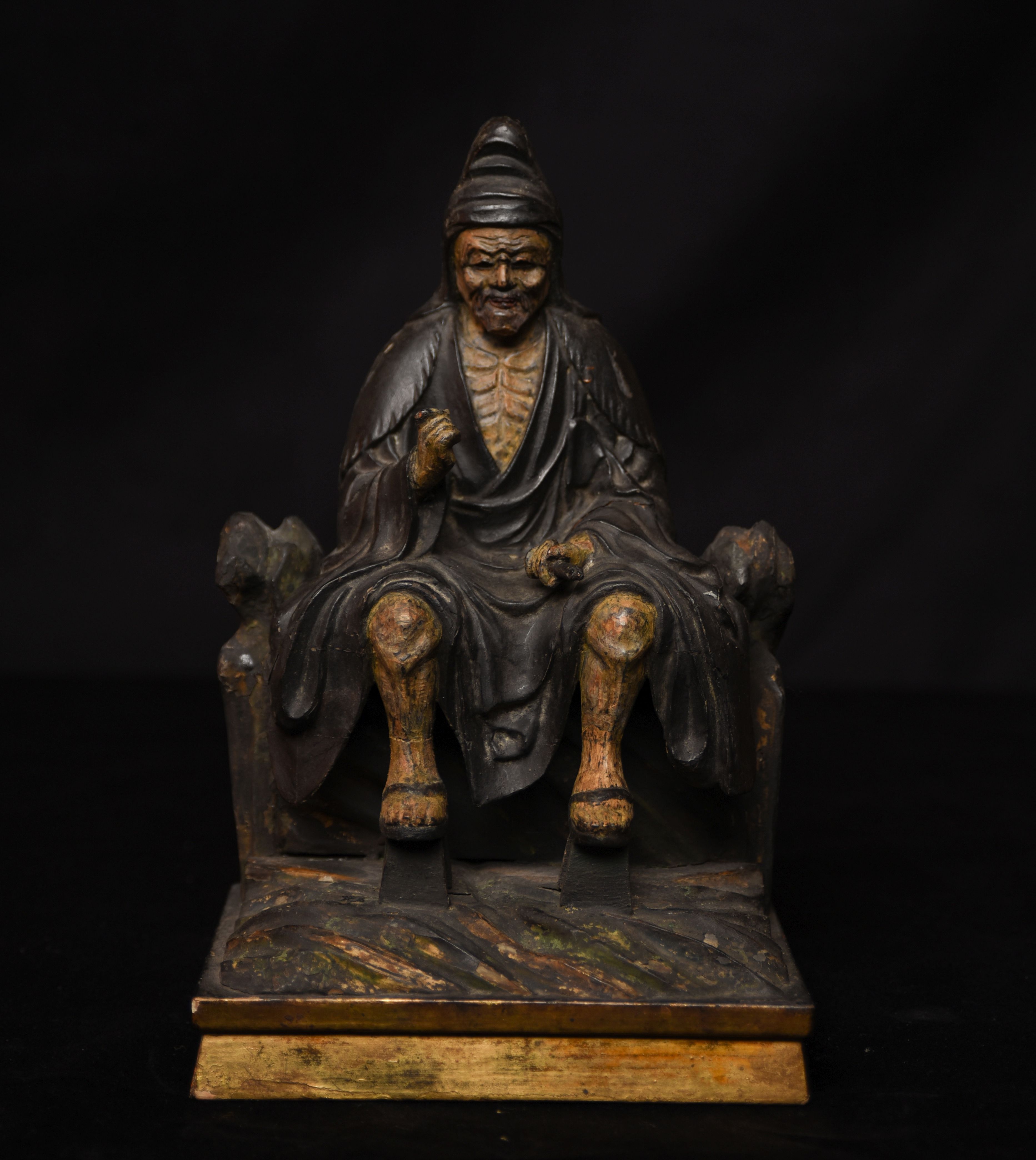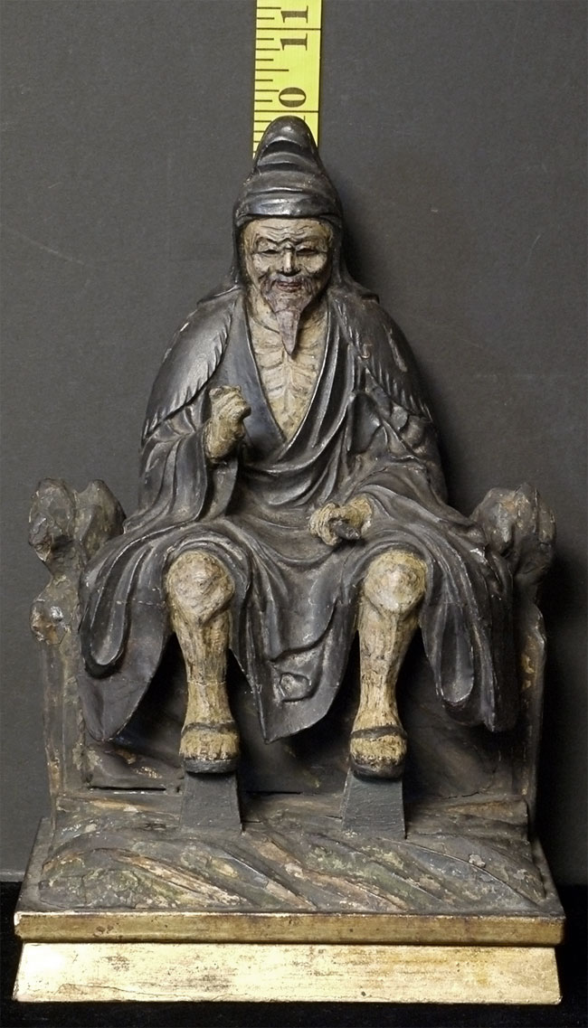 Edo period Japanese figure with glass eyes. Sits 10 inches tall, bottom measures 4.25 x 6.25 inches. Beautifully carved, with great detail. Missing implement from hand- otherwise remarkably complete for a 200+ year old wood figure.