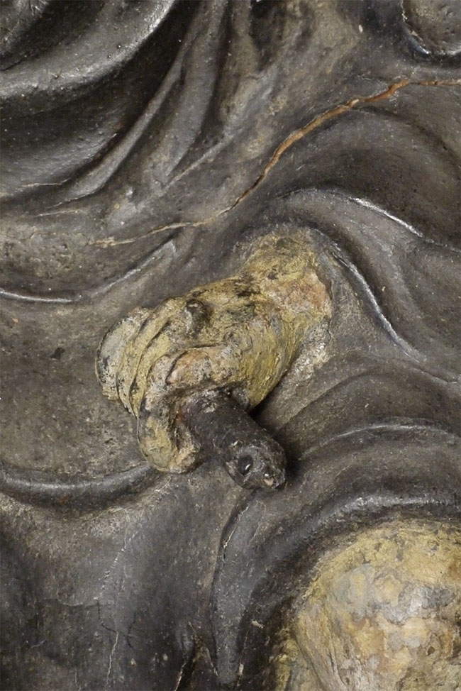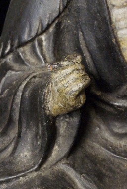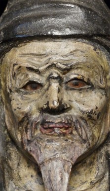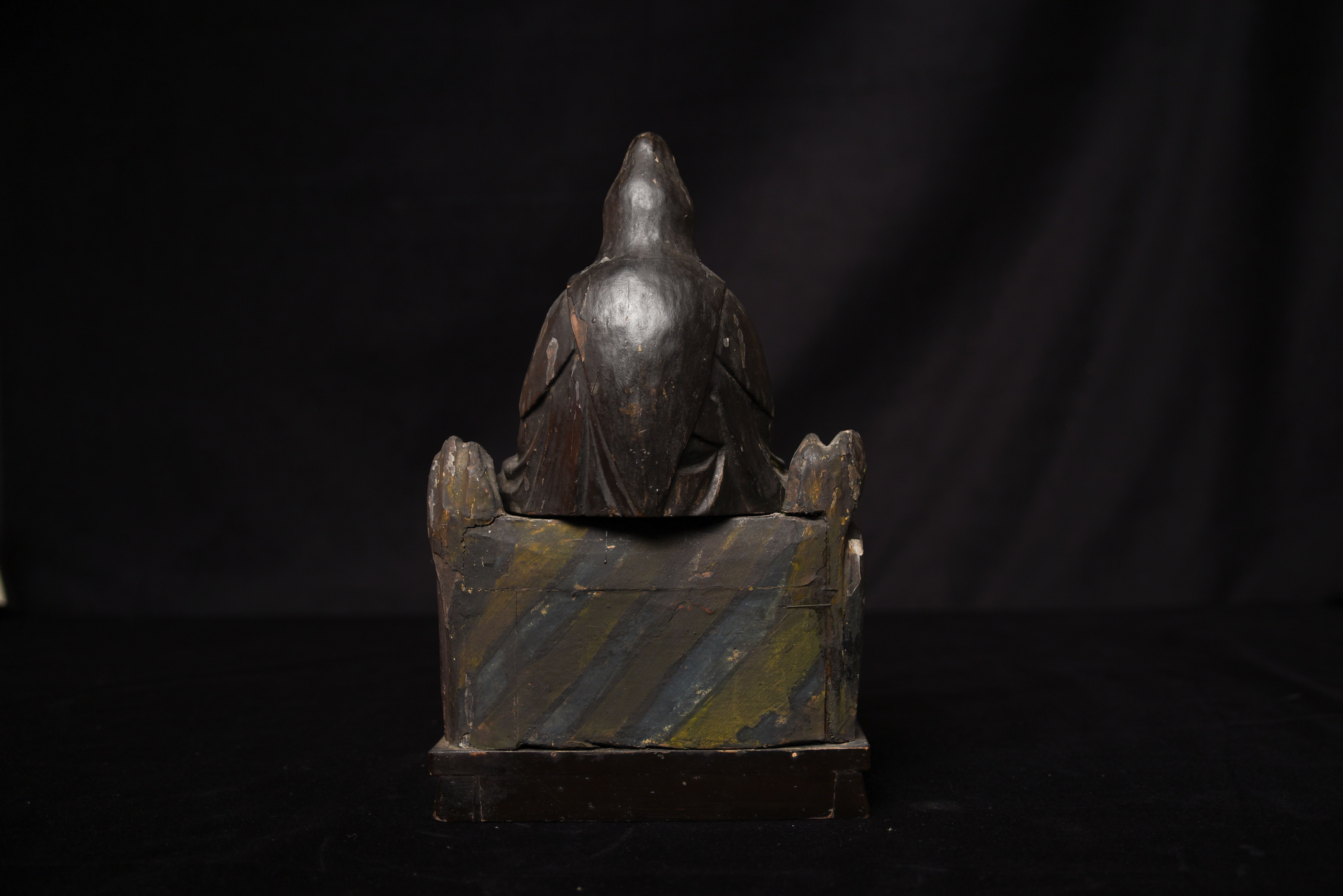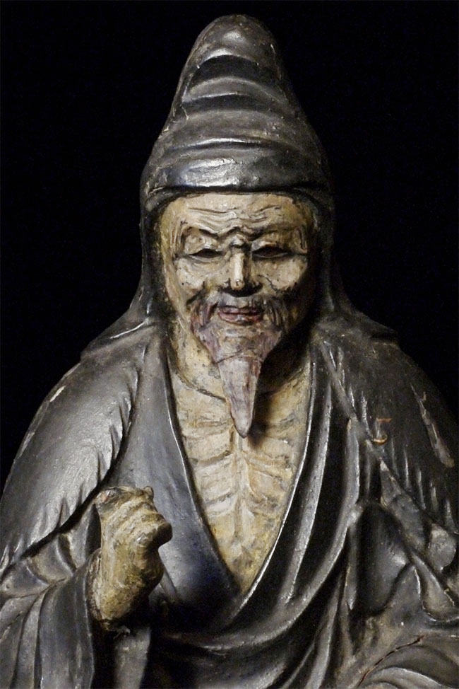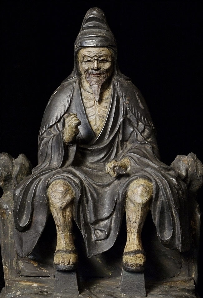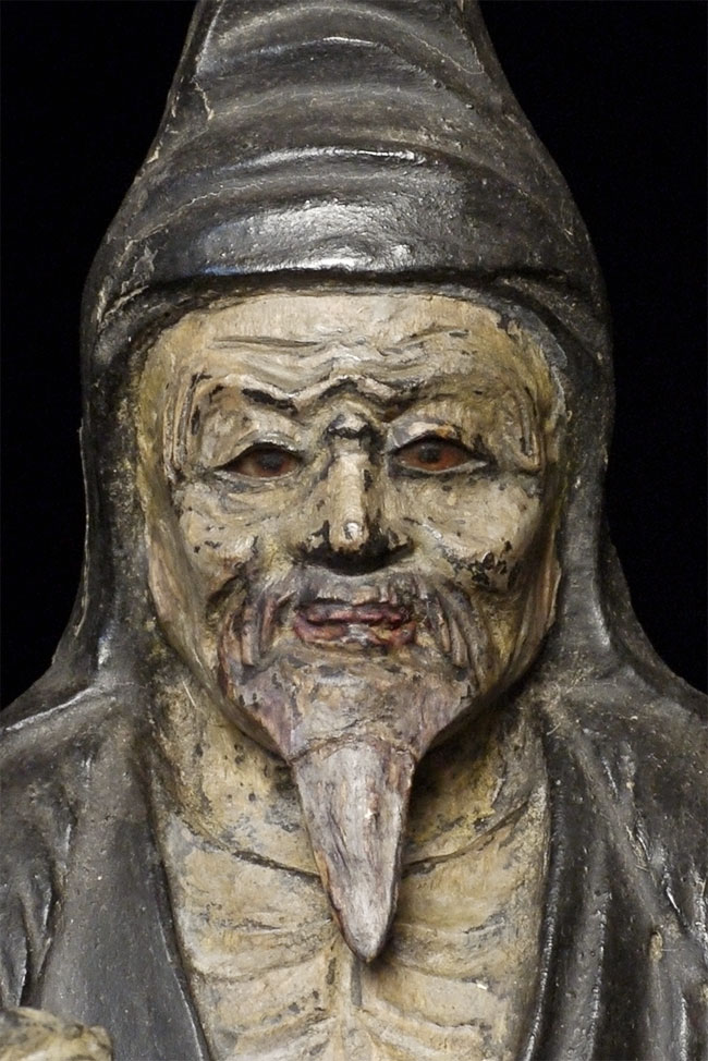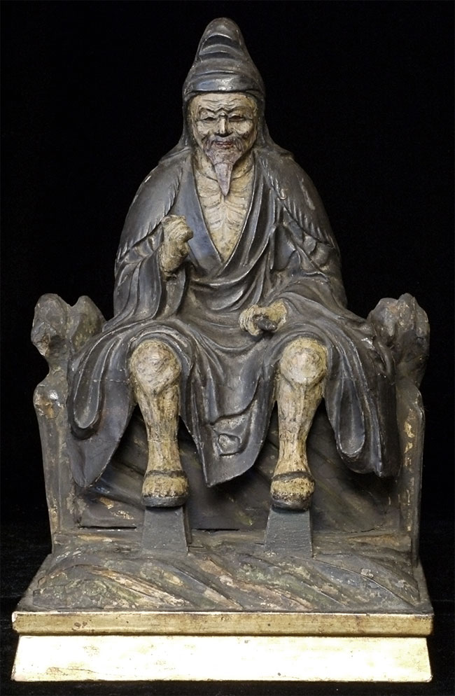 Edo period Japanese figure with glass eyes. Sits 10 inches tall, bottom measures 4.25 x 6.25 inches. Beautifully carved, with great detail. Missing implement from hand- otherwise remarkably complete for a 200+ year old wood figure.