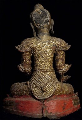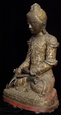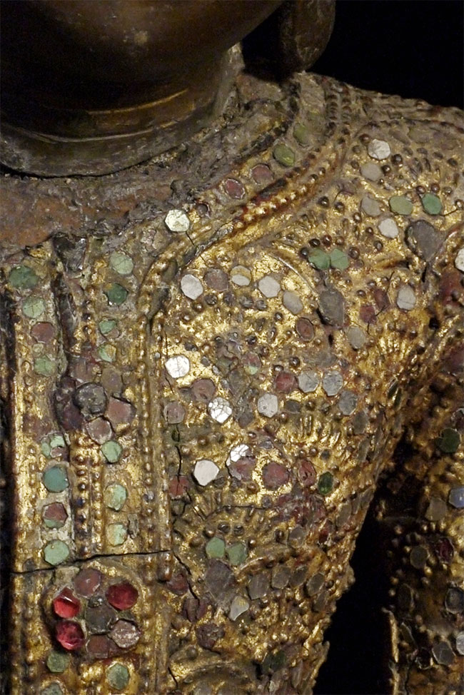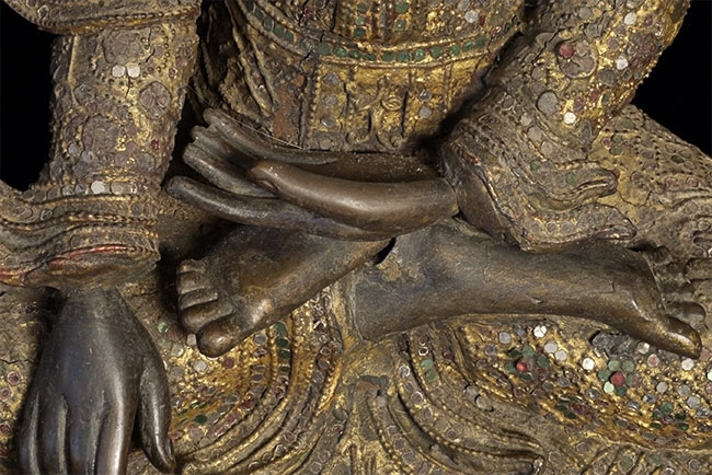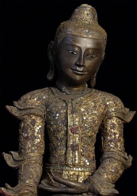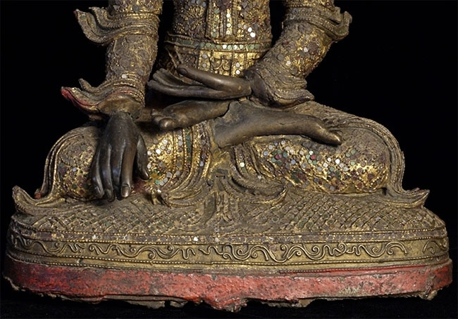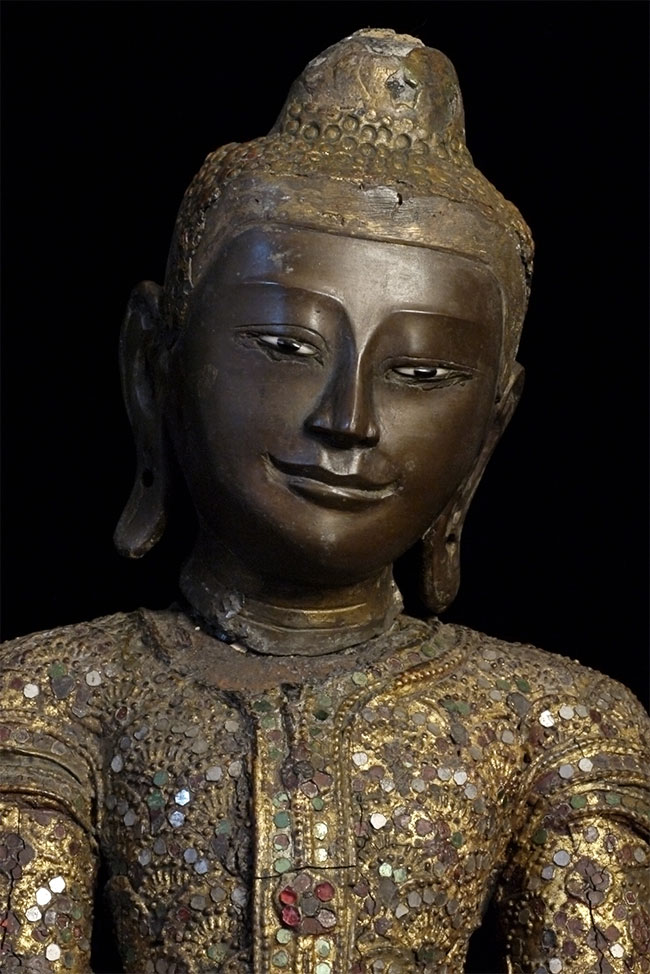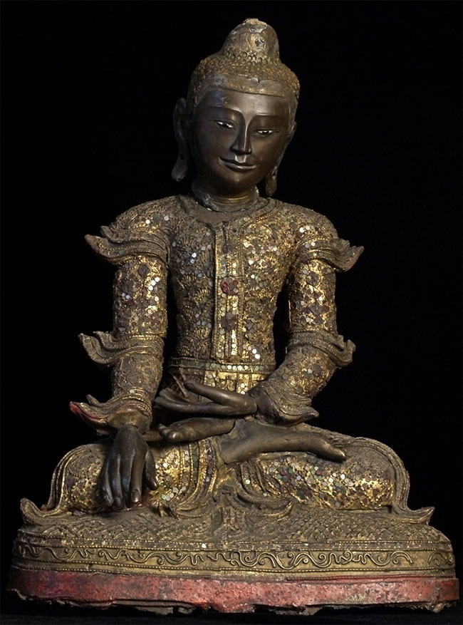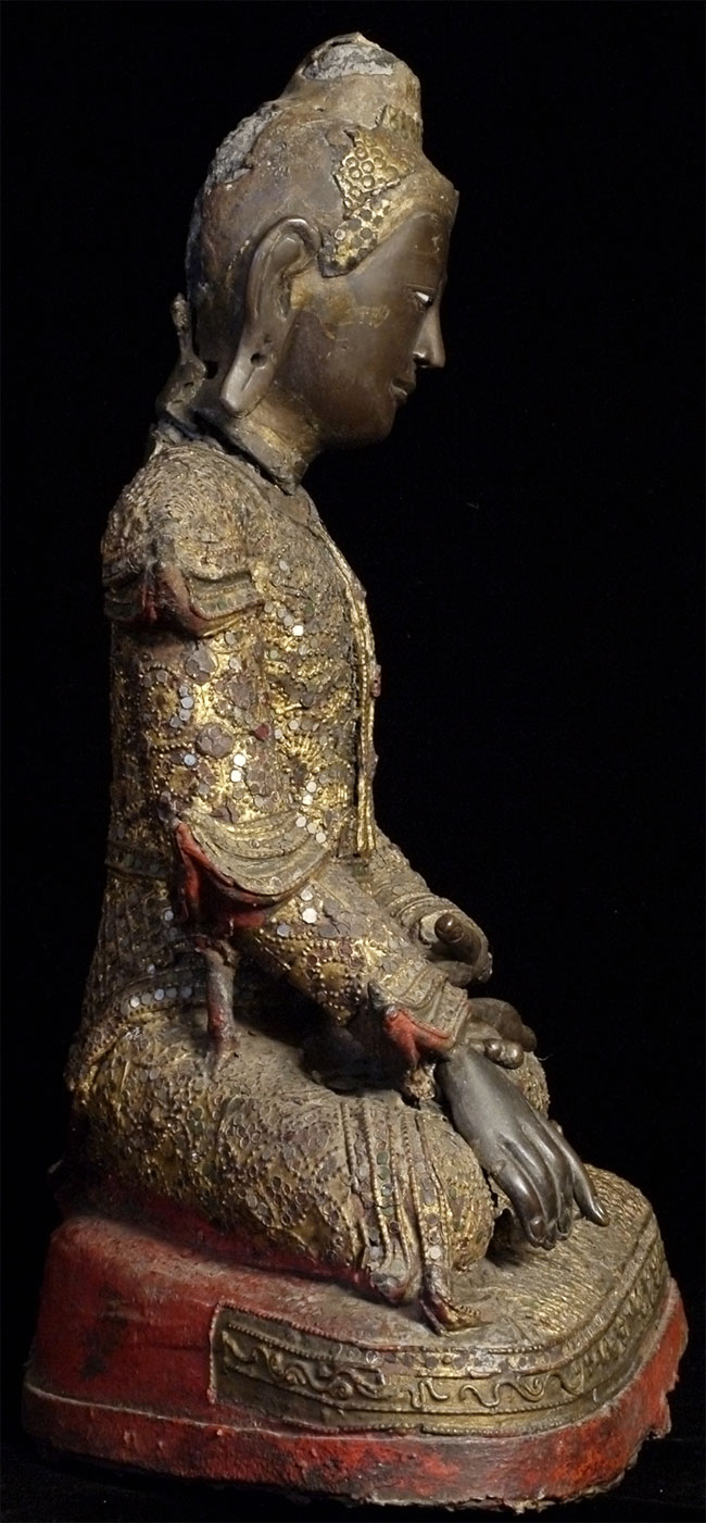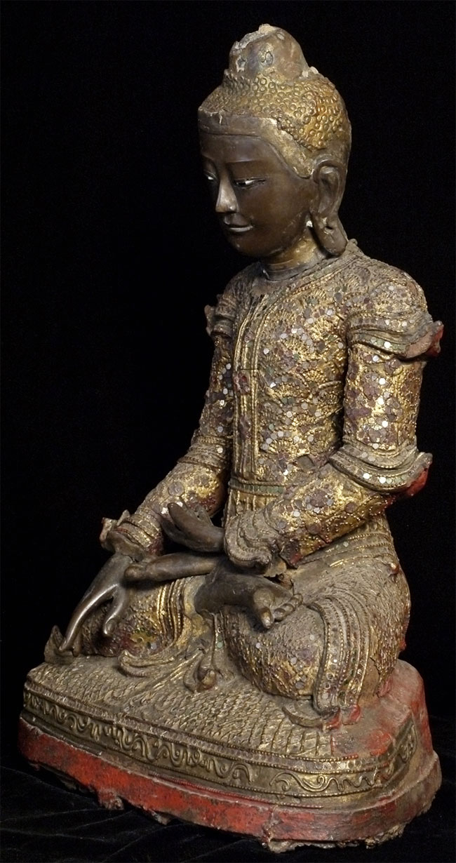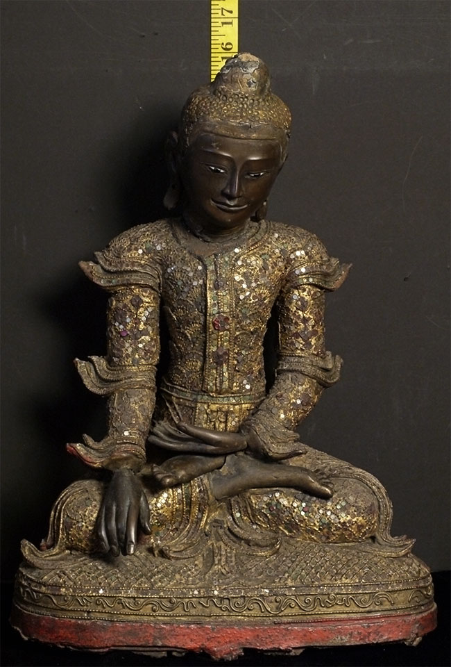 Superb 19thC Burmese Bronze Mandalay Buddha. Incredible surface design unlike any I have seen on any other bronze Buddha- ever. Neck is broken, and head leans forward and slightly to one side. It is slightly loose, but firmly connected. Other loss to the decoration- especially to the top of the head. If perfect, this would be an extremely valuable piece. Neck could be repaired, though quite beautiful as-is. I cannot guarantee that it might not shift slightly in shipping (sold as-is), though it will be packed very well, and it does seem well attached. Large at 16.25 x 12 x 8 inches, and quite heavy. Very beautiful. I've had this a long time and, even with the damage, have had a hard time letting go of it.