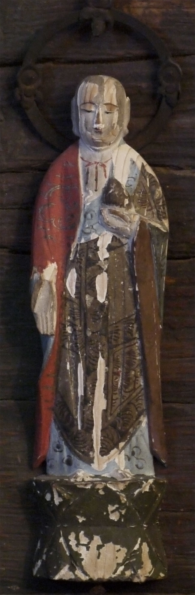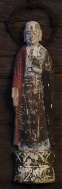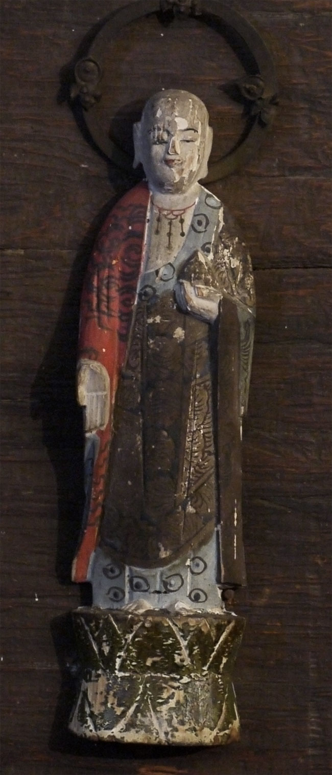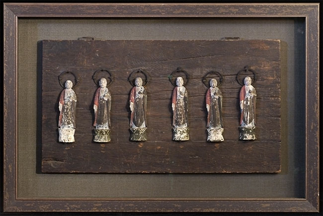 RARE early Japanese set of six wooden Buddhas attached to what appears to be the original 500+ year old backpiece. Wooden figures are each approximately 4.75 inches tall (not including halos), the modern custom frame is 23.5 x 15.5 x 1.75, museum glass. Extremely rare set- to find one with original paint would be rare- to find a complete set attached with the original wooden pegs to the original board makes this piece unique.