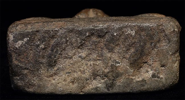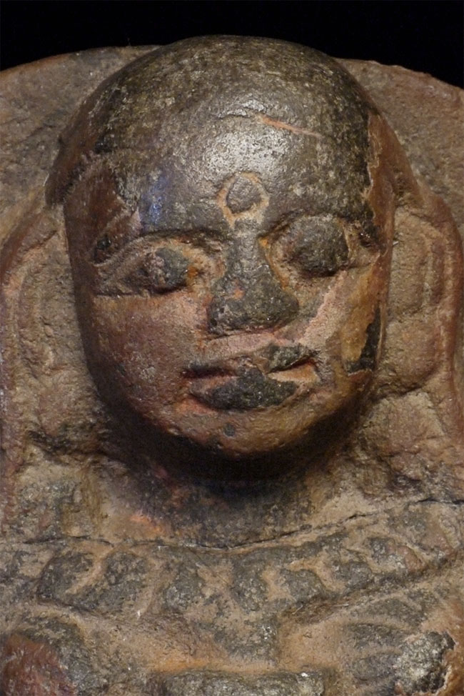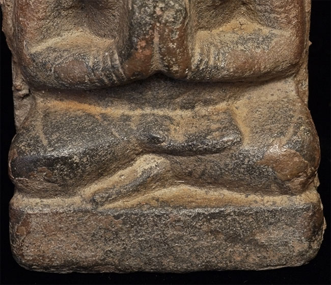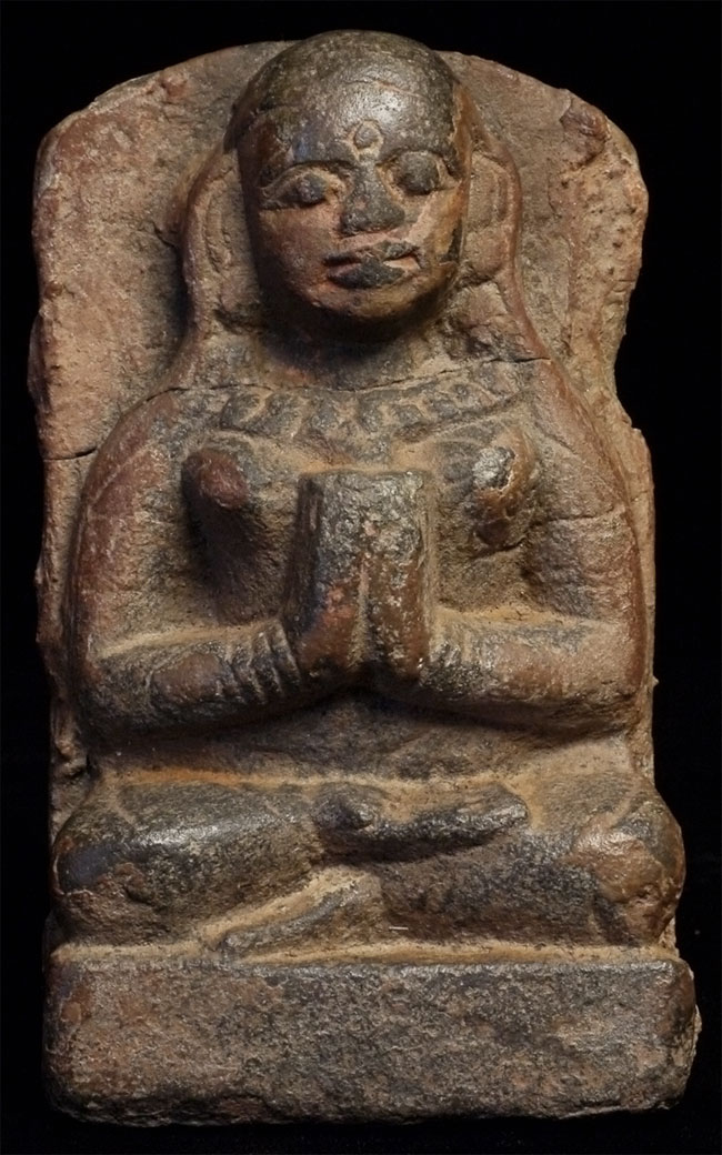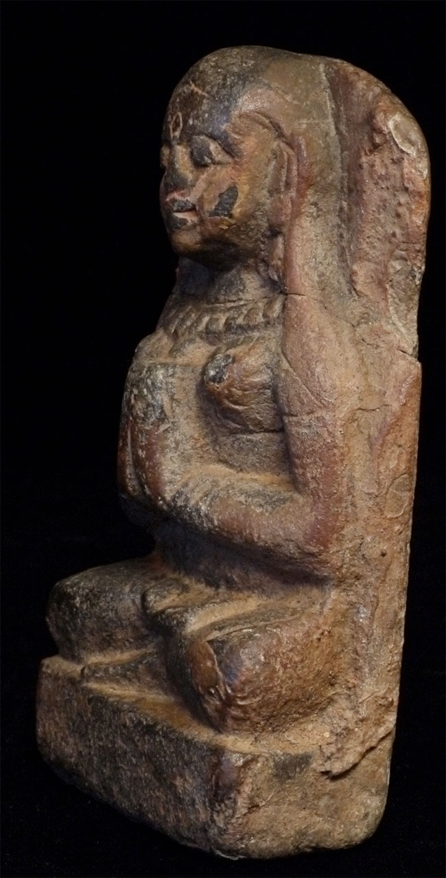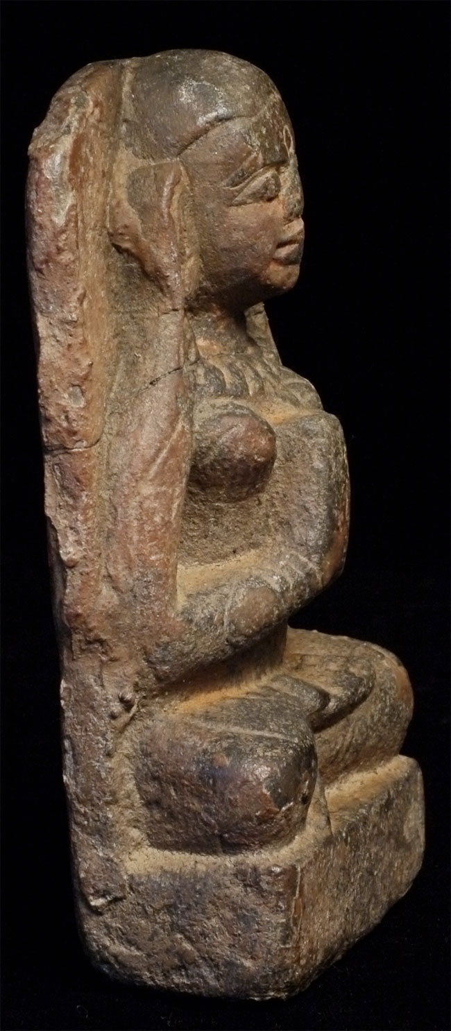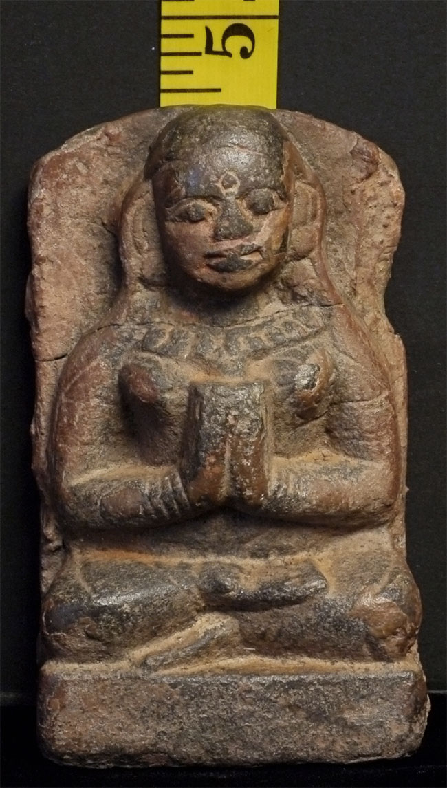 Deeply serene face on this early Nepalese stone figure in meditation. Repaired, as can be seen clearly on the back. Beautiful old patina. 4.25 inches tall. Does not stand on its own. Compelling piece- From a great old collection.