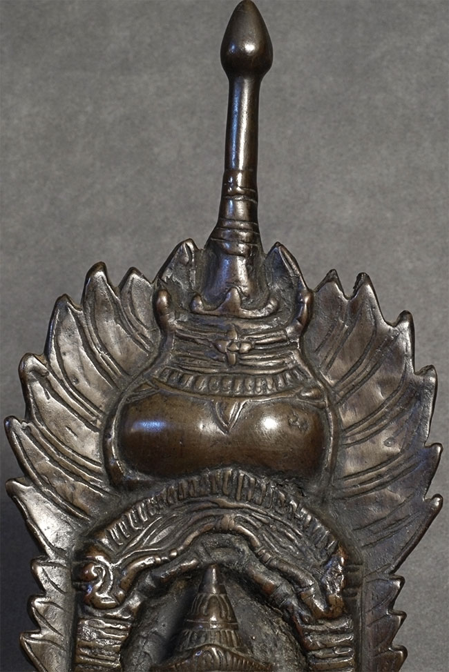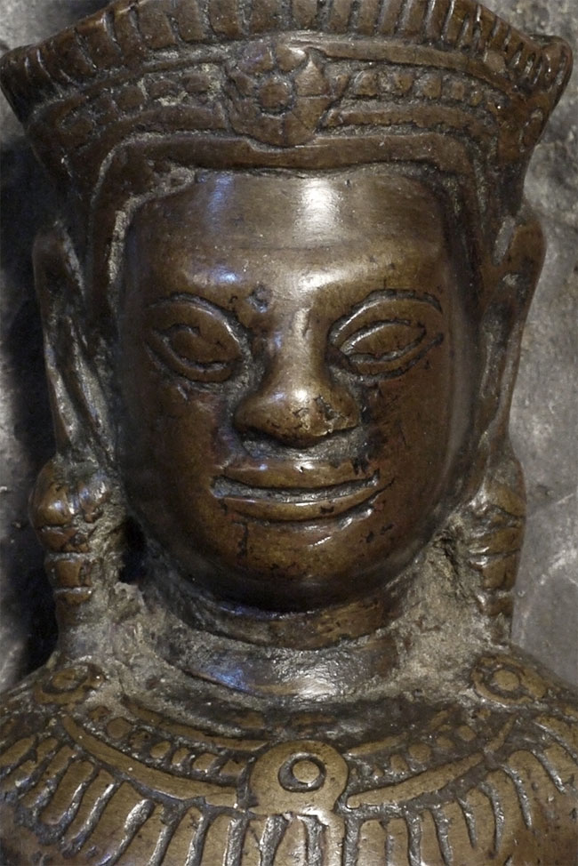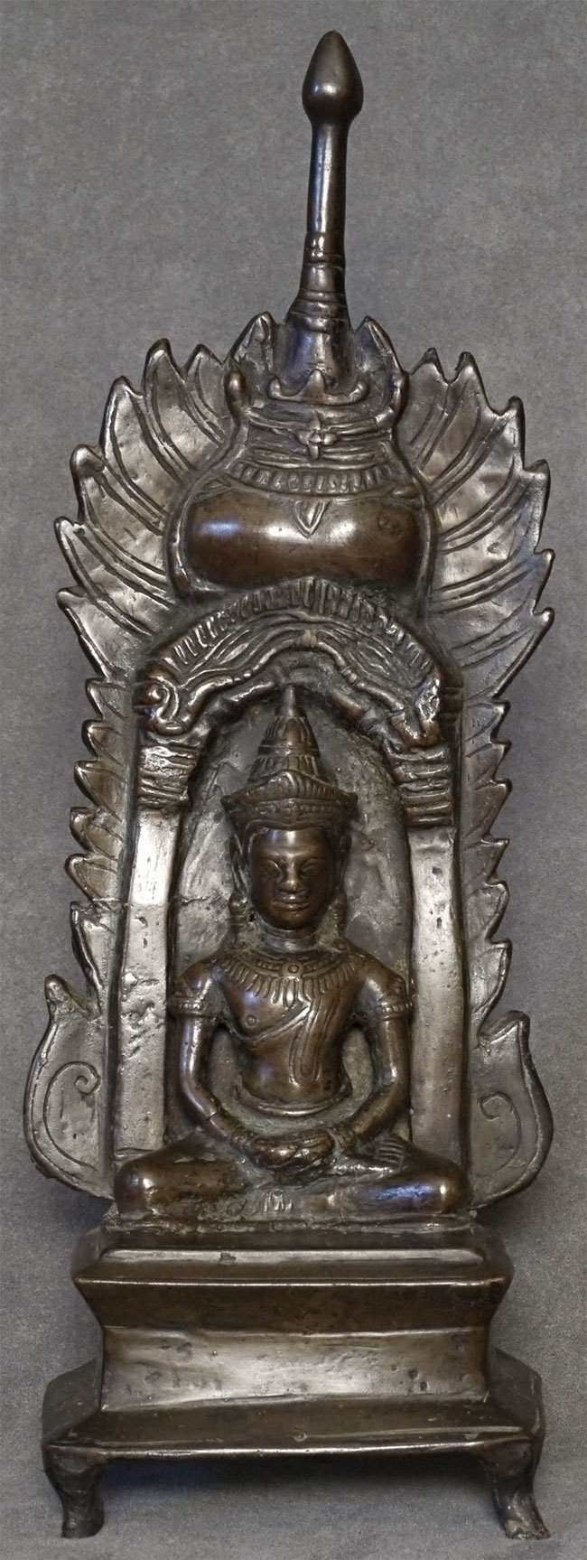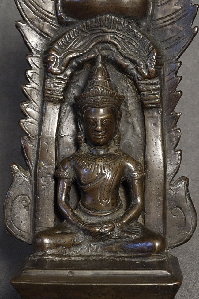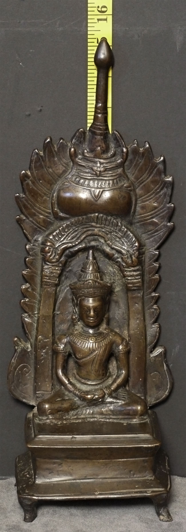 17/18thC Cambodian bronze Buddha. Unusual style. Good size at 15 inches to the tip of the top.