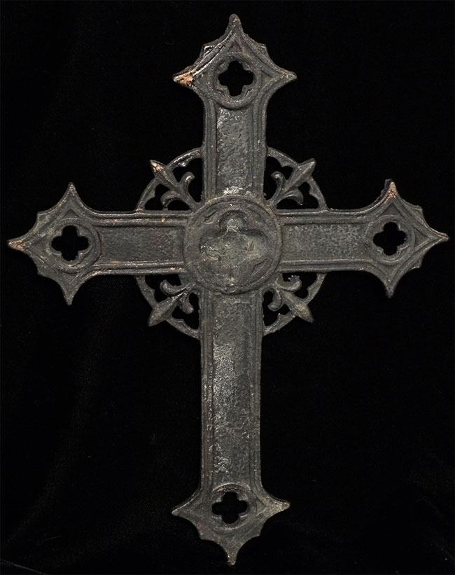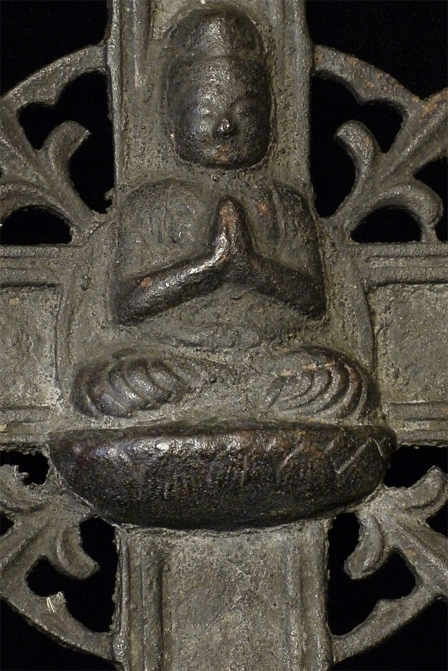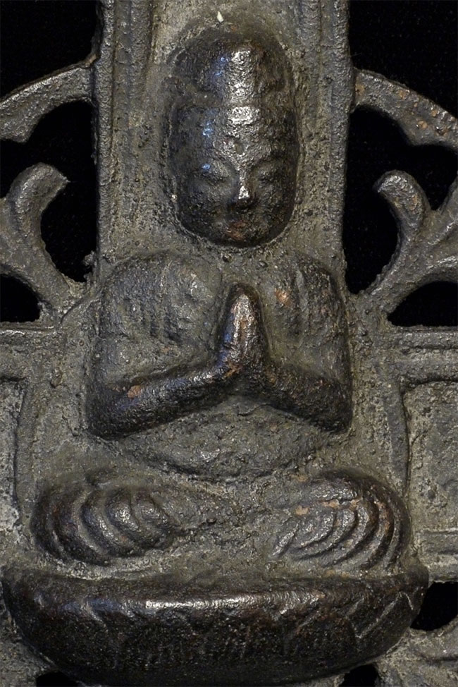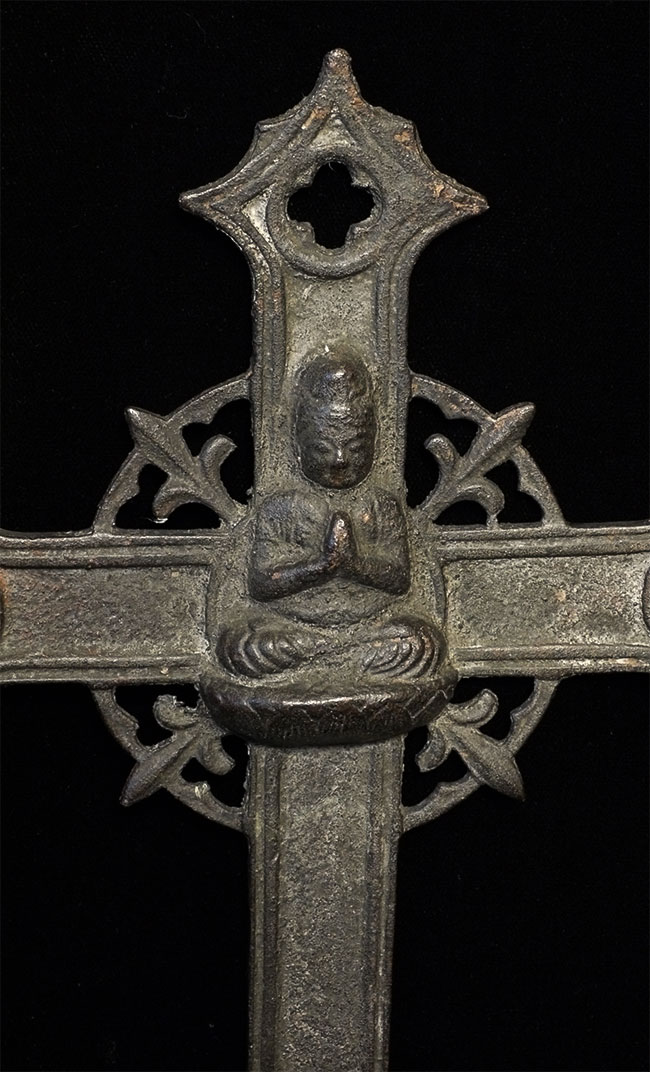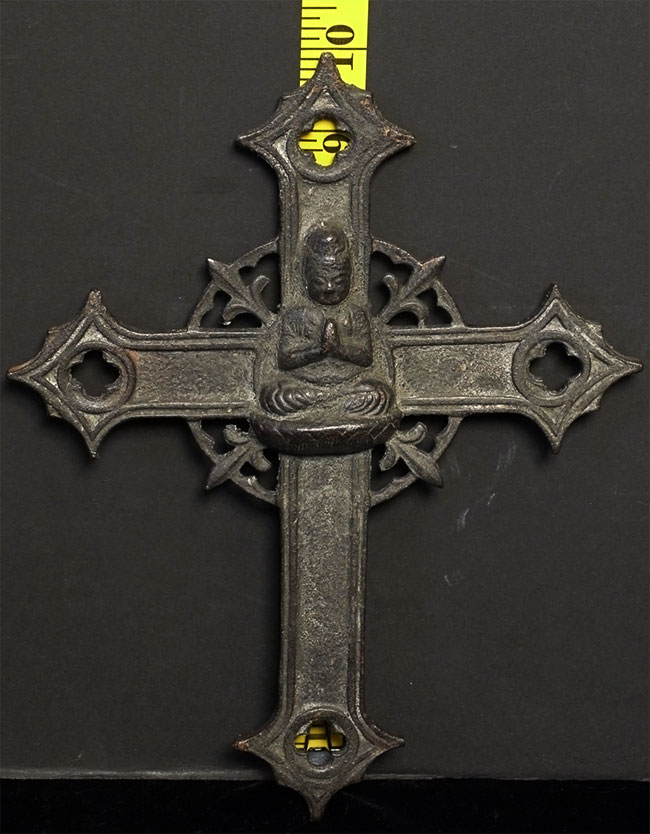 Very rare 16/17thC Japanese Iron Cross with Buddha. I've owned 3 other iron examples of this over the past 30 years, and seen one other at auction. I've also owned 2 bronze (or other alloy- a magnet does not stick) examples, one of which is still available on my site. I've been told they were used by early Japanese Christians, as they were persecuted by the Shoguns, and wanted to show that they still respected the Buddha. This particular example is from the estate of a former US soldier stationed in the 1940's in Occupied Japan. Stands a little over 9.75" tall by 7.75" wide, and is approximately .5" at it's deepest point. This is a fine example of its type.