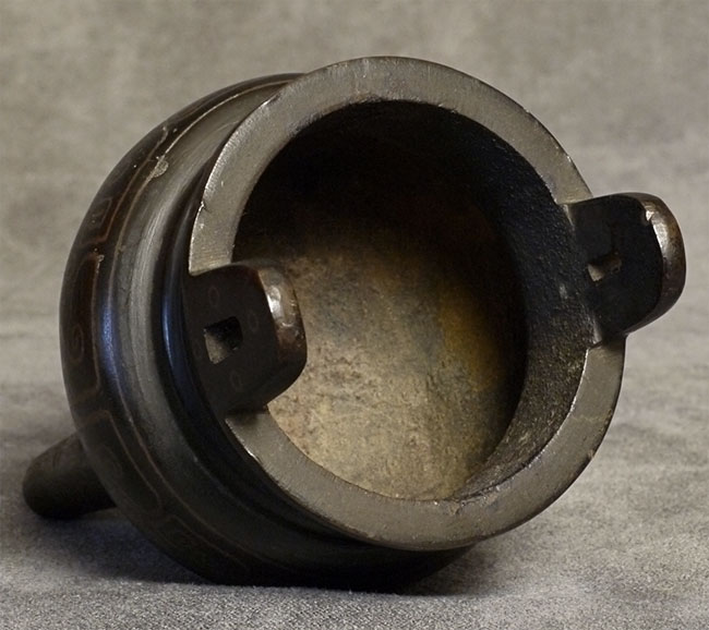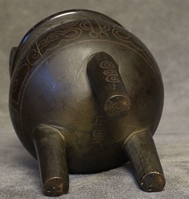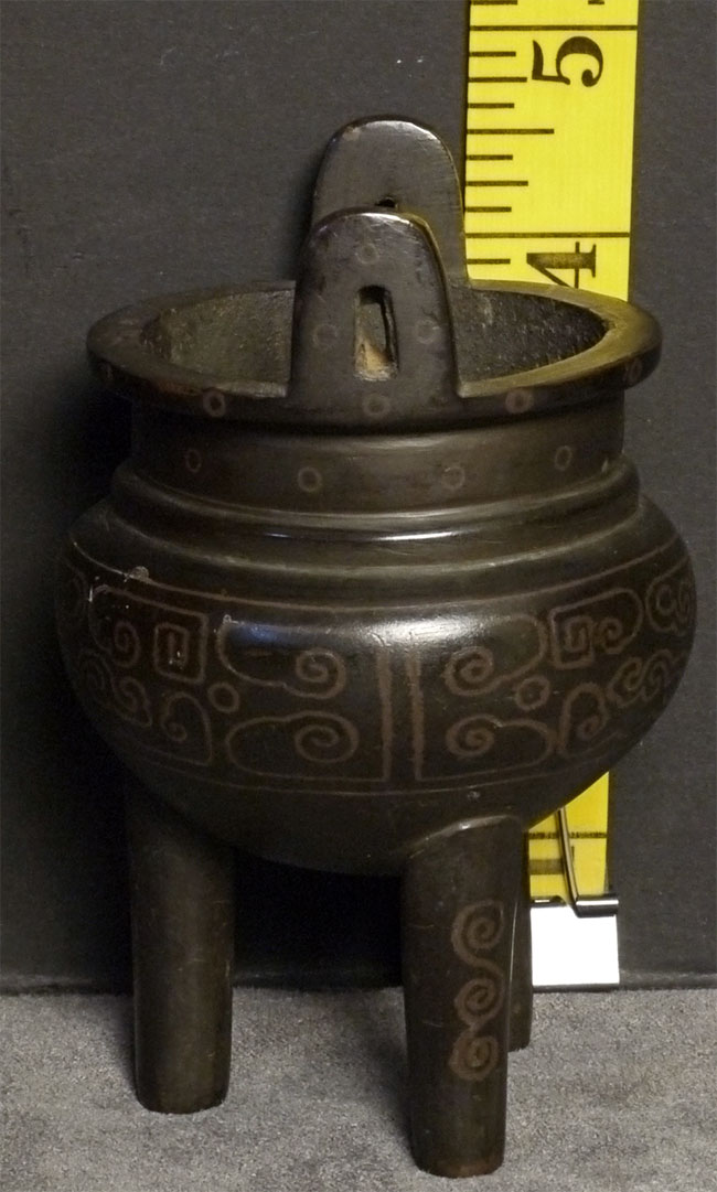 Old bronze Chinese censor with silver inlay. Four and a half inches to the highest point.