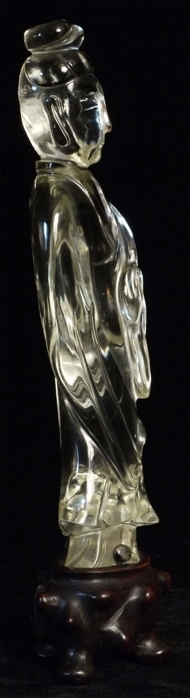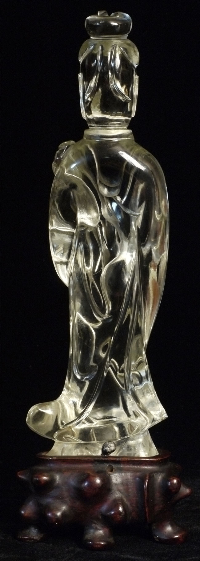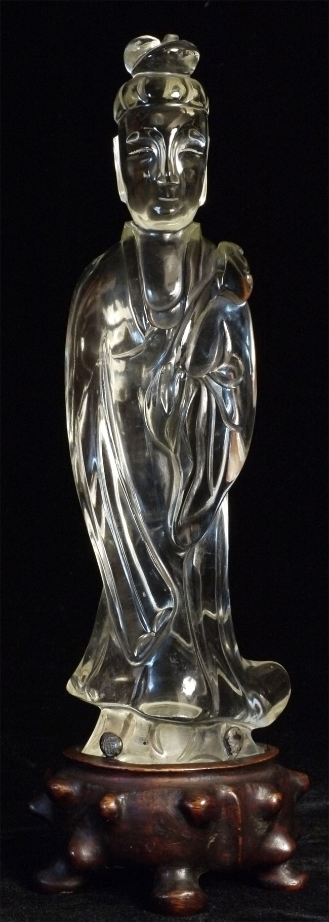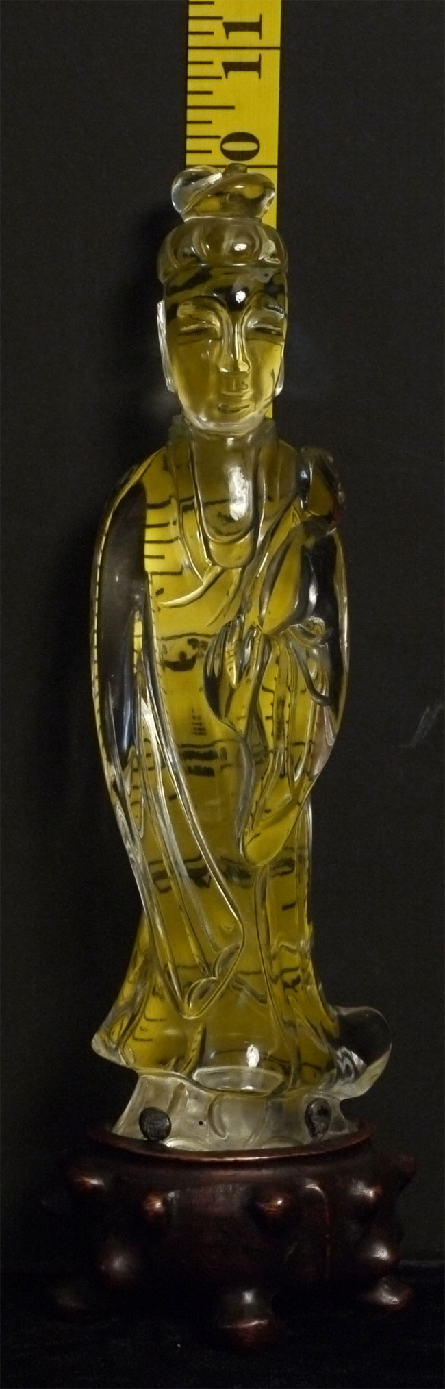 18thC/earlier Chinese Crystal Quanyin. Finely carved, with a beautiful face. I am dating it to t18thC or earlier, but my instincts tell me it is likely earlier-possibly by several hundred years. The base is custom-made and is attached through the interesting use of a system that uses flattened lead pellets. The actual crystal figure is 8.5 inches tall, on the attached base the total height is 10.25 inches. A few small inclusions can be found, but overall this is a clear piece of quartz, with a slightly yellow hue. No repair or significant damage- some tiny chipping as seen in the photos.