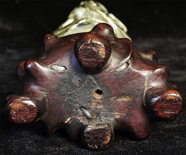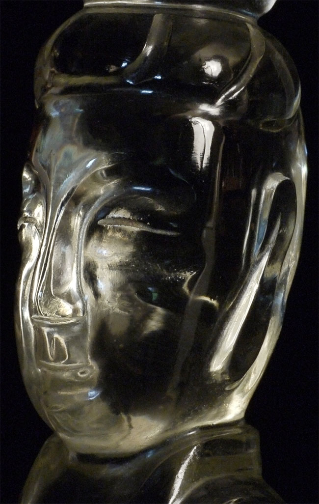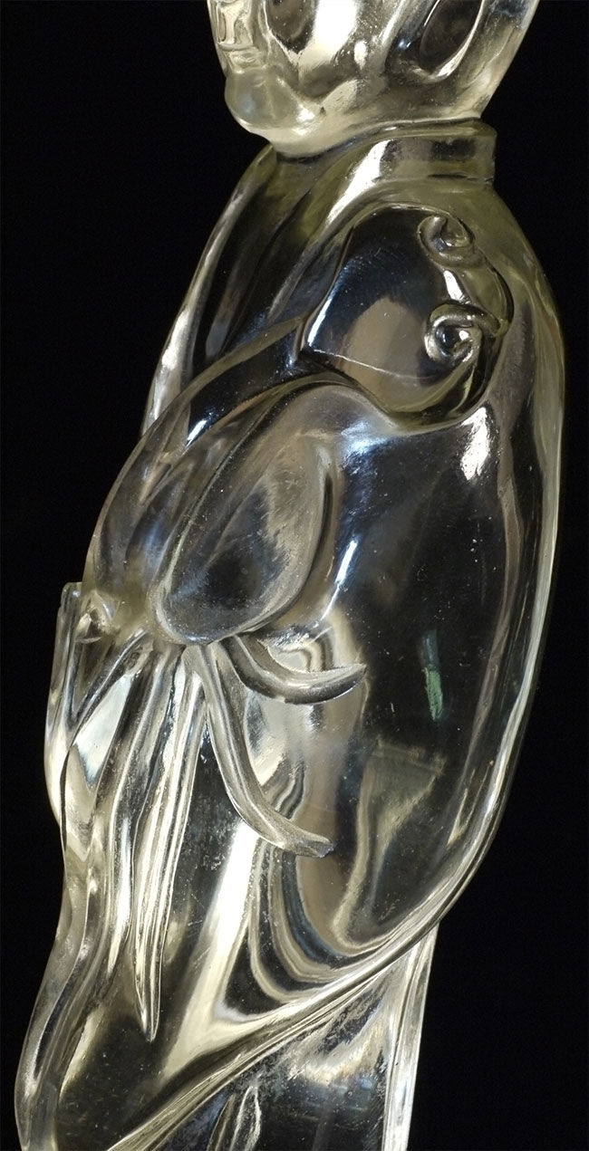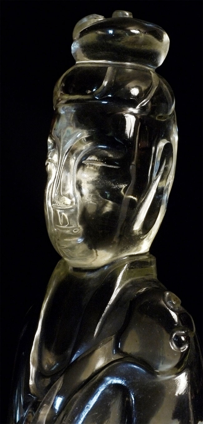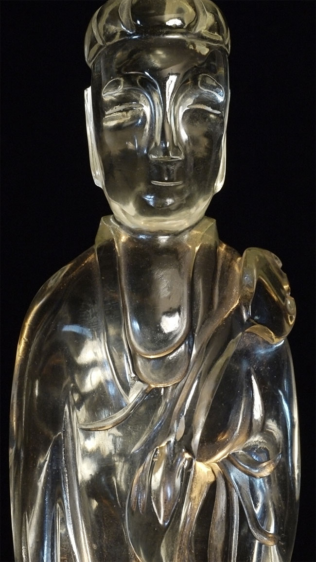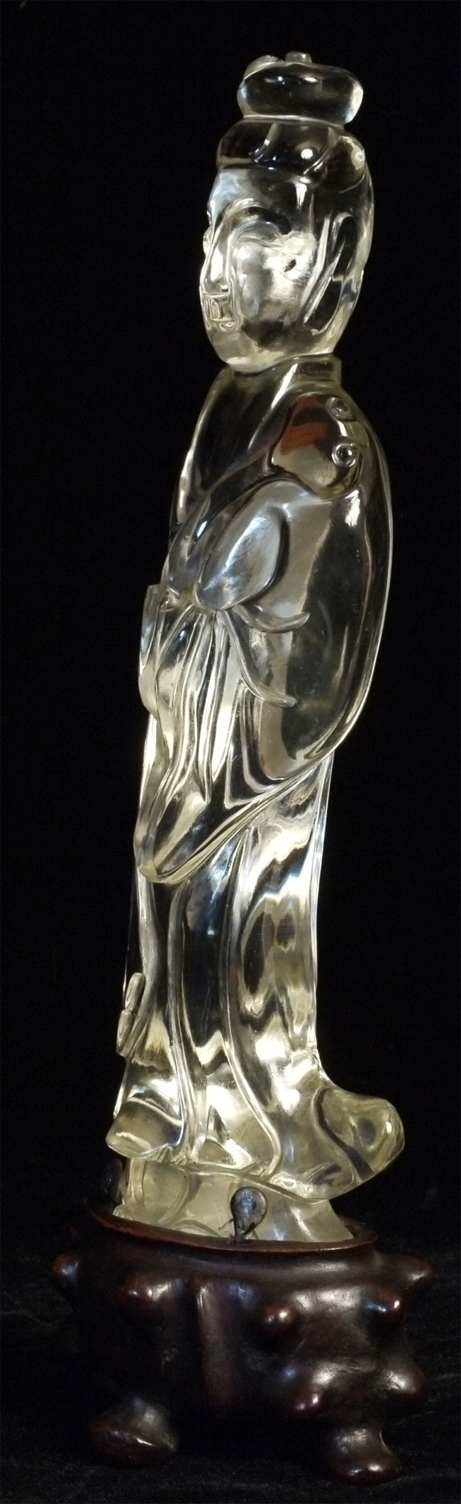 18thC/earlier Chinese Crystal Quanyin. Finely carved, with a beautiful face. I am dating it to t18thC or earlier, but my instincts tell me it is likely earlier-possibly by several hundred years. The base is custom-made and is attached through the interesting use of a system that uses flattened lead pellets. The actual crystal figure is 8.5 inches tall, on the attached base the total height is 10.25 inches. A few small inclusions can be found, but overall this is a clear piece of quartz, with a slightly yellow hue. No repair or significant damage- some tiny chipping as seen in the photos.