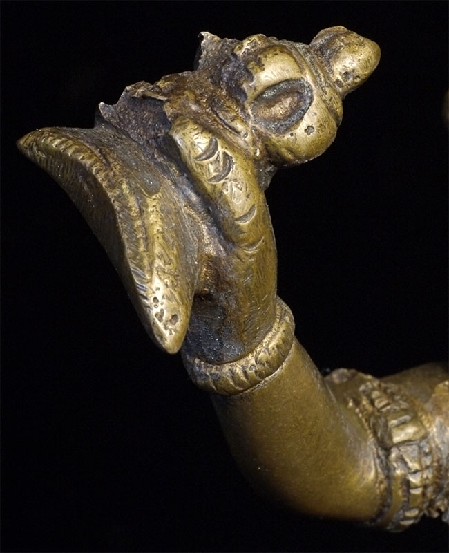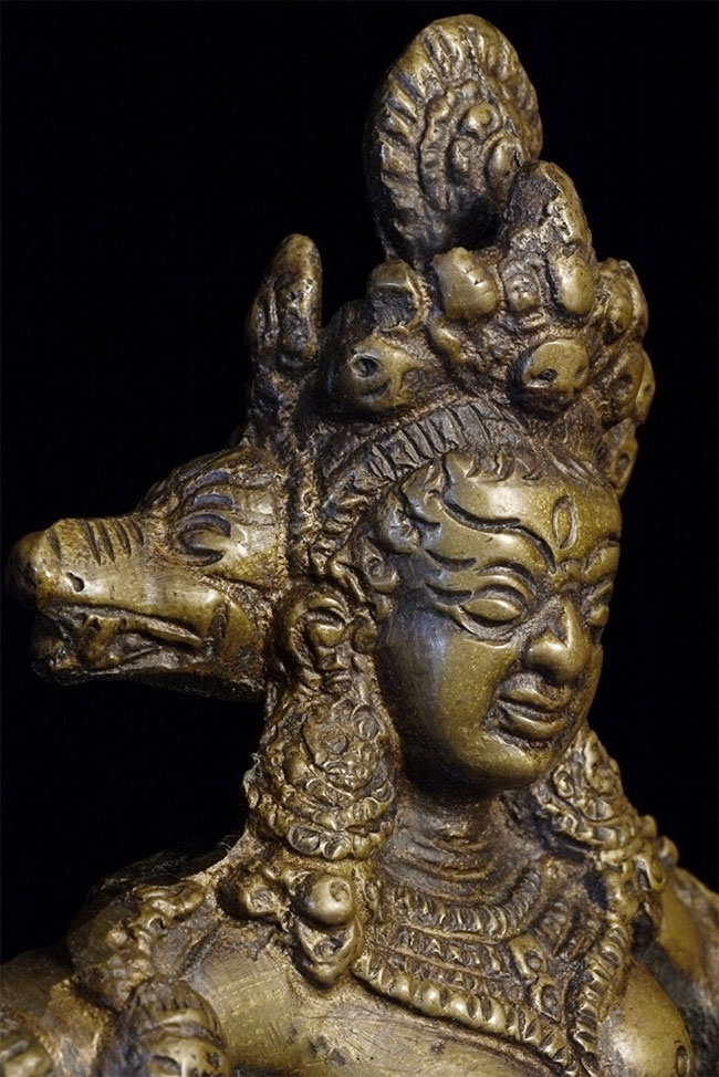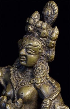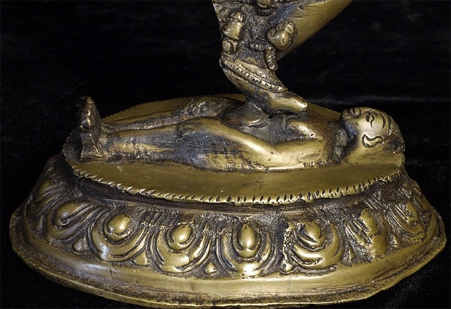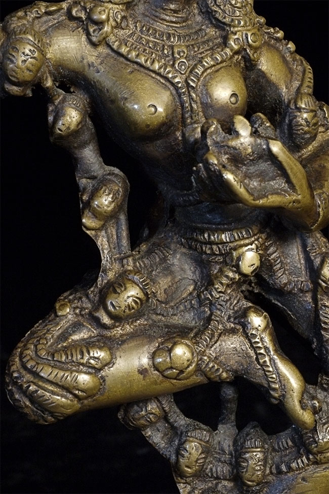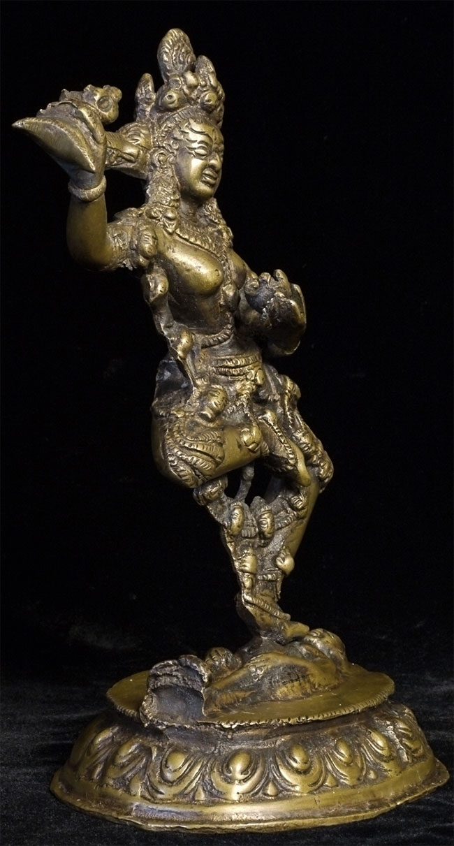 Old Nepalese or Tibetan tantric female deity. Very heavy. Stands 8 7/8 inches tall, bottom of base measures approximately 4.5 x 5.5 inches.