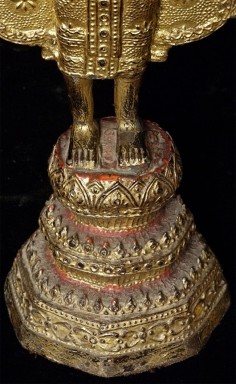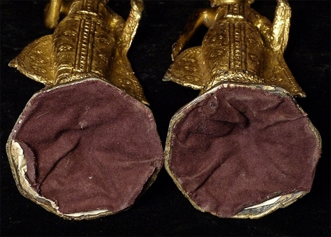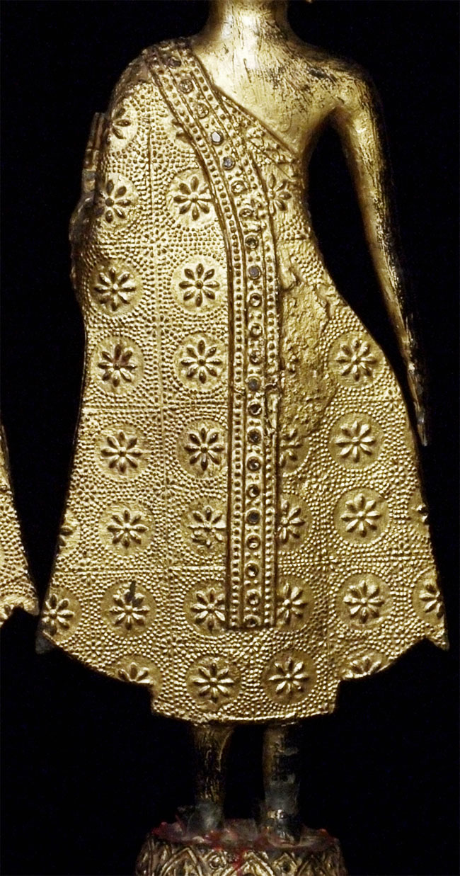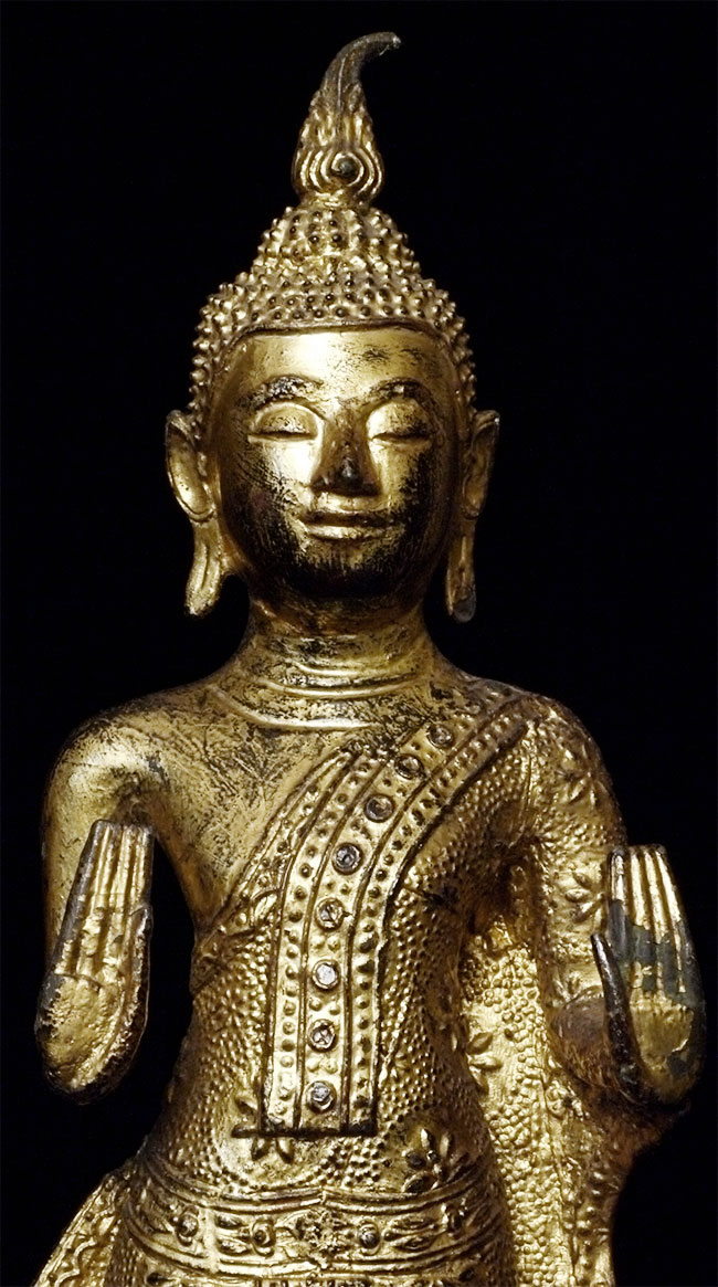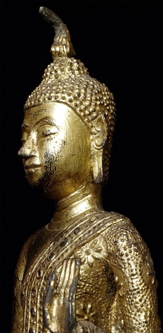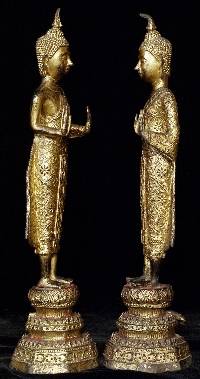 Matched set of circa 1900 Rattanakosin style Thai standing bronze Thai Buddhas, each with a different mudras. Taller stands 13 inches tall. Both have bent finials, otherwise excellent conditional with most of original lacquer and gilding intact.