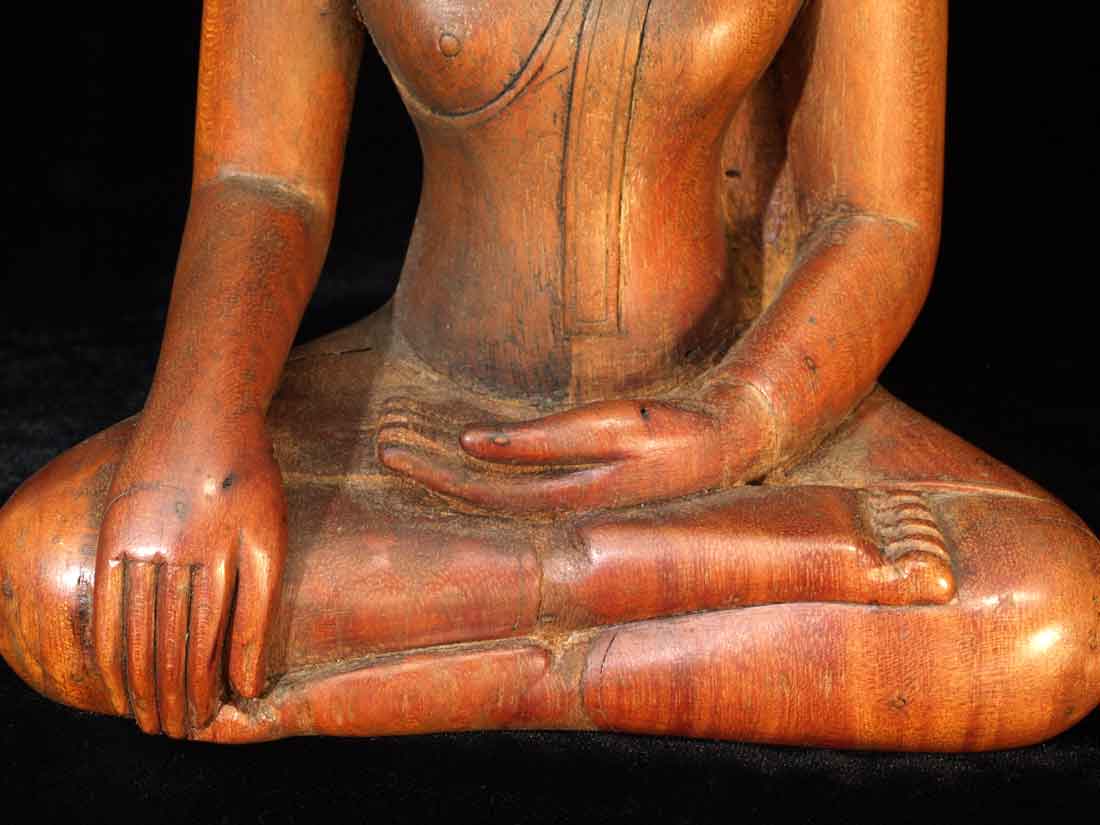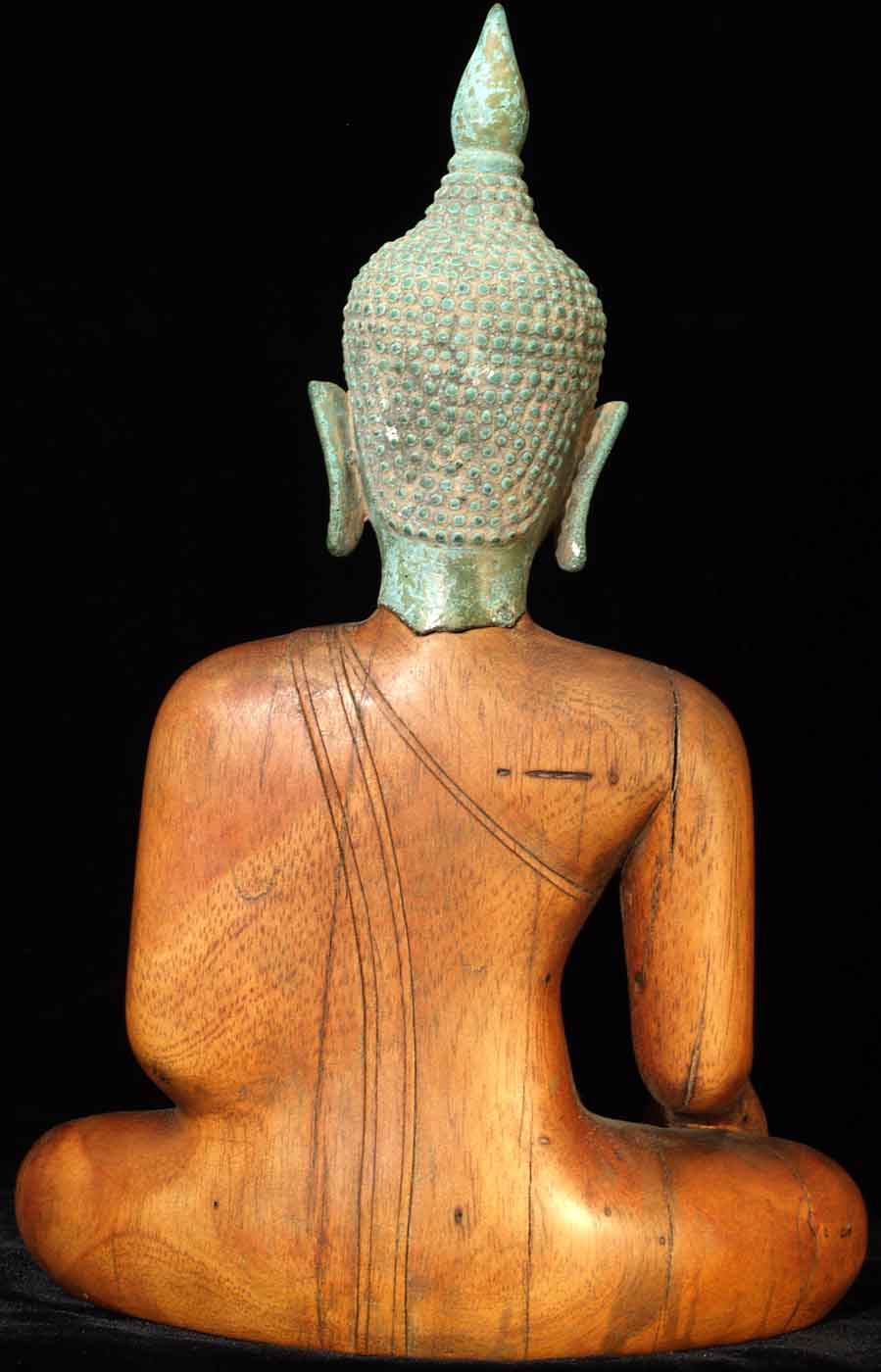 This is a high quality early 15th century Northern Thai bronze Buddha head attached to a masterfully carved vintage Buddha body. As you can see, the marriage is completely successful. There are a few old nicks in both the head and the body. I’m not sure why, But I’ve never seen anyone else ever do this in this way before. The actual head is close to 5” by itself. The total dimensions including the body are 10 1/2" X 7 1/2". If it were in it’s original form, sitting on a base this Buddha would have sa