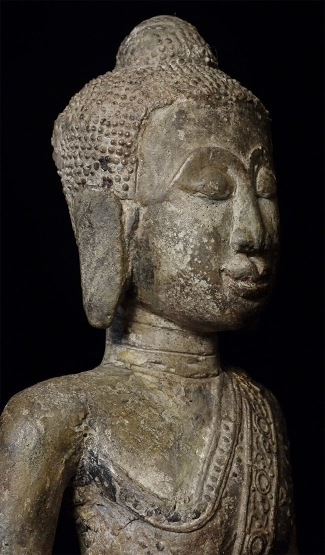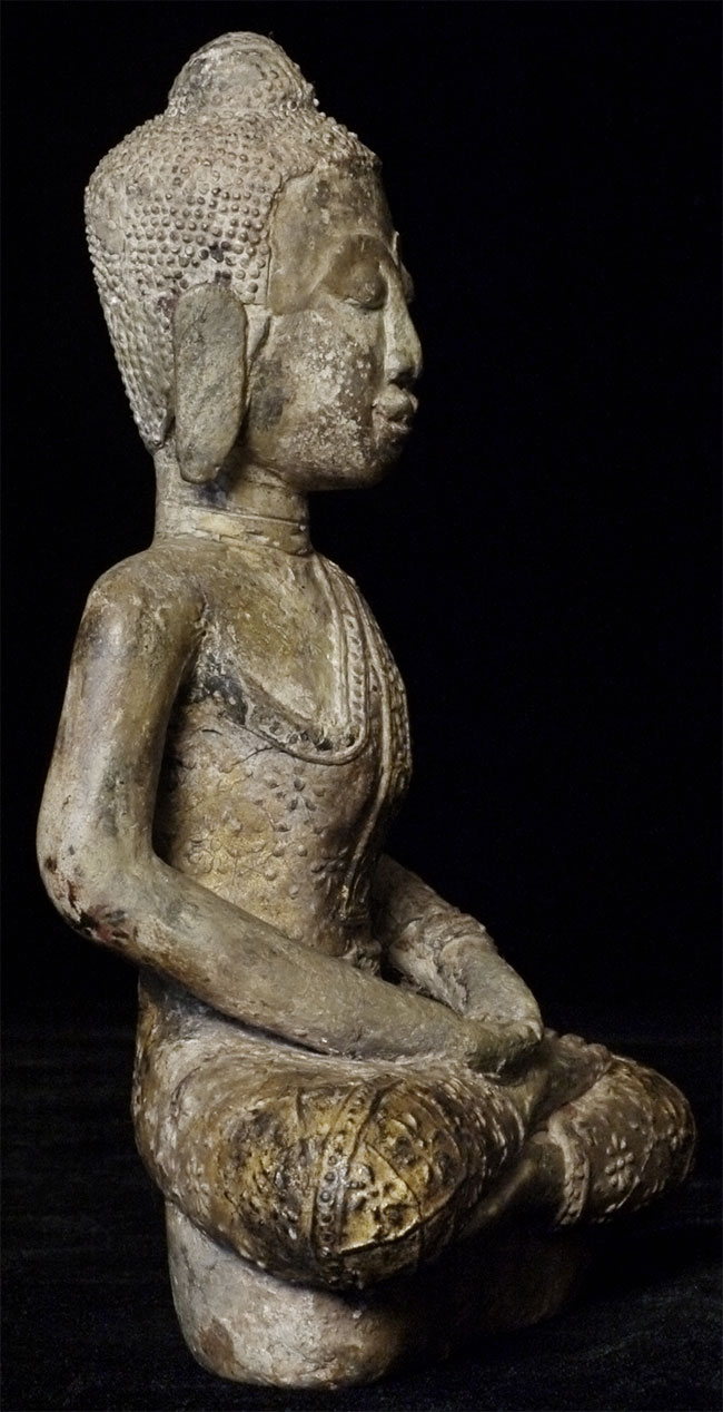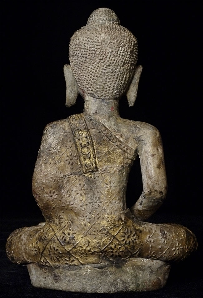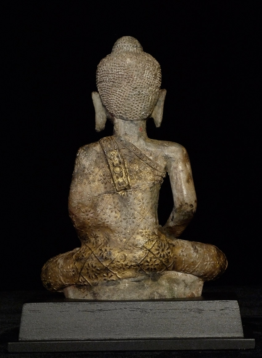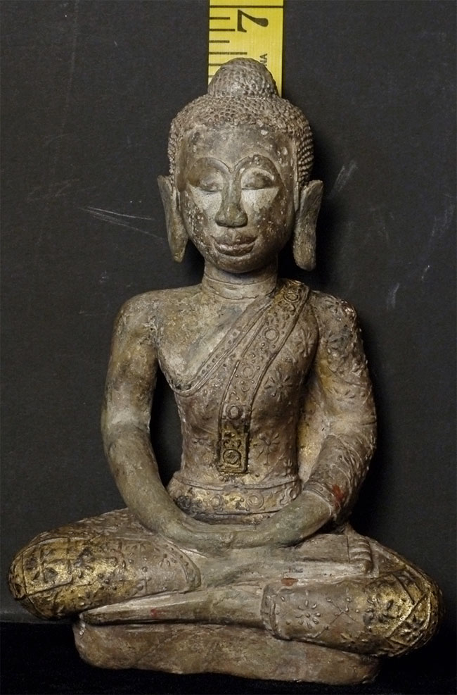 Remarkable CLAY example of a typical early Rattanakisin form typically found in bronze and sometimes in wood. This one a one of a kind. Sits 6.25 inches tall, 7 inches on custom stand.