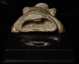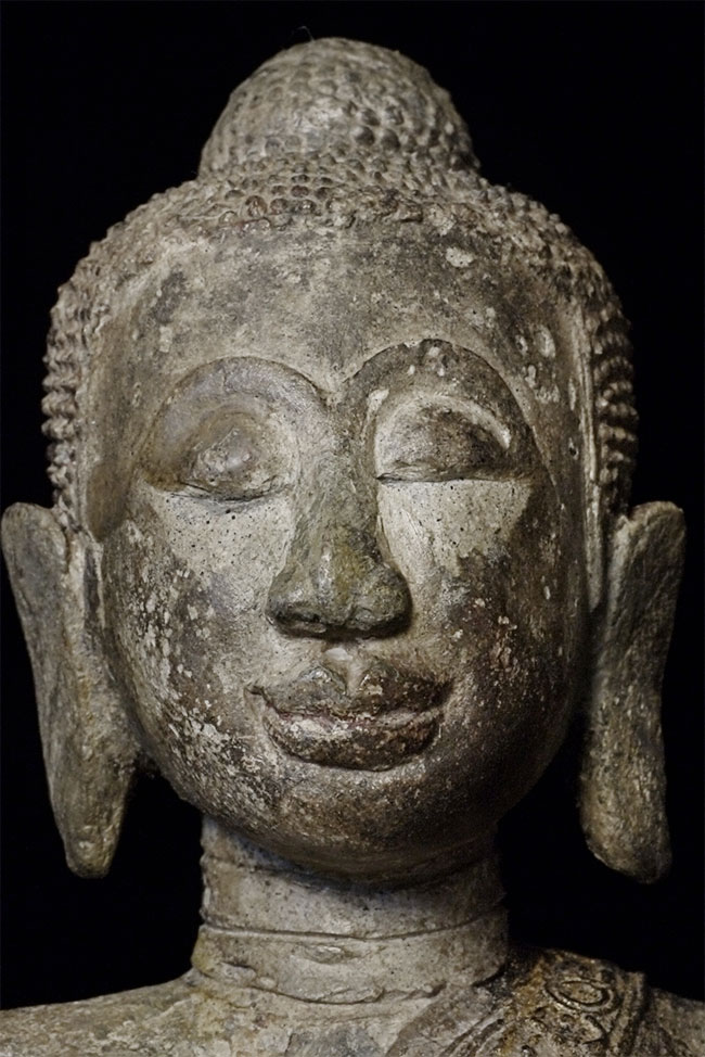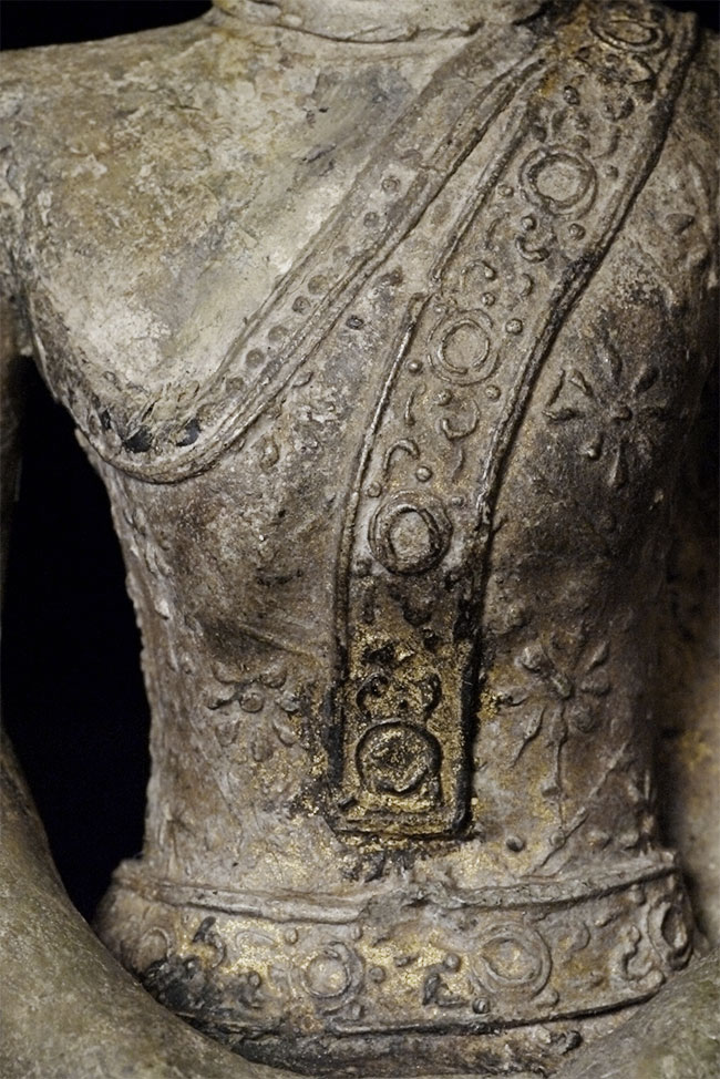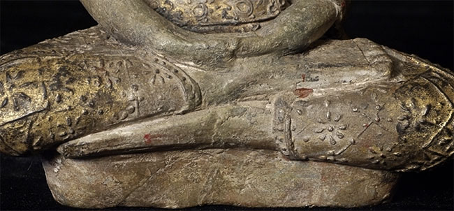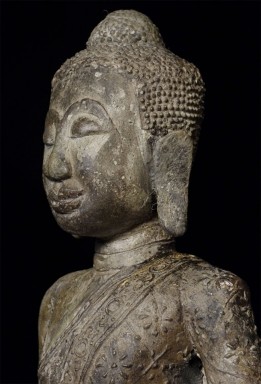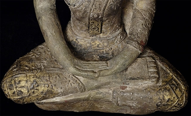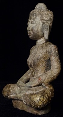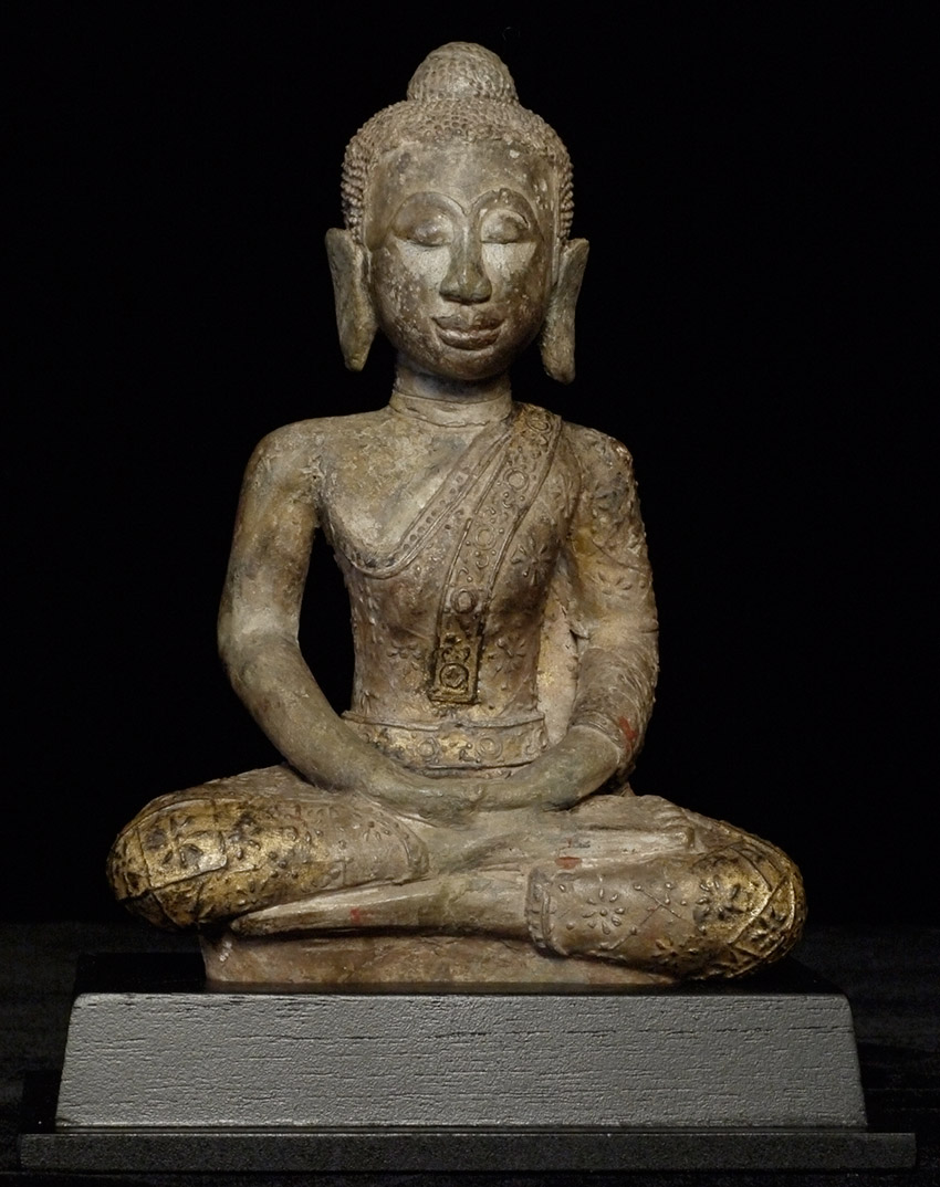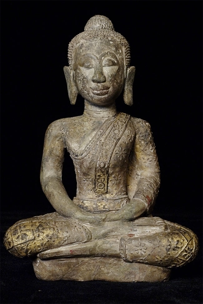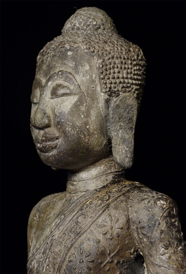 Remarkable CLAY example of a typical early Rattanakisin form typically found in bronze and sometimes in wood. This one a one of a kind. Sits 6.25 inches tall, 7 inches on custom stand.