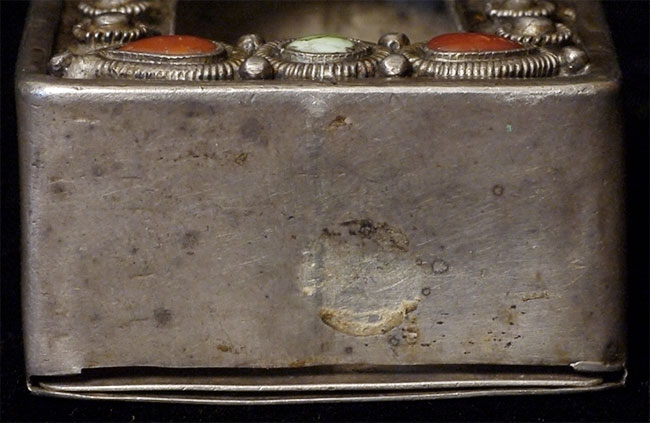 Fine antique silver Tibetan Gau box. Stands 2.25 inches tall, 1.5 inches wide, .75 inches deep.