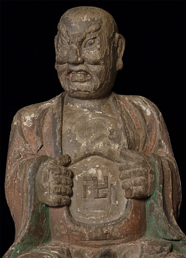 This is a fierce protective monk, not the Buddha. He was traditionally found as part of a group of 18 different monks. This was the fiercest of them all- literally tearing open his own chest to show the reverse swastika- an ancient symbol of the Buddhist Darma.