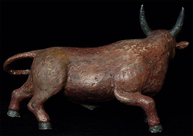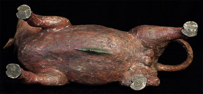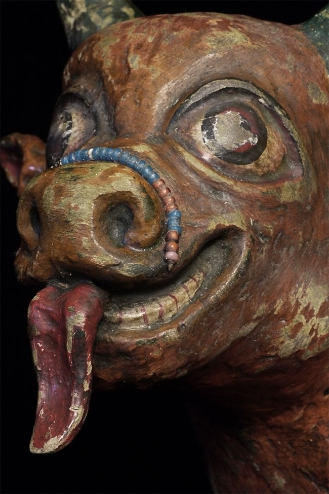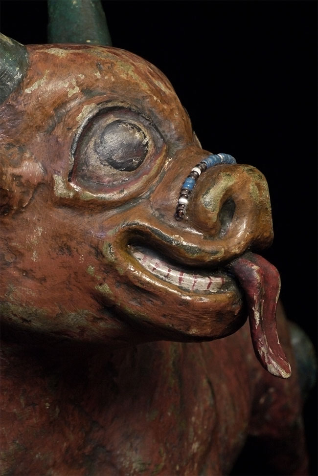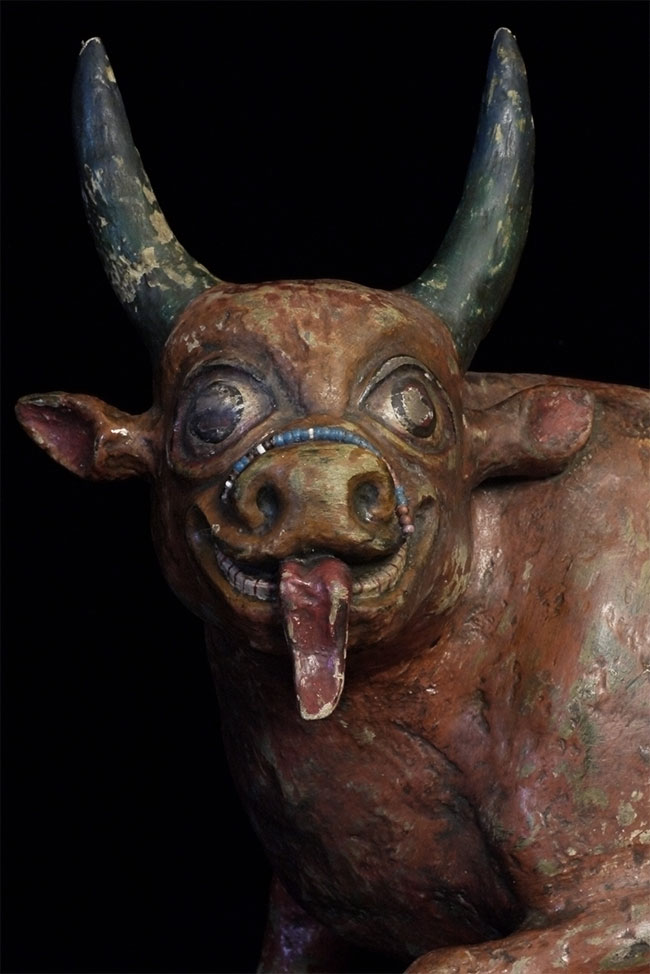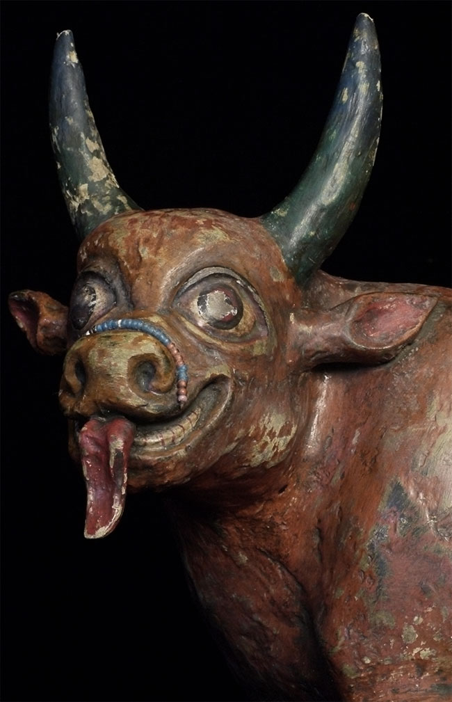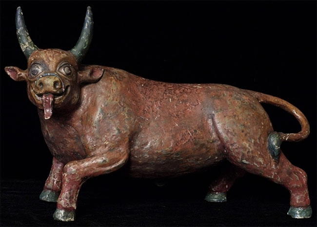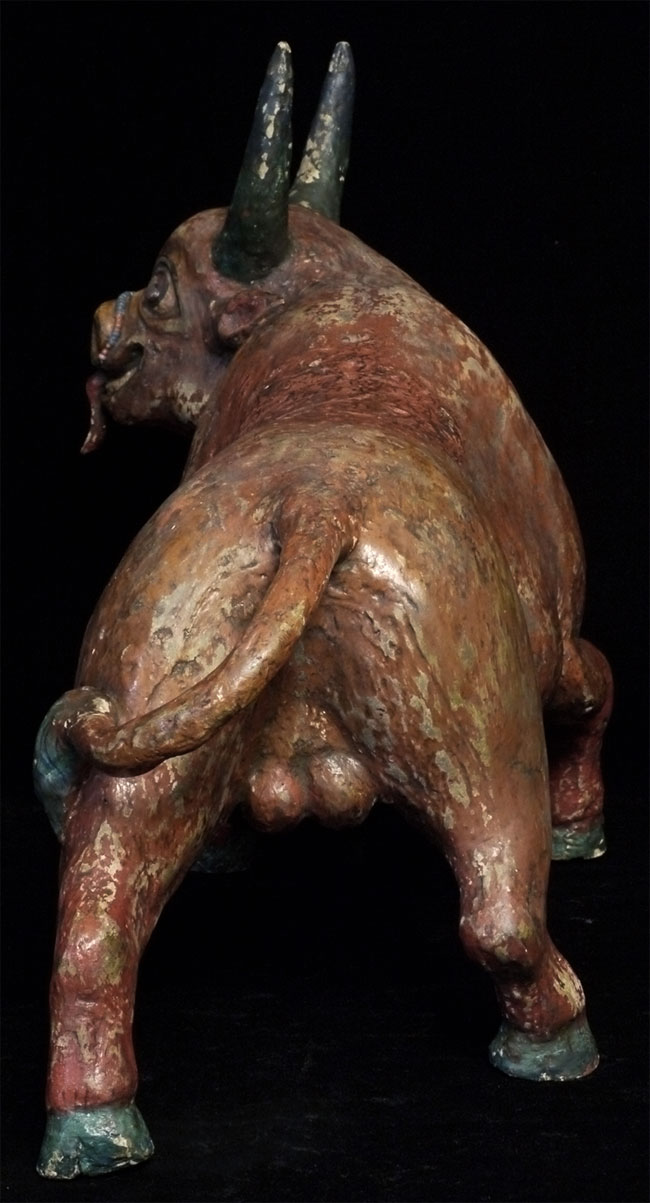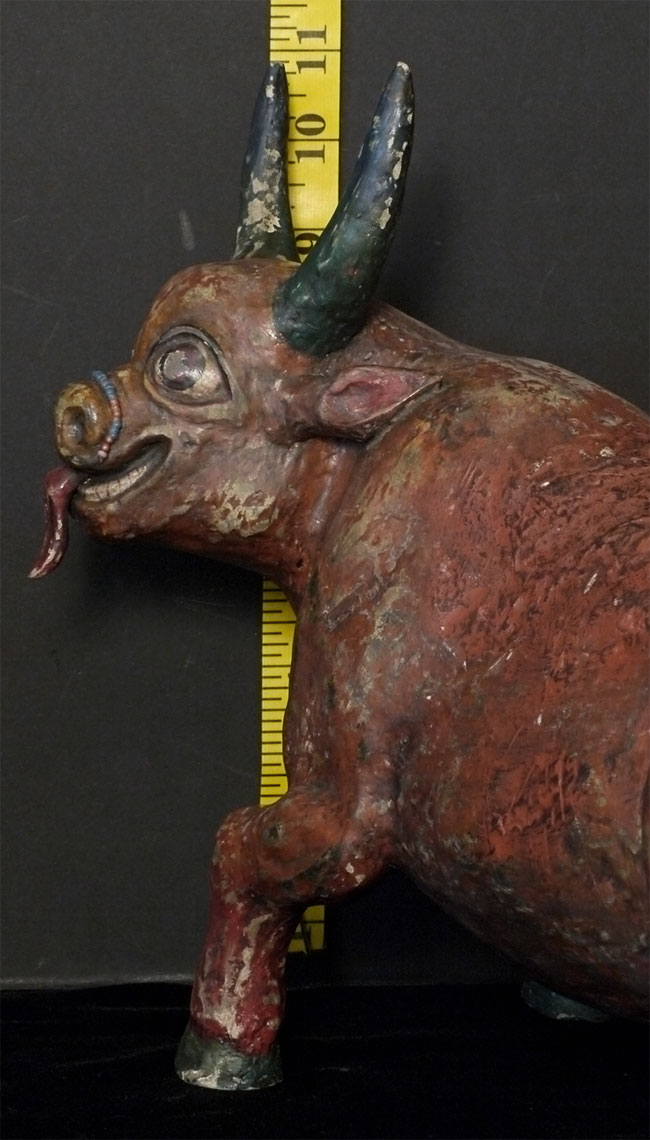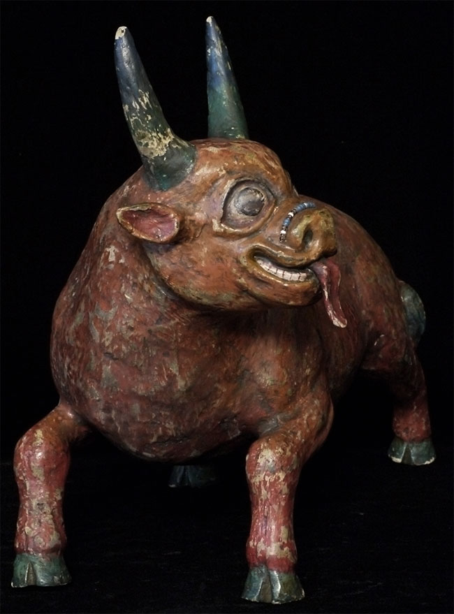Temple-size antique paper mache bull made for a Mongolian Buddhist altar. Purchased out of Mongolia in the 1990's shortly after they opened to the west. Outstanding condition--remarkably, absolutely complete, and original. Rare object, especially given the fragile nature of the material. Remarkable that it has survived so long in this condition, as even many of the antique copper and bronze statues and other ritual objects from Mongolia show signs of either Soviet invasion or harsh nomadic lifestyle. Looks to be 19thC, though I have no idea how to date. Measures 10 7/8 inches tall, a full 18 inches long, and 6 inches wide. Possible old repair to one horn and possible other early repairs that are not apparent, as this is often the case with large antique paper mache pieces. Please examine photos, as it is being sold "as is". Will be double boxed in oversize boxes. I've seen two others over the past thirty years; one was nearly as nice as this one. I doubt there are many out there anywhere that are better. Not inexpensive.