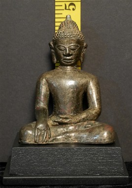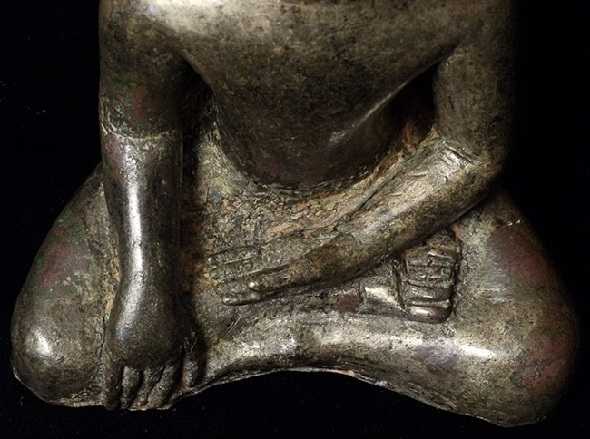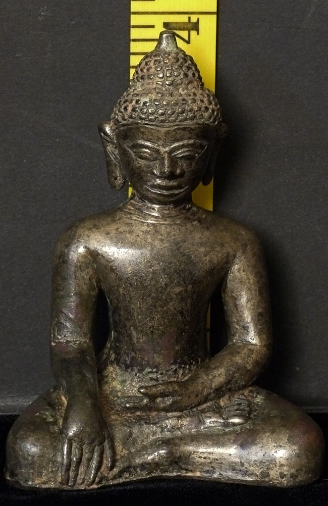 EARLY Arakan Burmese Buddha. Appears to be a high silver content alloy. I've seen this type attributed as early as 6-8thC, but I am unsure how to date for sure beyond saying this is a minimum of 700 years old and probably much older. Very rare. Probably originally had an elaborate separately cast open work base. Best of its kind. 3 7/8" tall. Height on custom stand is 4 5/8 inches.