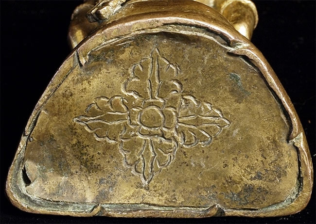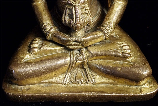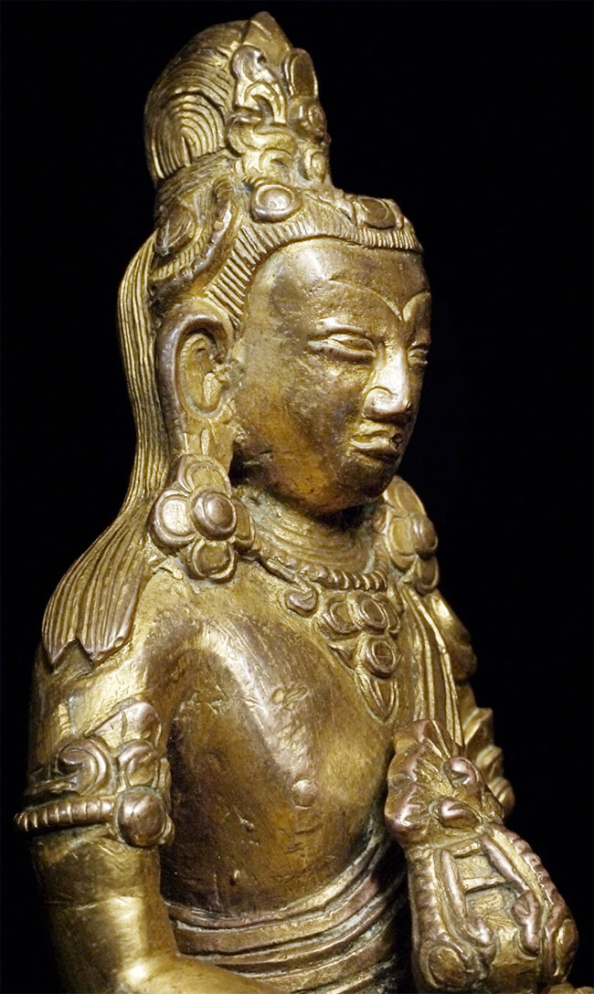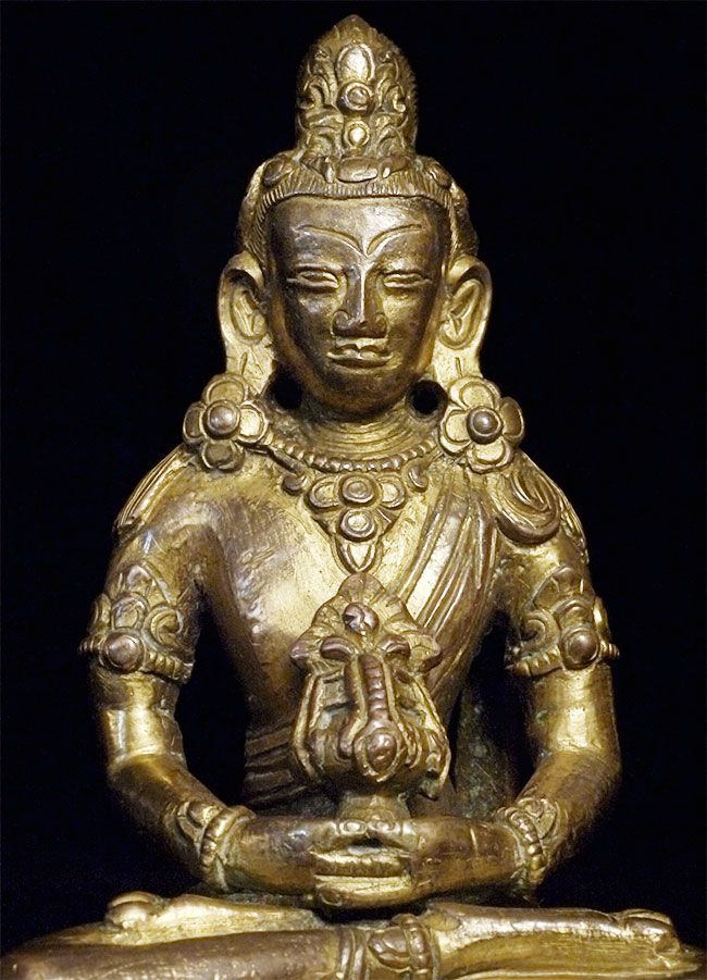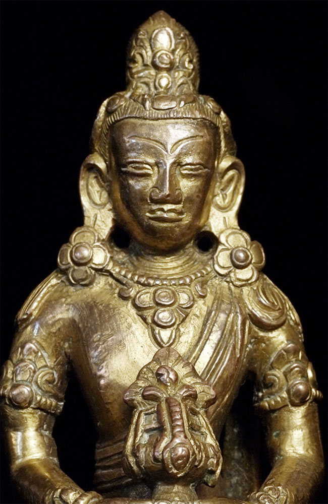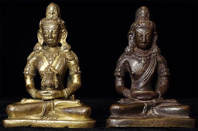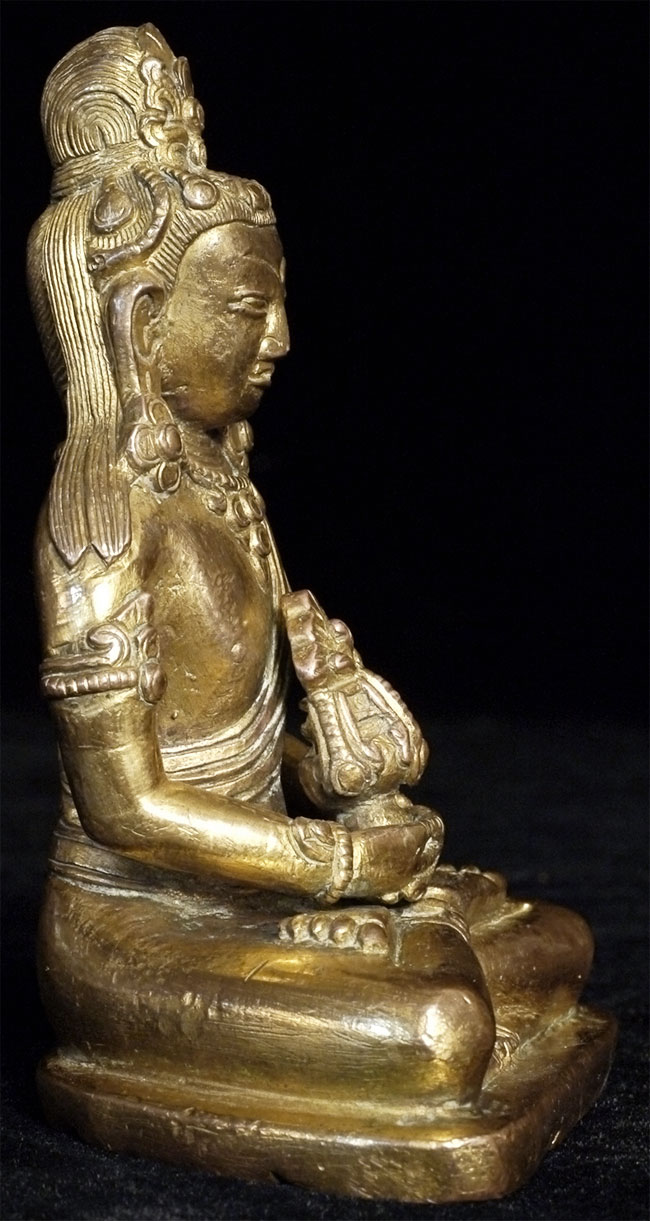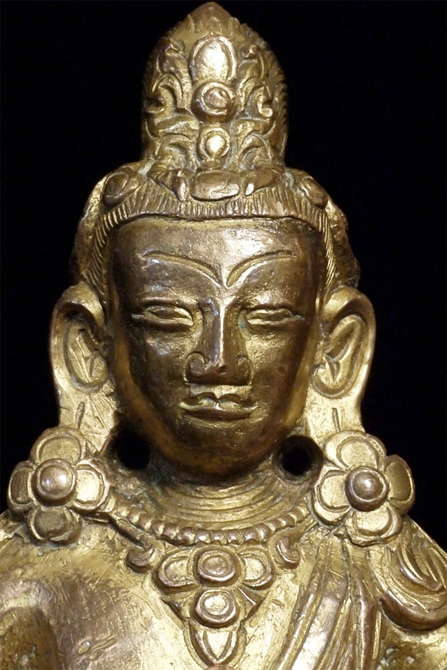 Late 18thC Gilded Tibetan or Nepalese Copper Buddha. Retains original bowl. consecration plate, and much of its gilding. Really good face. Sits 3 5/8 inches tall, which is typical for this type. Last photo in the series shows a similar piece without its bowl or much of its gilding, but still quite nice- #4241