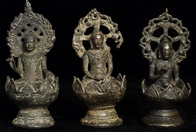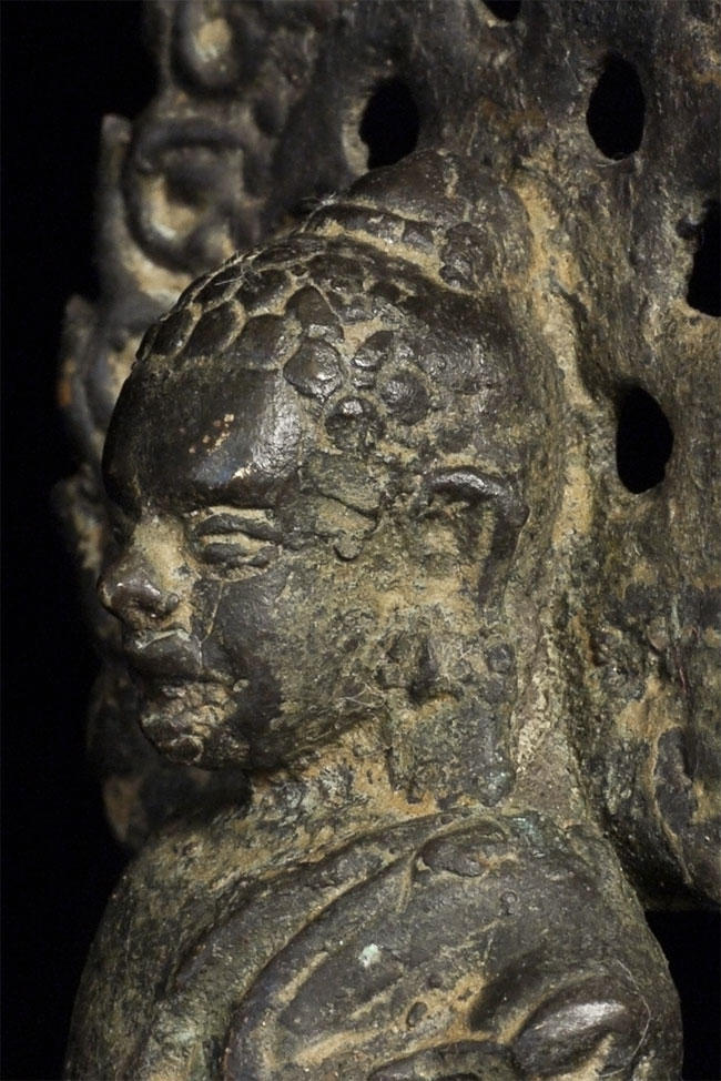 Deeply serene unusual Burmese Buddha-possibly 14-17thC Mon Style- very uncommon type. Sits 5. inches tall. I have seen 3 of this type in 25+ years of searching. The last photo in the series shows 2 similar pieces -- numbers 4668 and 6647.