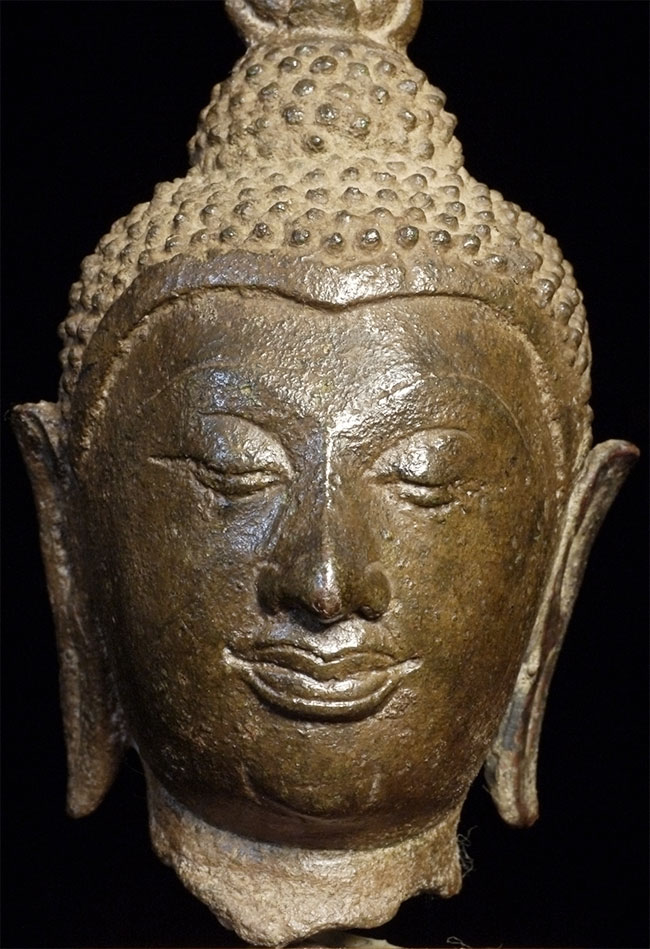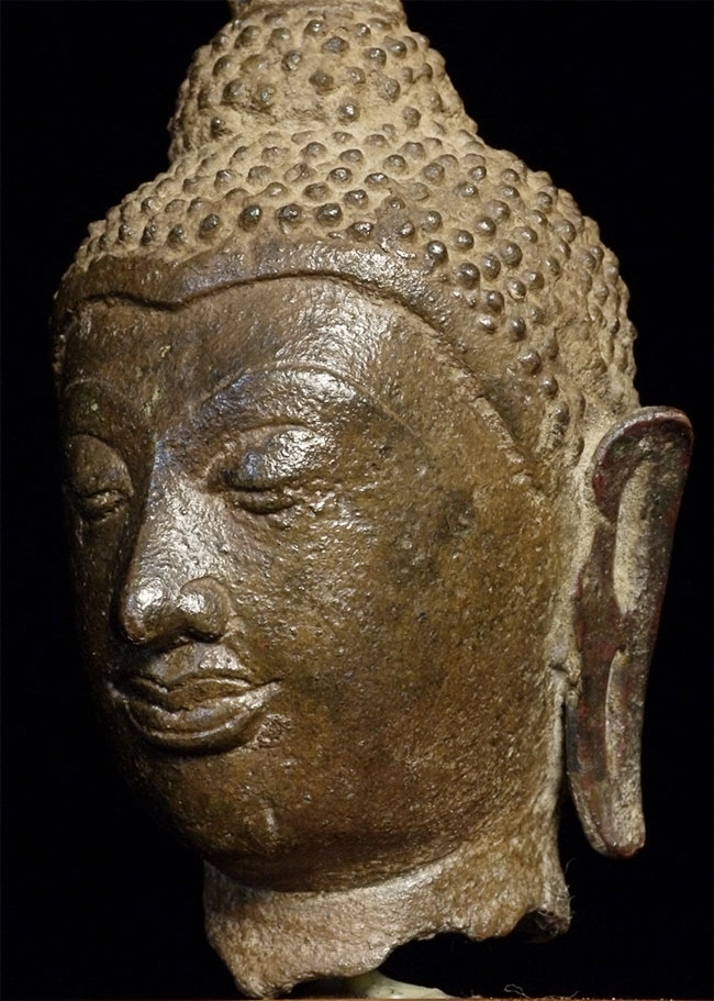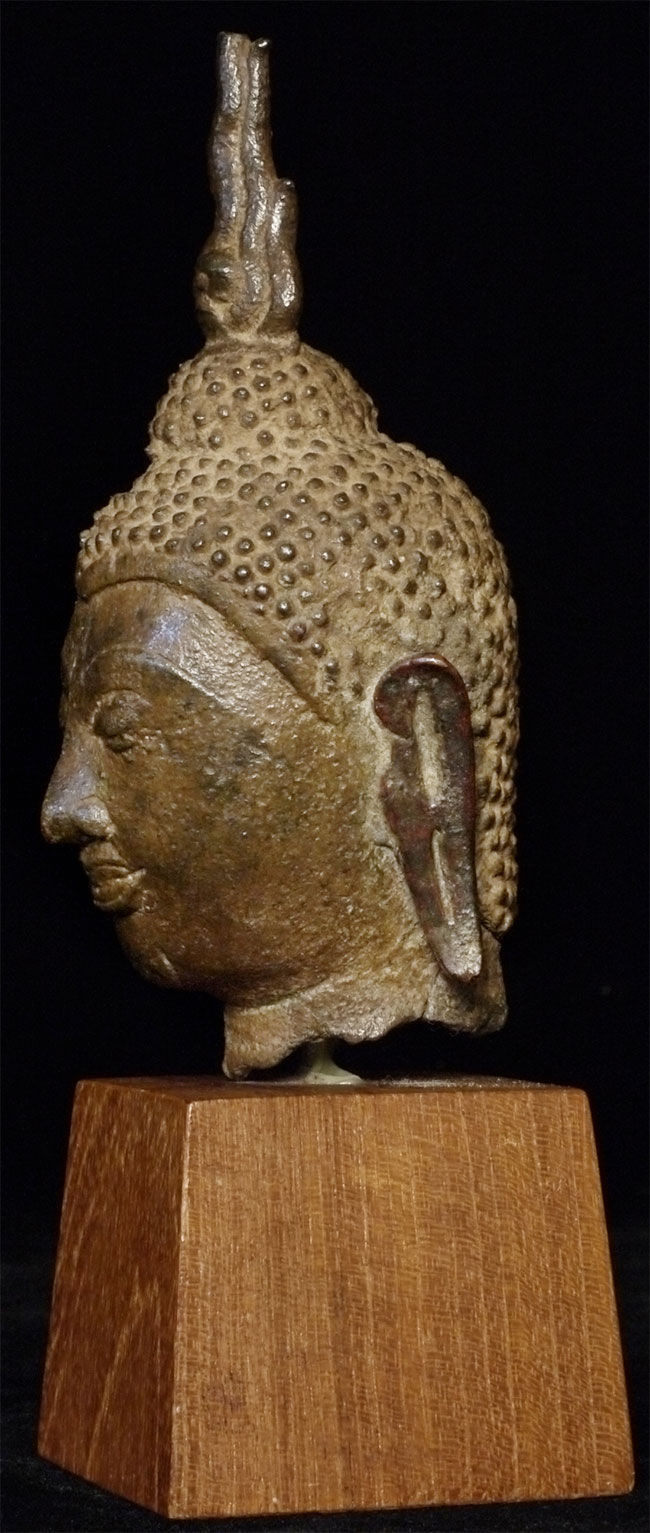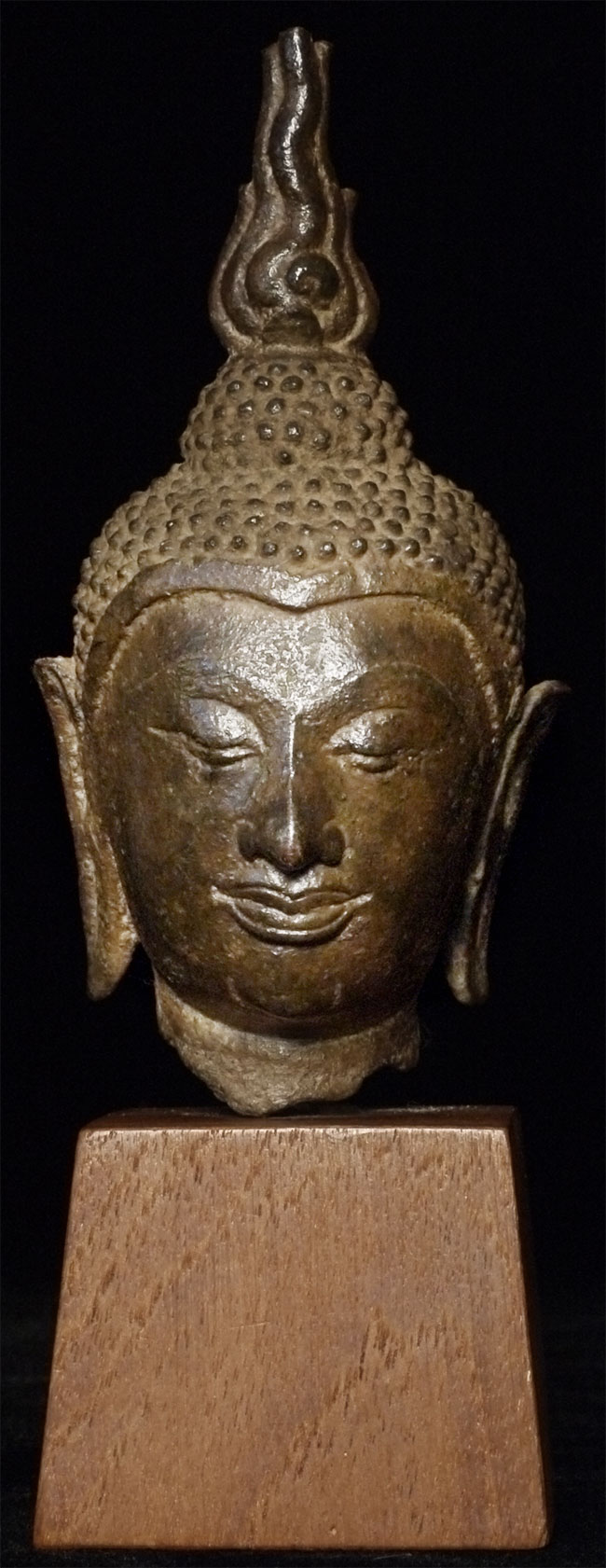 Very fine 15thC Utong "C" Thai Bronze Buddha Head. Utong type can sometimes looks very serious- this pieces shows it at it's very best- filled with compassion, serenity, and happiness. Head alone is almost 5 inches tall, on attached stand the total height is 6.75 inches.