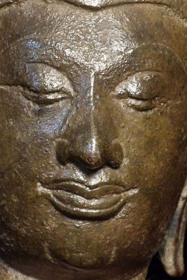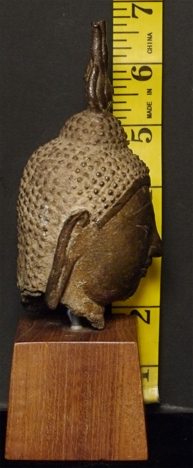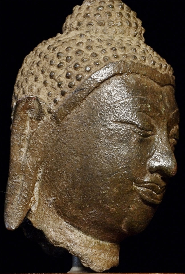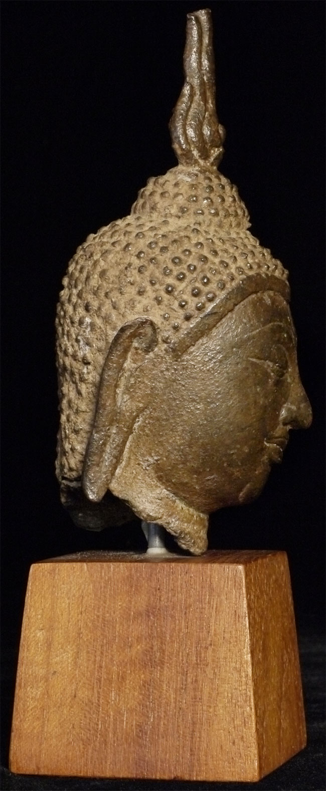 Very fine 15thC Utong "C" Thai Bronze Buddha Head. Utong type can sometimes looks very serious- this pieces shows it at it's very best- filled with compassion, serenity, and happiness. Head alone is almost 5 inches tall, on attached stand the total height is 6.75 inches.