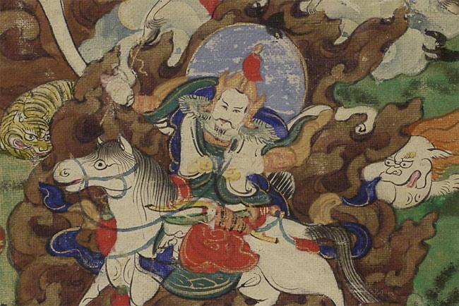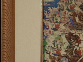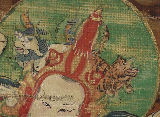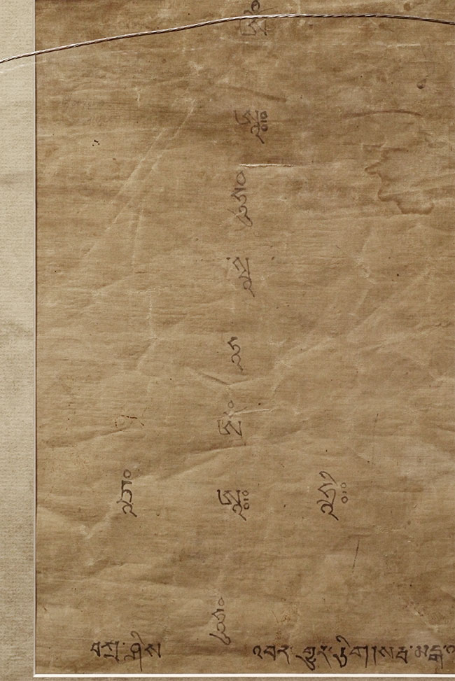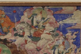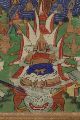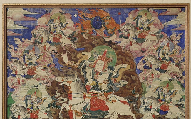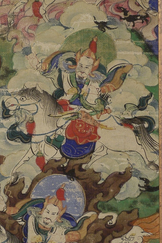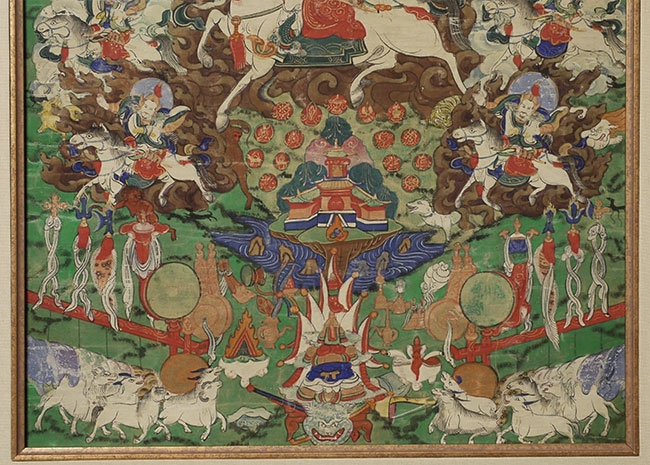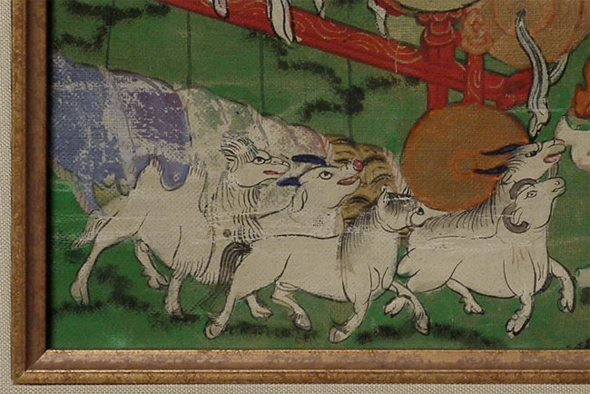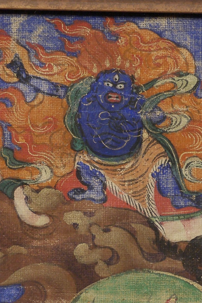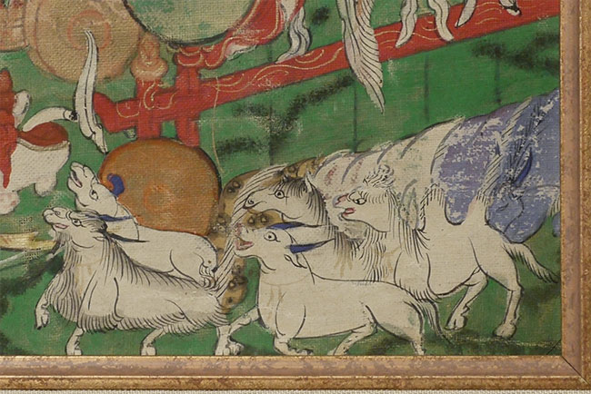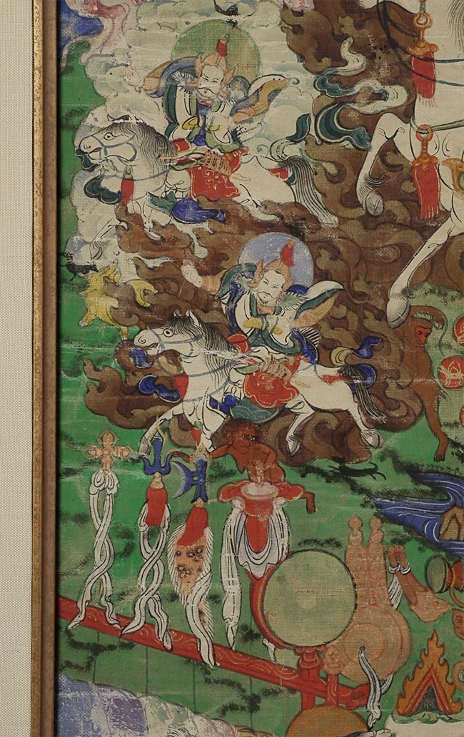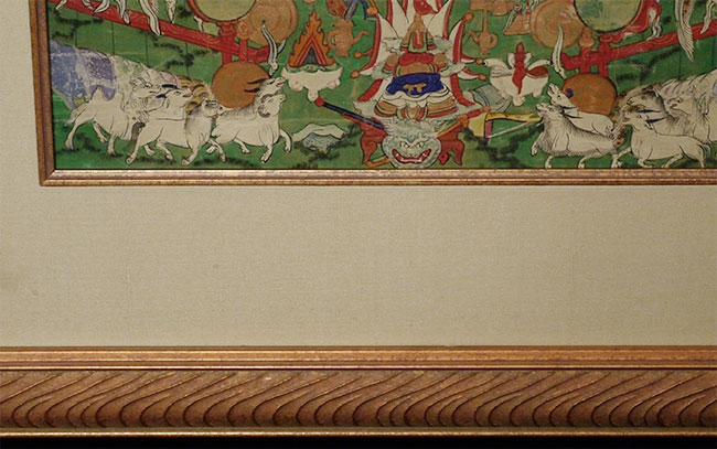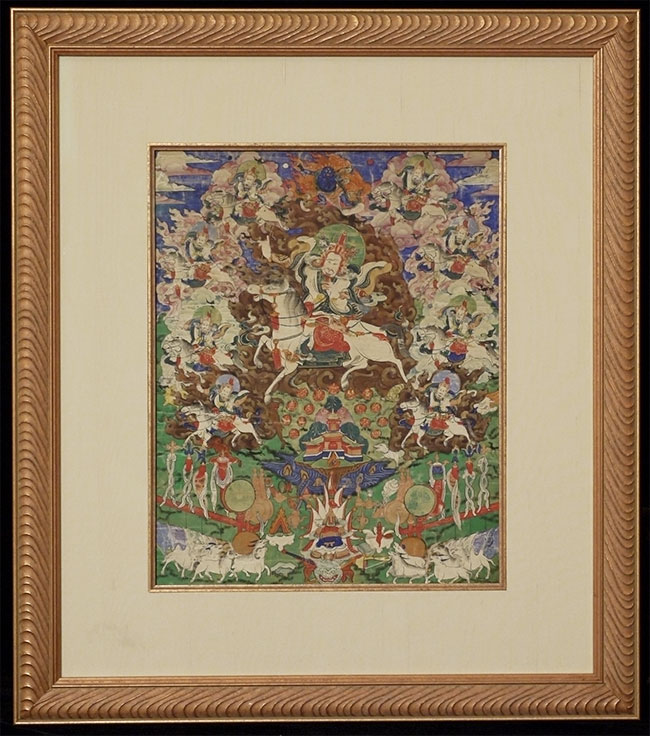 Explosively Detailed Mongolian Thangka. Custom framed with museum glass, and open back for viewing writing. Measures 19.25 x 22 inches, mat opening is 10.25 x 13.25 inches. Very good age. Incredibly lively animals. An all-time favorite.