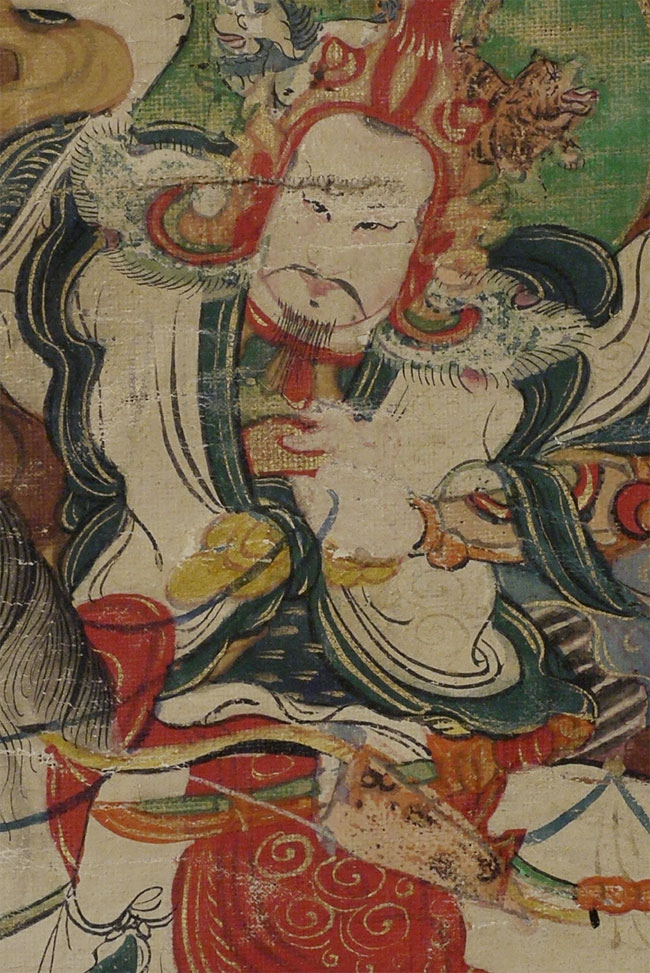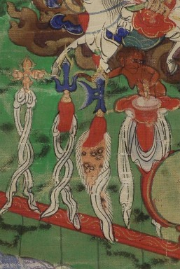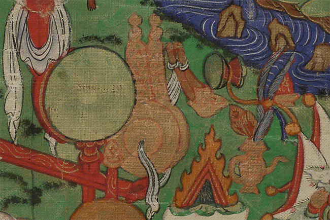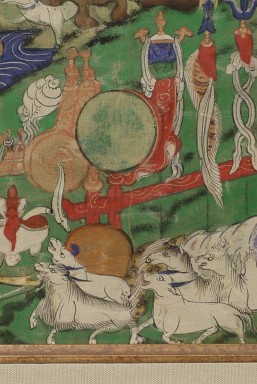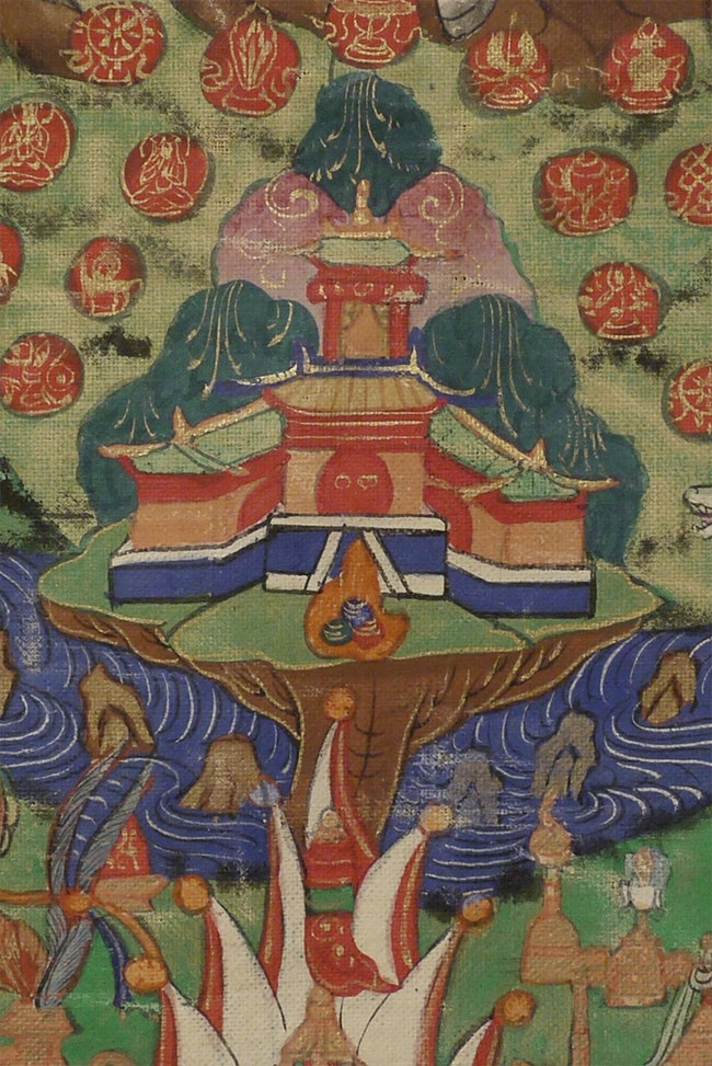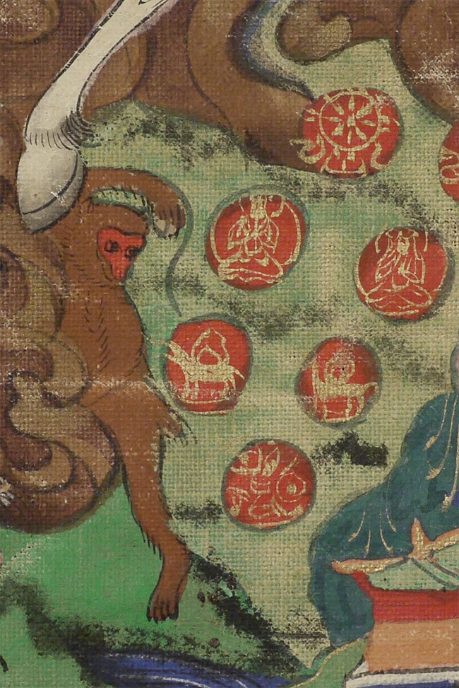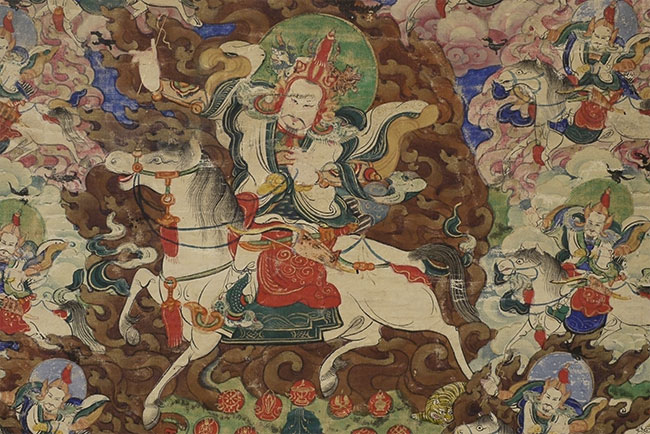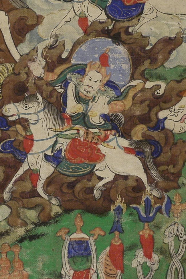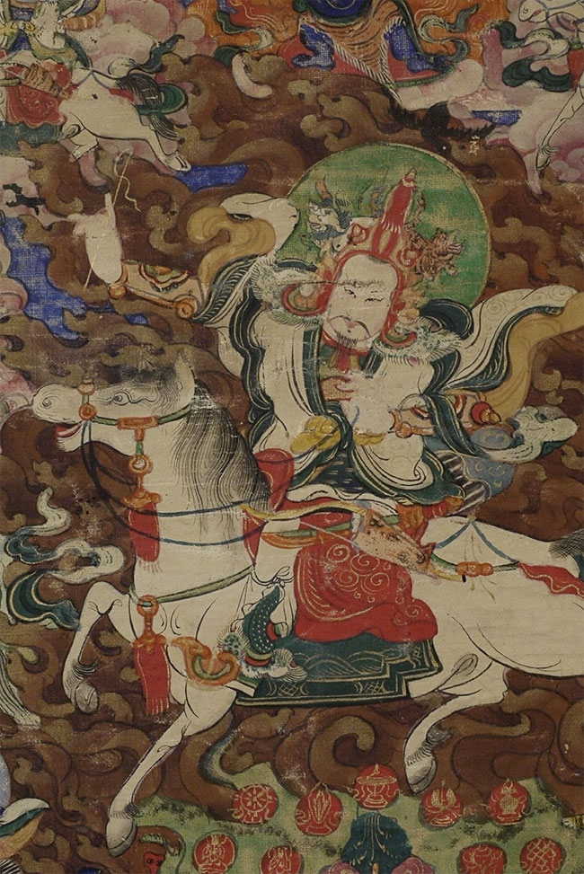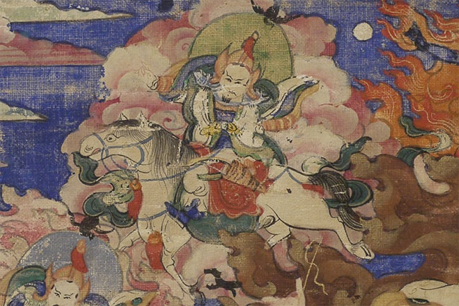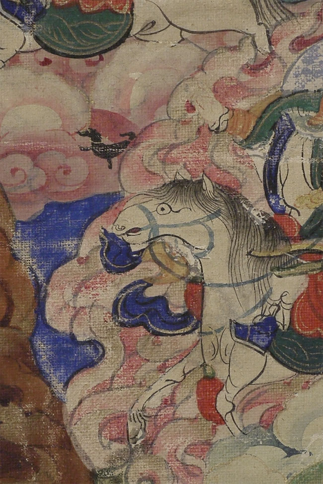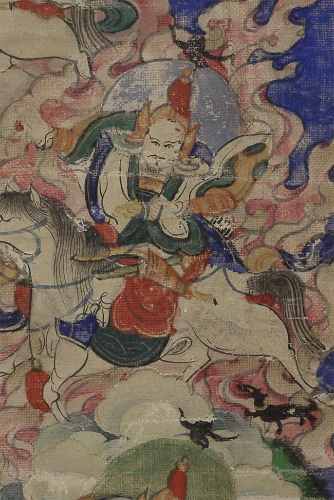 Explosively Detailed Mongolian Thangka. Custom framed with museum glass, and open back for viewing writing. Measures 19.25 x 22 inches, mat opening is 10.25 x 13.25 inches. Very good age. Incredibly lively animals. An all-time favorite.