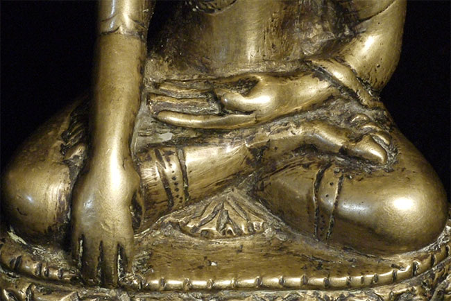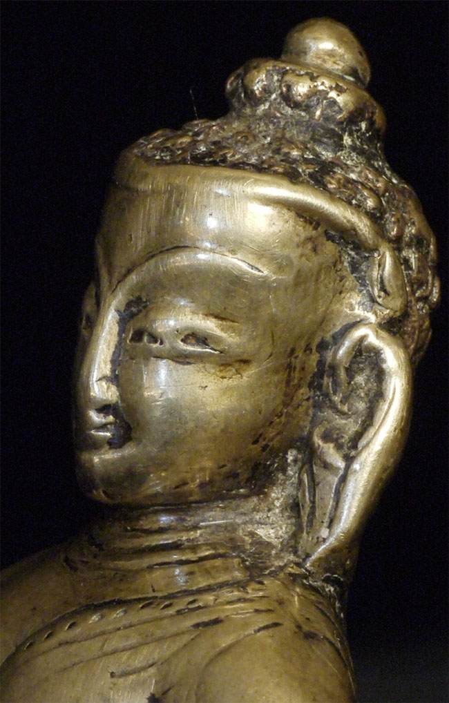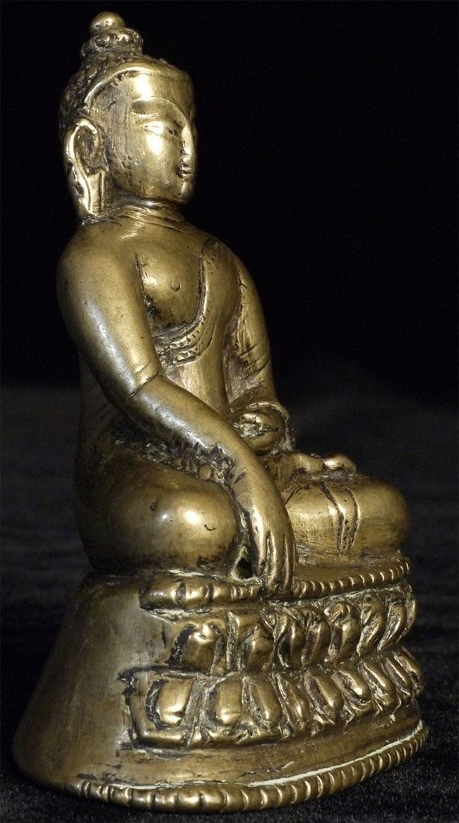 13thC Tibetan Bronze Buddha. Significant ritual wear, but his beautifully expressive face shines brightly. Cast out of a high quality bronze. Nice early piece. Sits 3 1/8 inches tall.