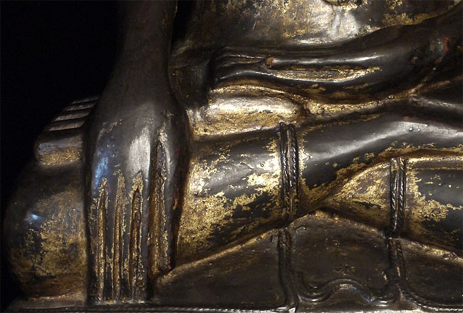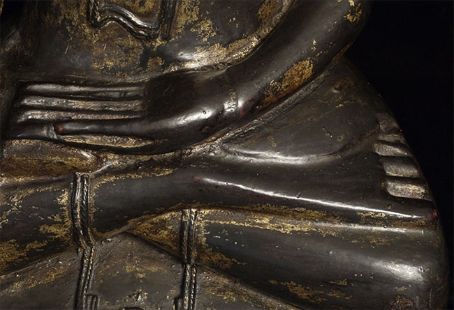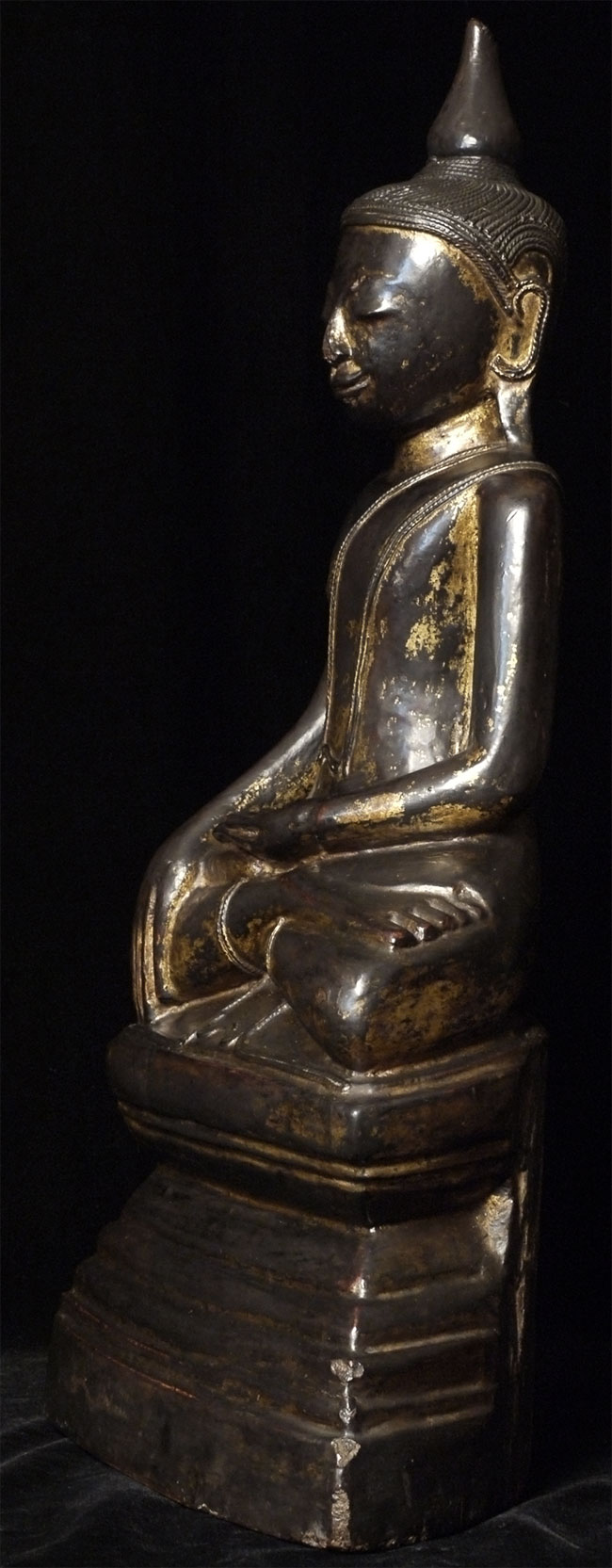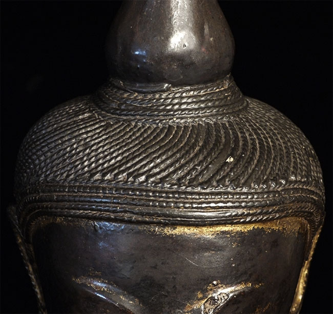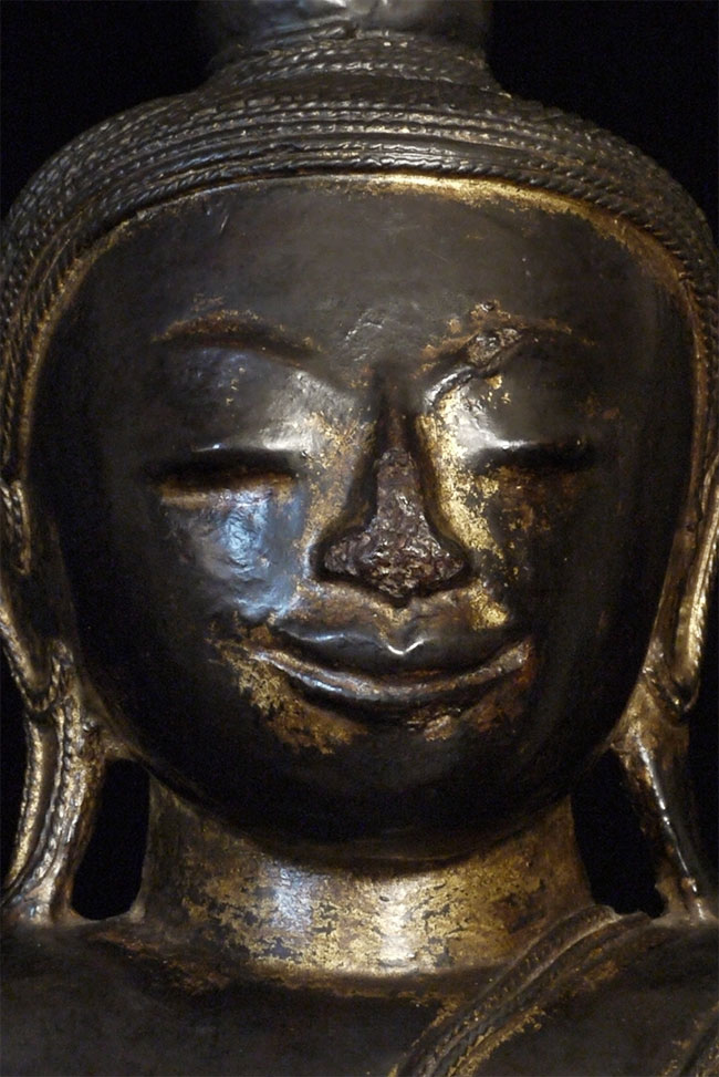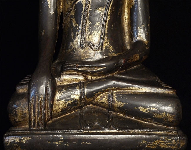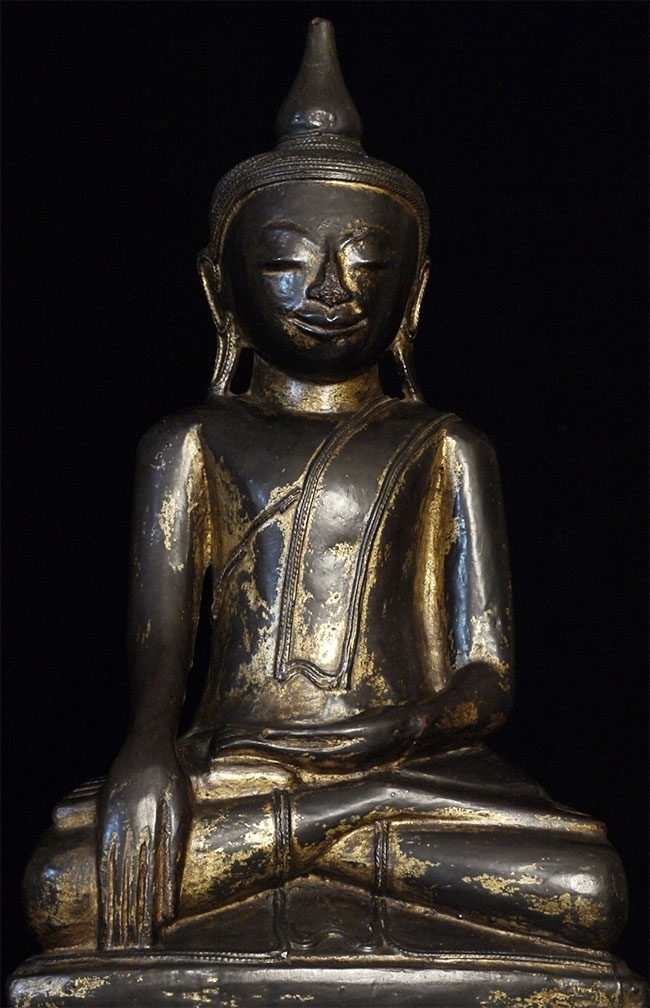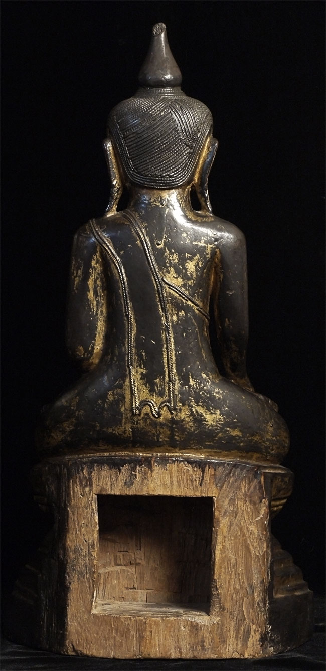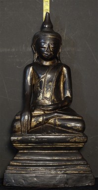 Large 18/19thC Shan style Burmese Buddha carved from a solid piece of teak. Space for consecration in the back of the base. Wonderful face, though the nose is a bit rough. Quite large and heavy at 21.75 inches tall, 11.25 inches wide, 5 inches deep. Great example of his type.