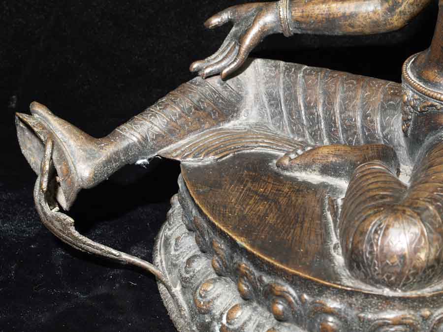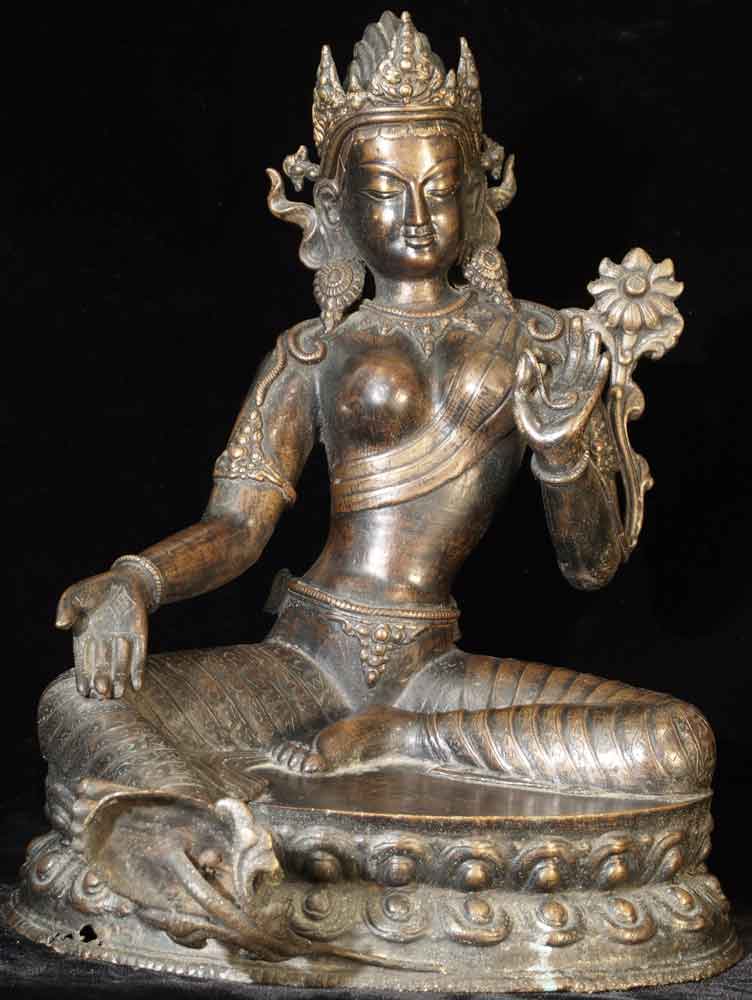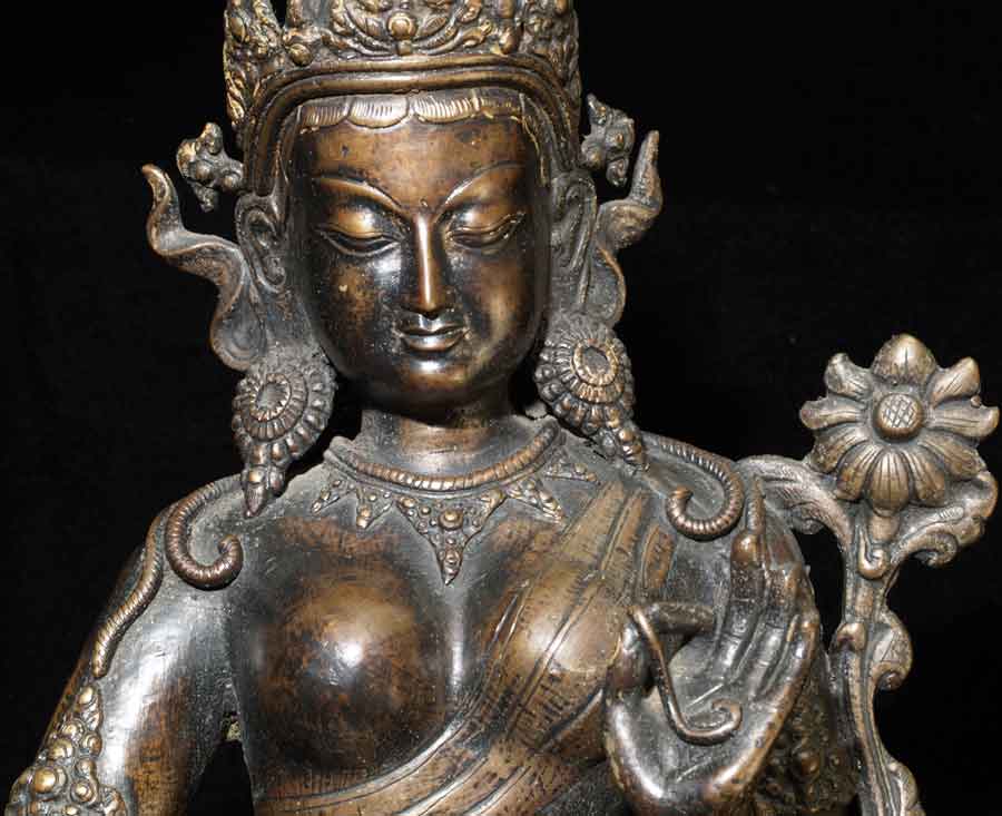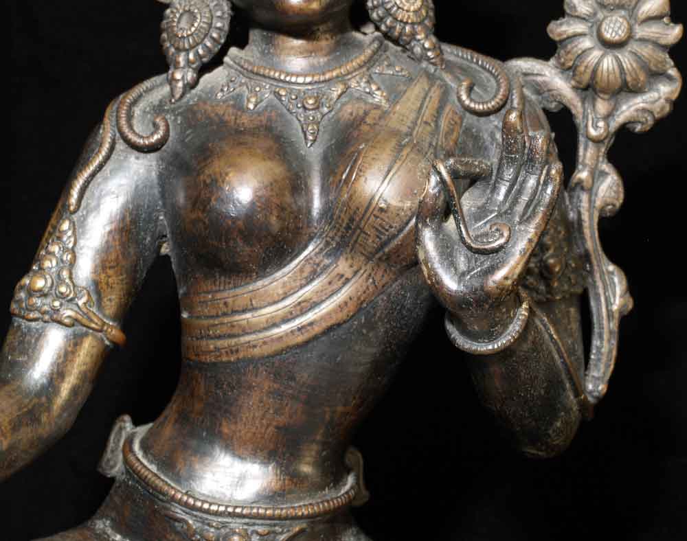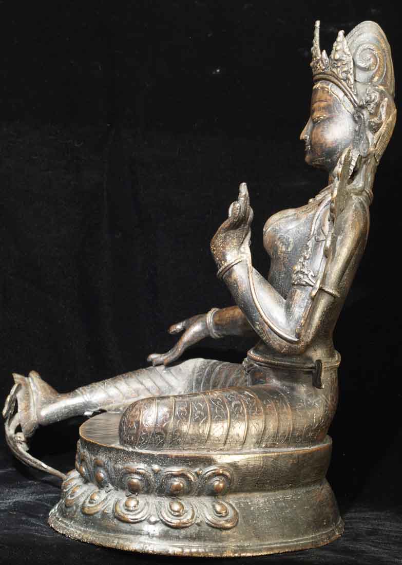 This is a very beautiful older Nepalese female Bodsattva. It was part of an estate, and was purchased in Nepal 45 years ago. It has a wonderful grace and finesse, and a deep rich patina from polishing. It is large at 12.25 inches tall by 9.75 inches wide by 7 inches deep.