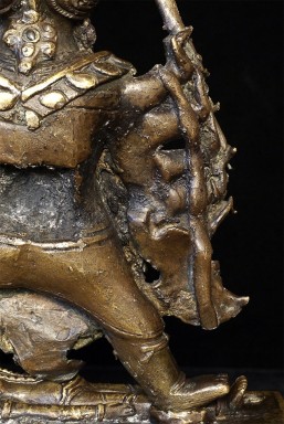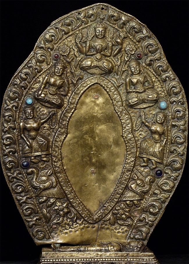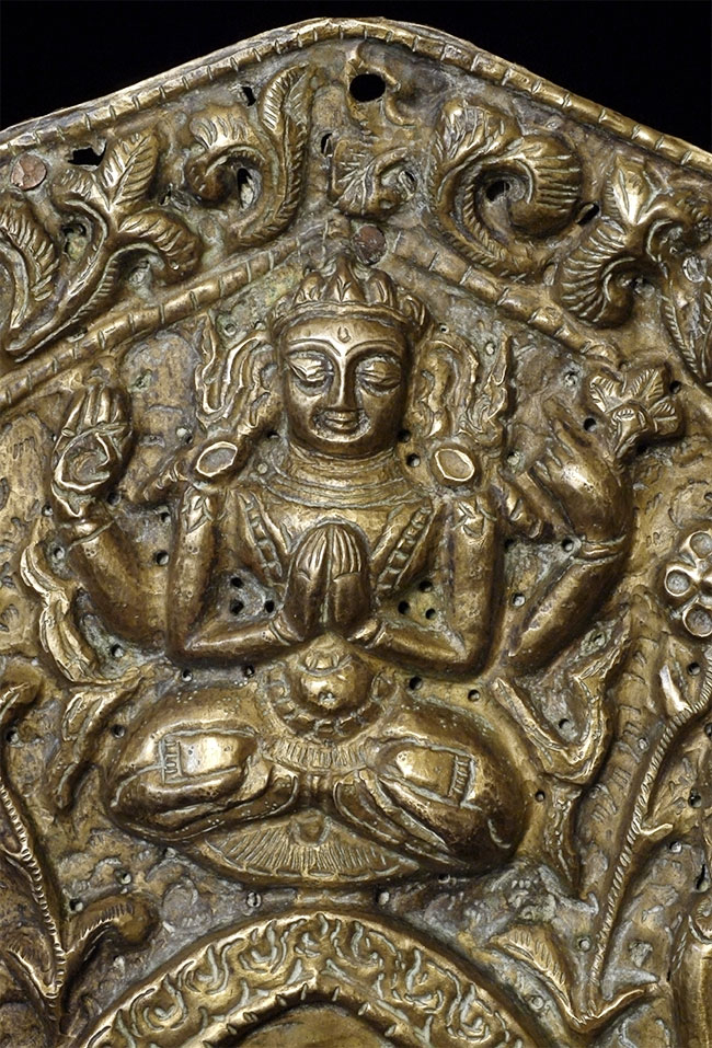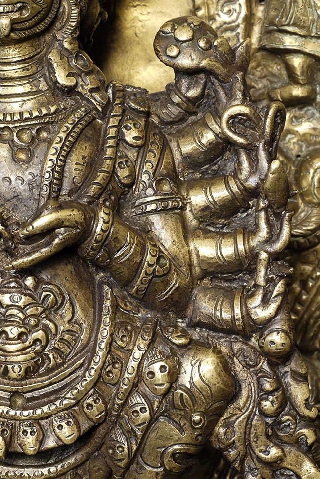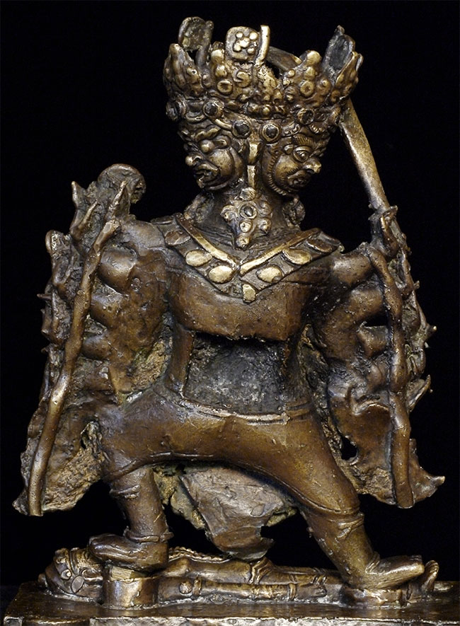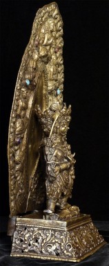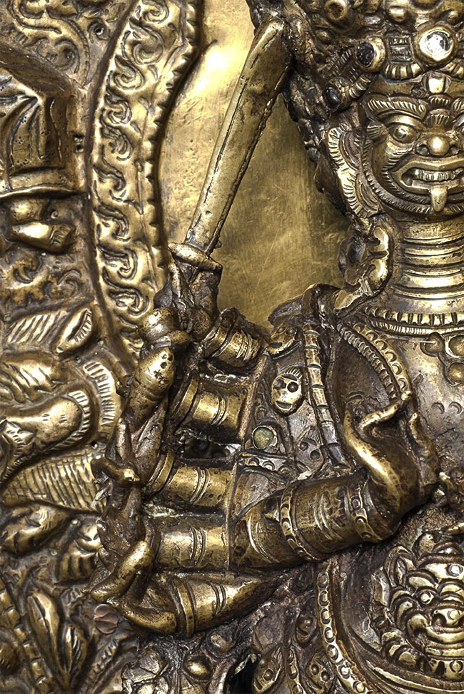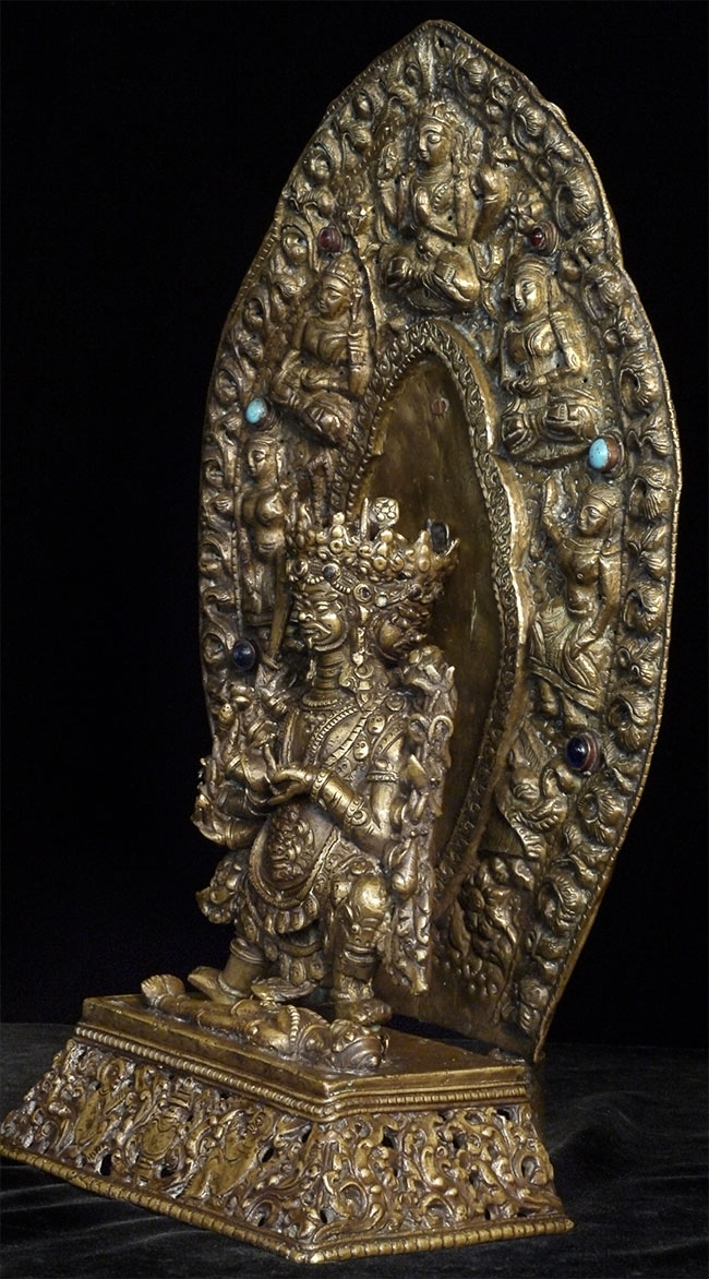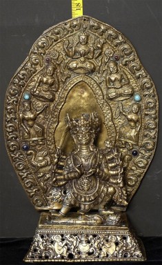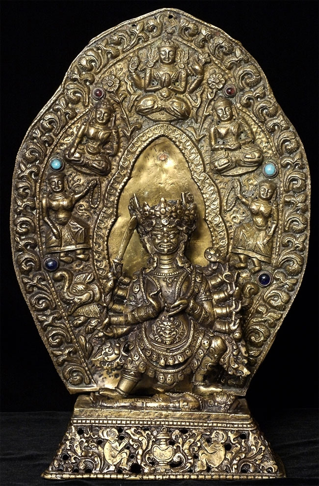 Antique Fierce Tibetan or Nepalese 12-arm Tantric Deity standing on figure with elaborate multi-deity back plate. Originally had 2 additional small figures plus an additional piece on the top of the head. Fully assembled, the piece measures 17.5 inches tall, 11.5 inches at widest point. Back plate is double layer copper repousse, figure (very heavy) is solid cast brass or bronze inlaid with black stones or crystals(?), and base is cast and assembled bronze. Combination of tribal intensity and Buddhist focus. Originally consecrated in the back of the figure. Very unusual type