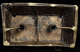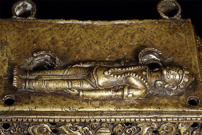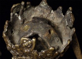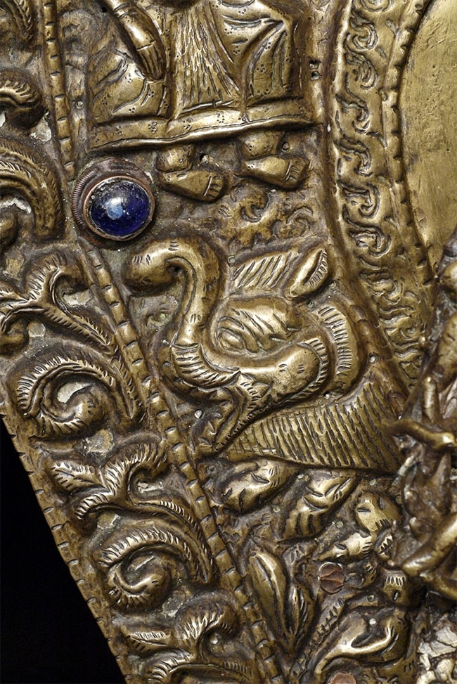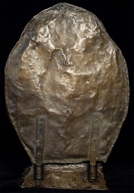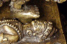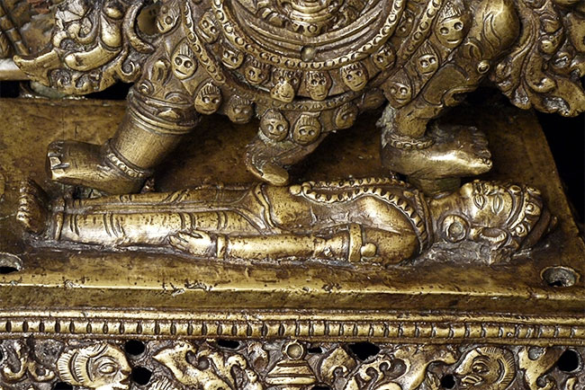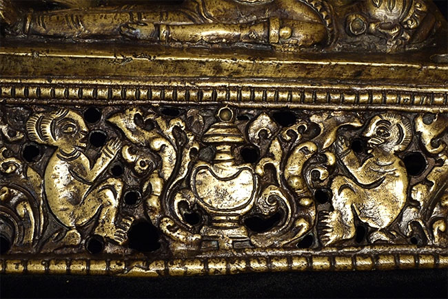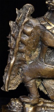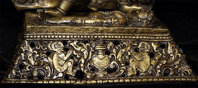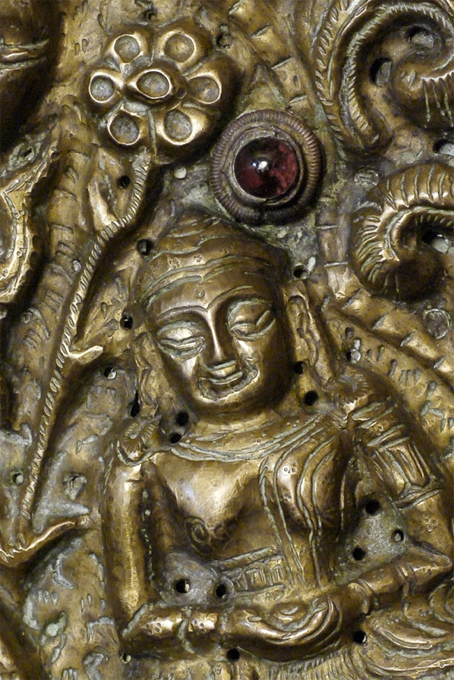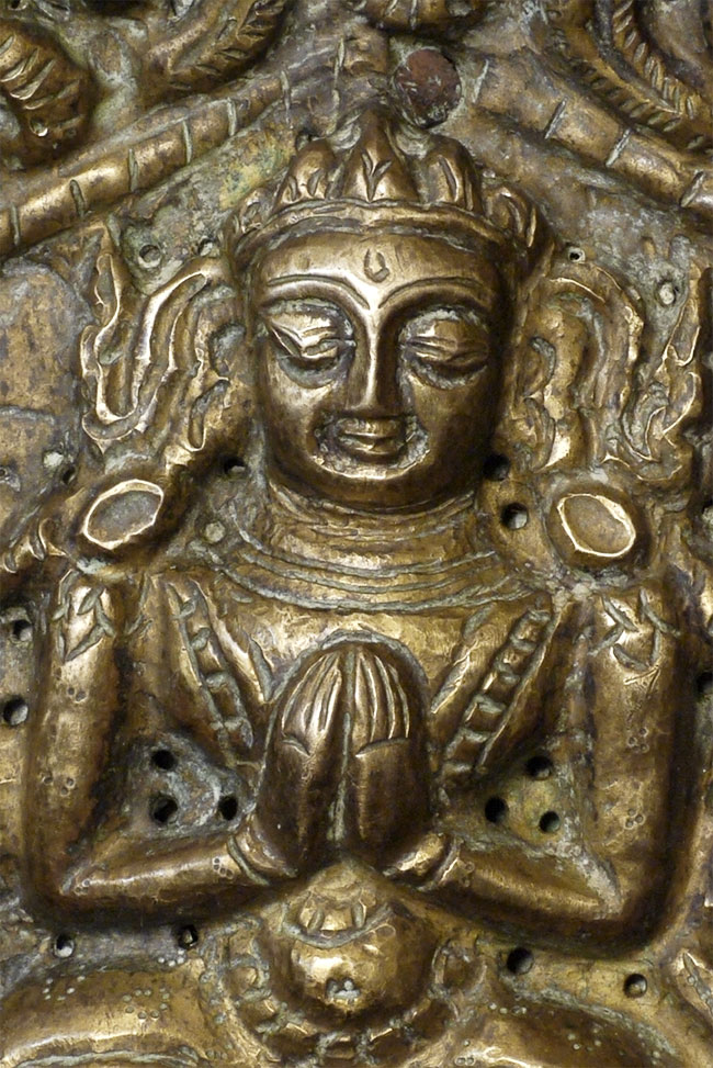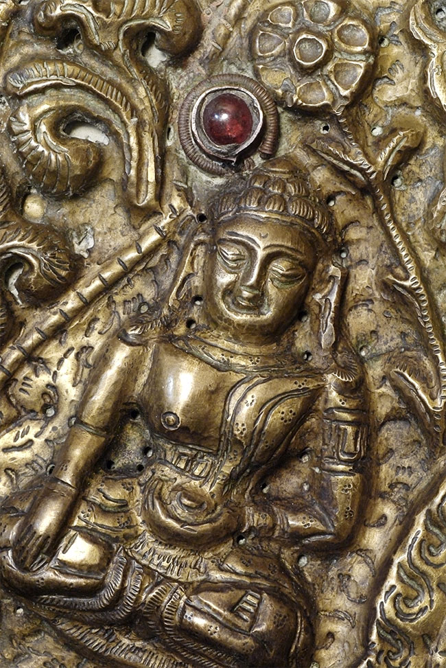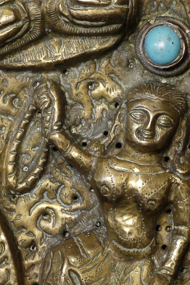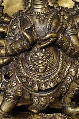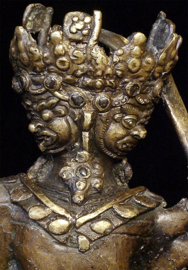 Antique Fierce Tibetan or Nepalese 12-arm Tantric Deity standing on figure with elaborate multi-deity back plate. Originally had 2 additional small figures plus an additional piece on the top of the head. Fully assembled, the piece measures 17.5 inches tall, 11.5 inches at widest point. Back plate is double layer copper repousse, figure (very heavy) is solid cast brass or bronze inlaid with black stones or crystals(?), and base is cast and assembled bronze. Combination of tribal intensity and Buddhist focus. Originally consecrated in the back of the figure. Very unusual type