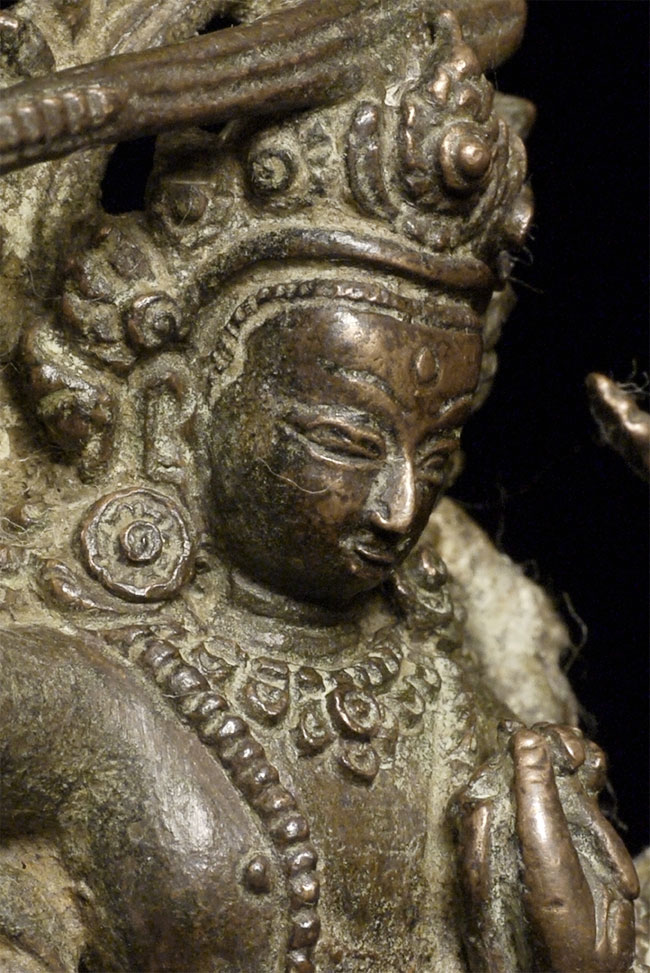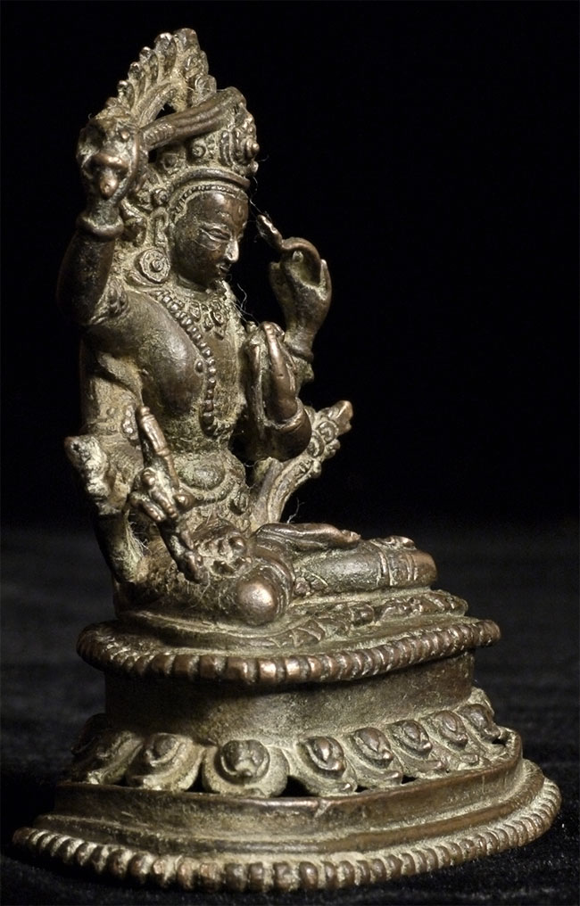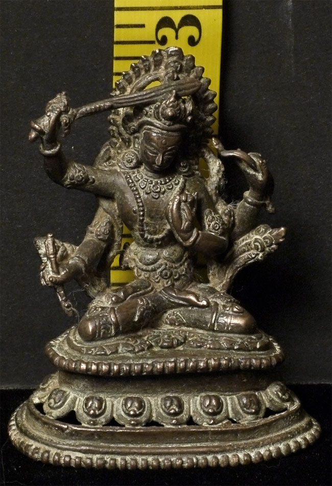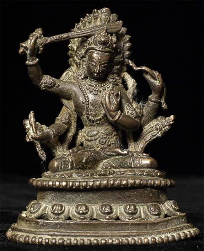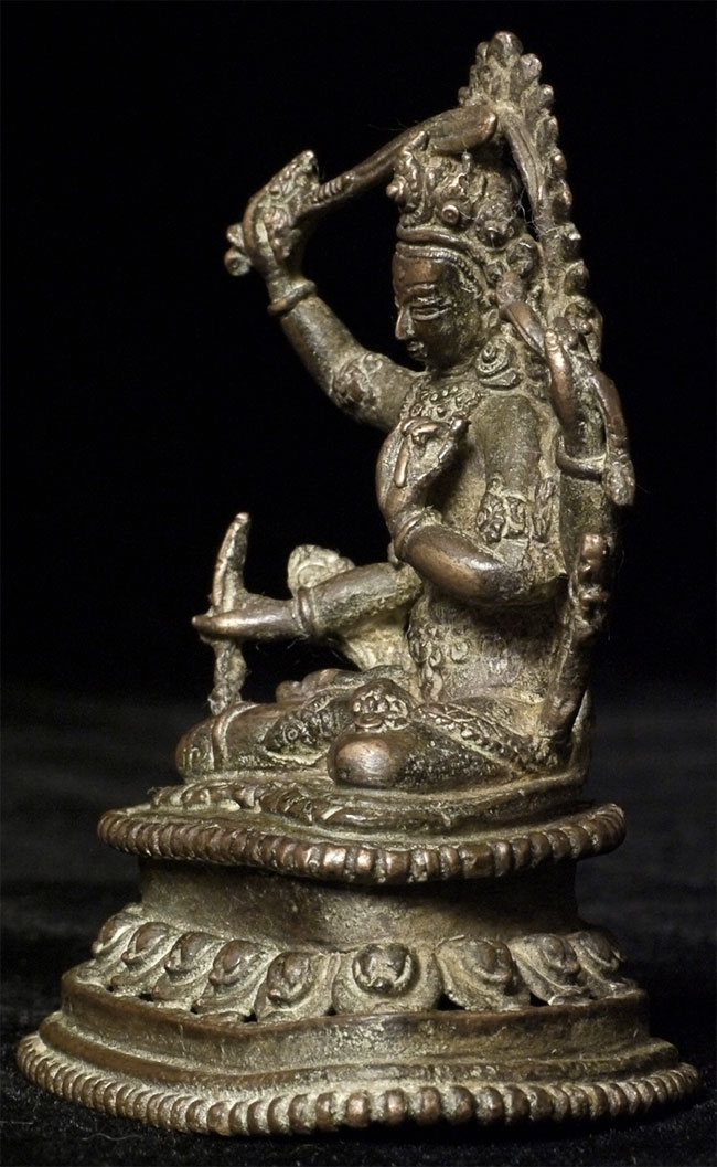 Very finely cast antique Nepalese bronze Bodhisattvia Manjushri, who cuts through deception and ignorance with his sword of wisdom. Sits 2.75 inches tall. Cast in the manner of the best early examples. Unsure of dating, but looks to have good age.