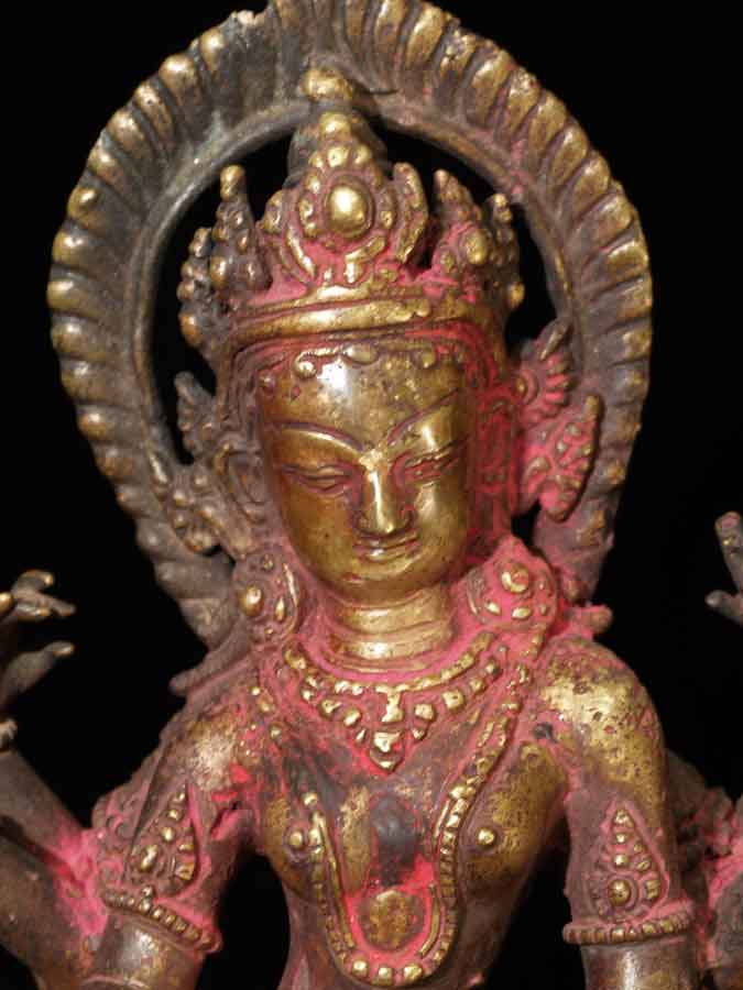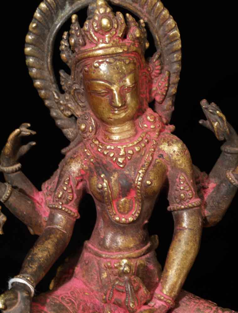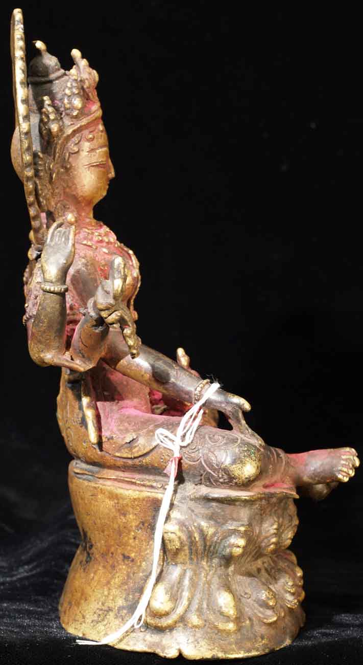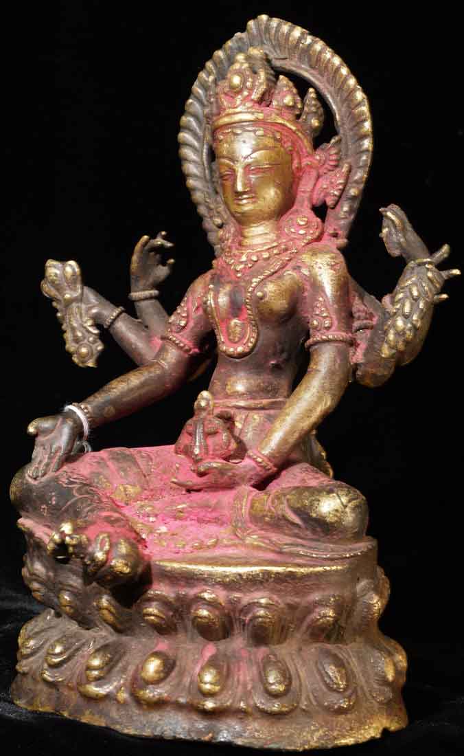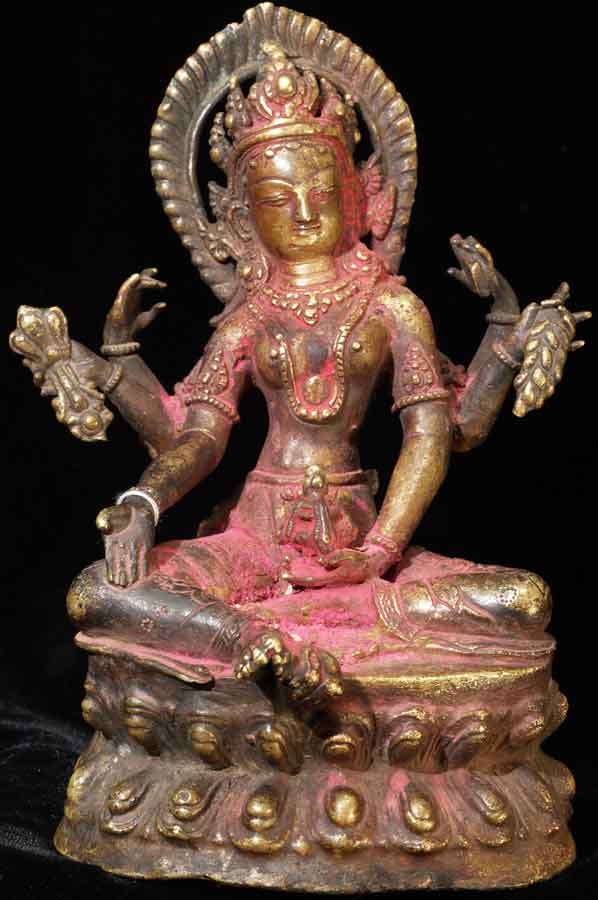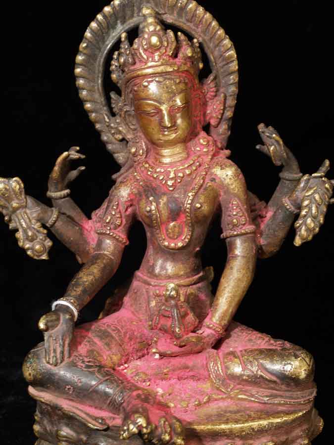 Fabulous Newari workmanship on this early Nepalese Bodhisattva. A friend of mine received this directly from a Nepalese person who had this on their family’s personal altar for many generations. It is still thickly encrusted with red puja powder. This bronze is Vasudhara, which means 'rich in treasures', she's the wife of Jambhala. She is wonderful- her face is supremely benevolent, loving, and peaceful. She is a personal favorite. She is 7.25 inches tall and quite heavy. Based on comparable pieces I can find in books I am estimating that she is 15th century- please email and let me know if you feel that I am off on the date.