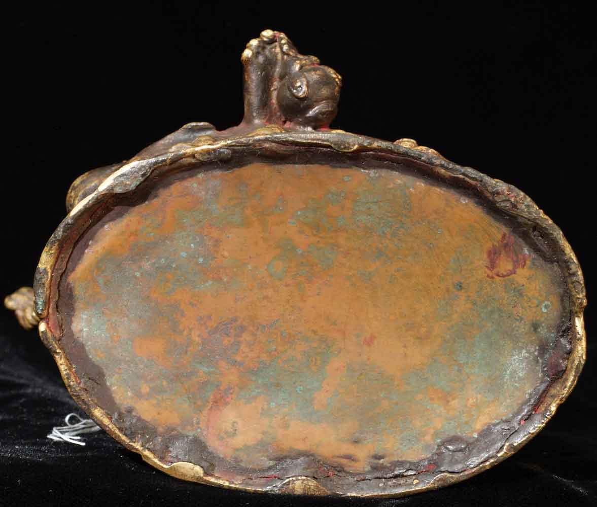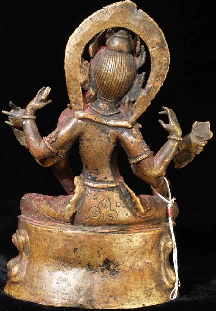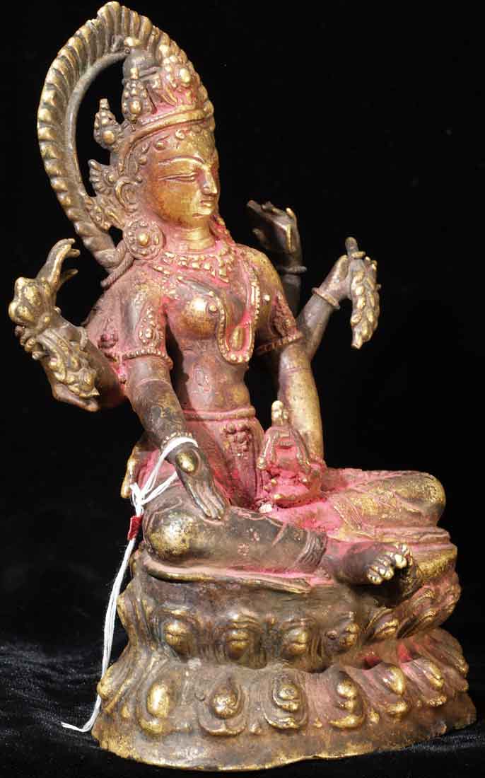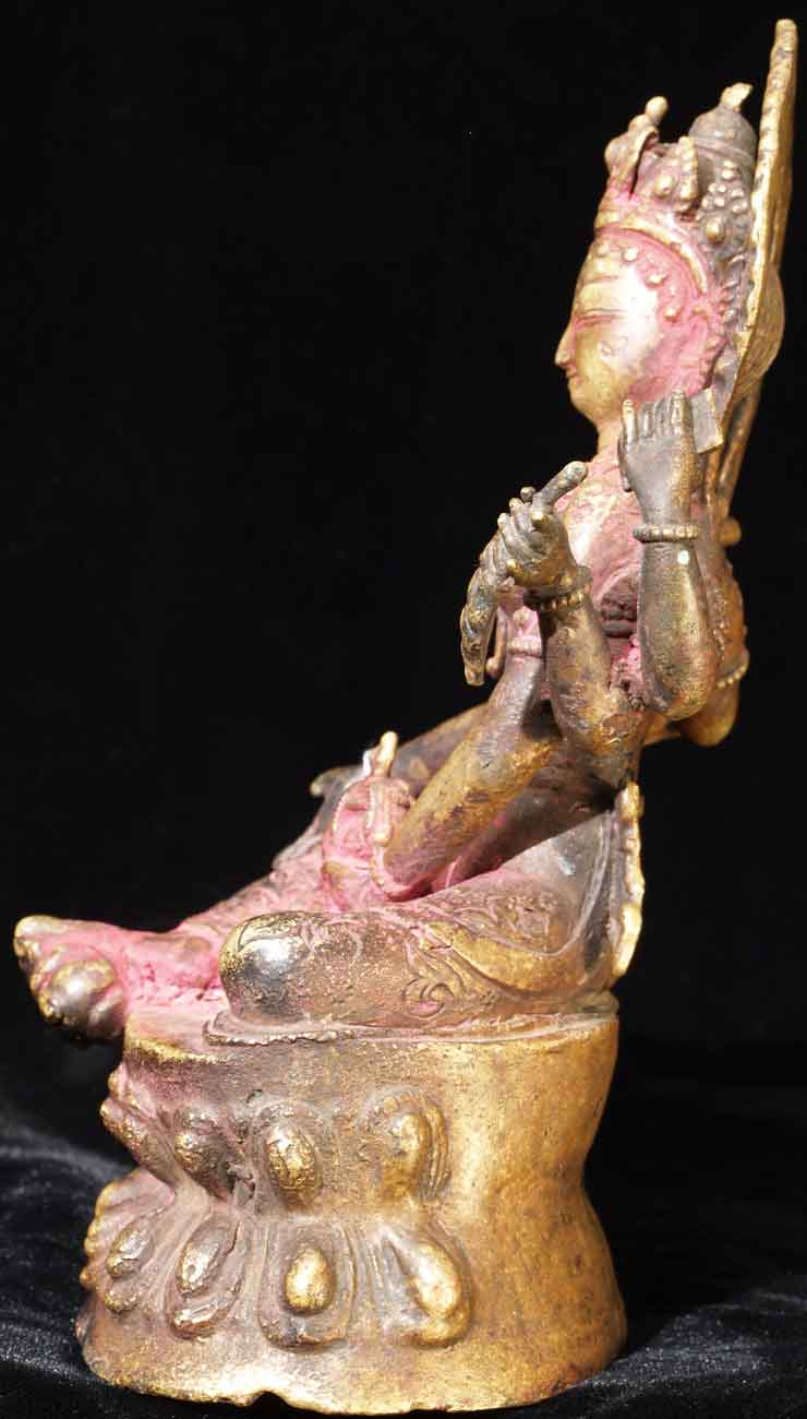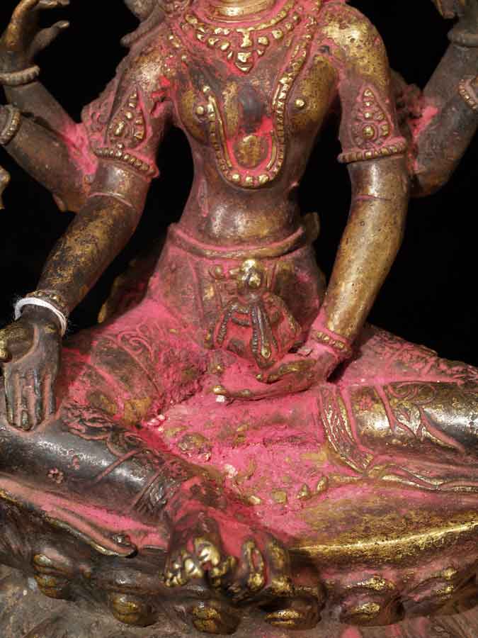 Fabulous Newari workmanship on this early Nepalese Bodhisattva. A friend of mine received this directly from a Nepalese person who had this on their family’s personal altar for many generations. It is still thickly encrusted with red puja powder. This bronze is Vasudhara, which means 'rich in treasures', she's the wife of Jambhala. She is wonderful- her face is supremely benevolent, loving, and peaceful. She is a personal favorite. She is 7.25 inches tall and quite heavy. Based on comparable pieces I can find in books I am estimating that she is 15th century- please email and let me know if you feel that I am off on the date.