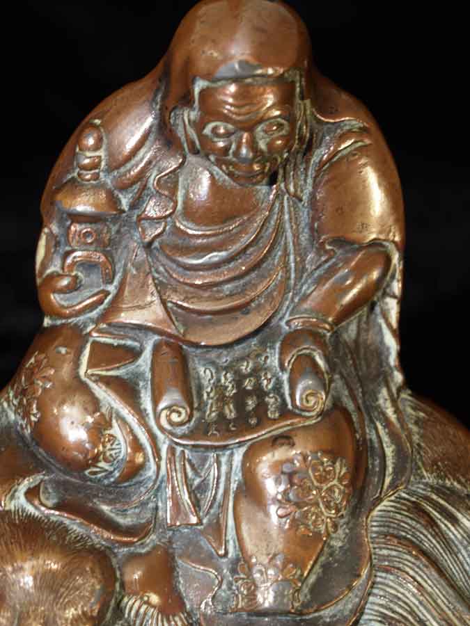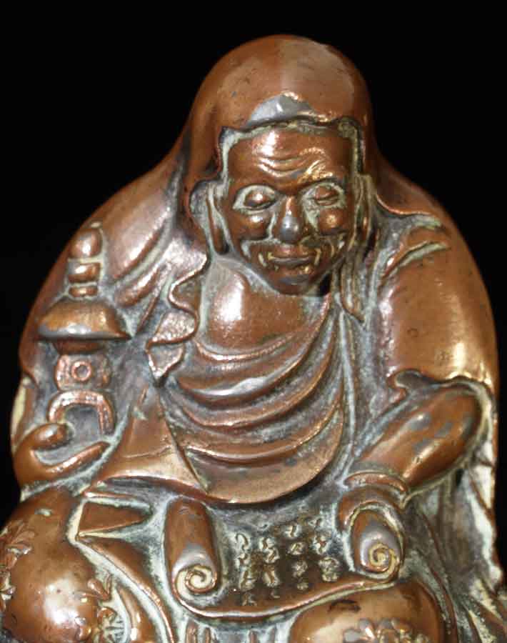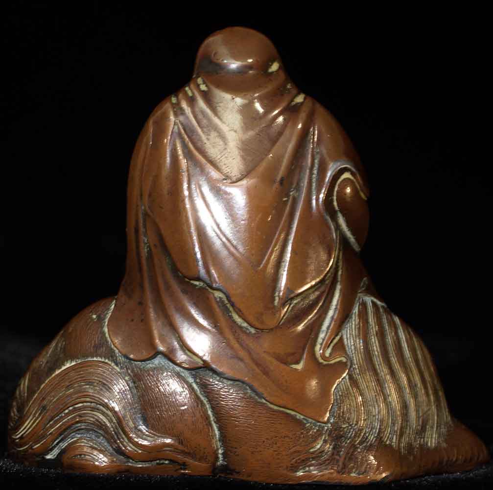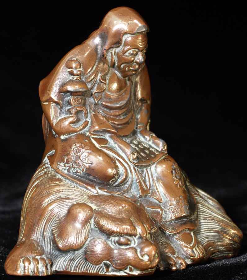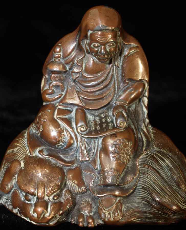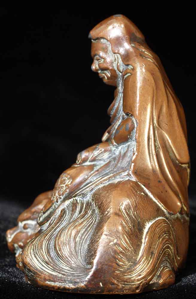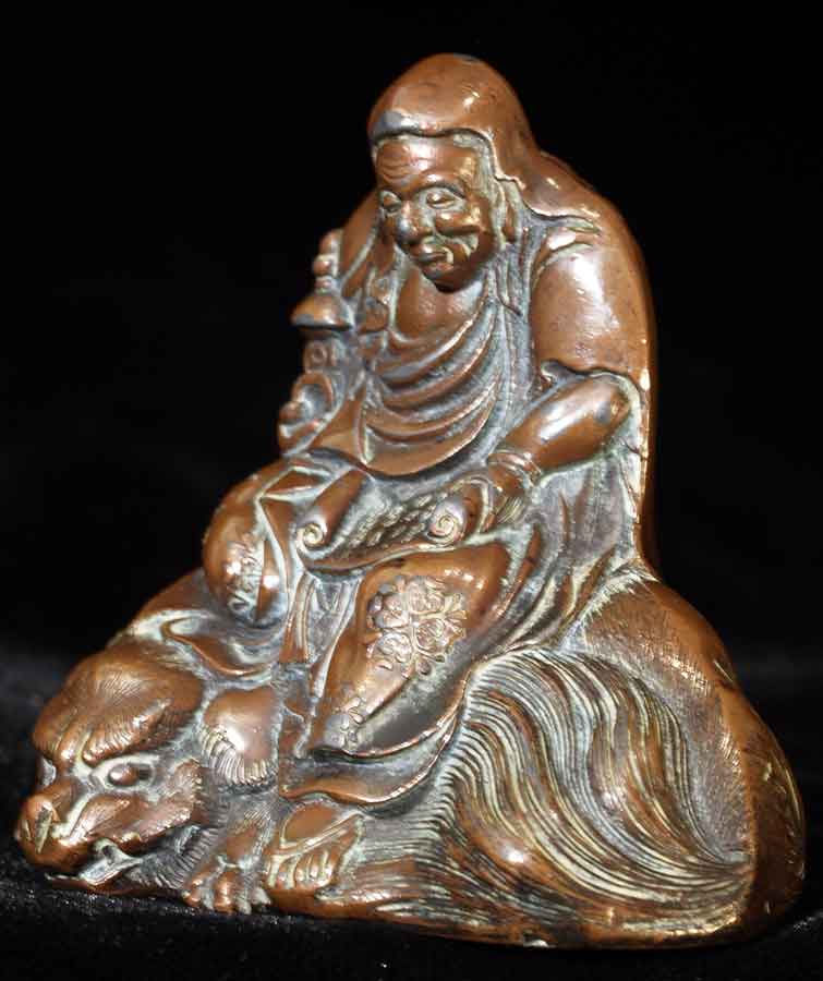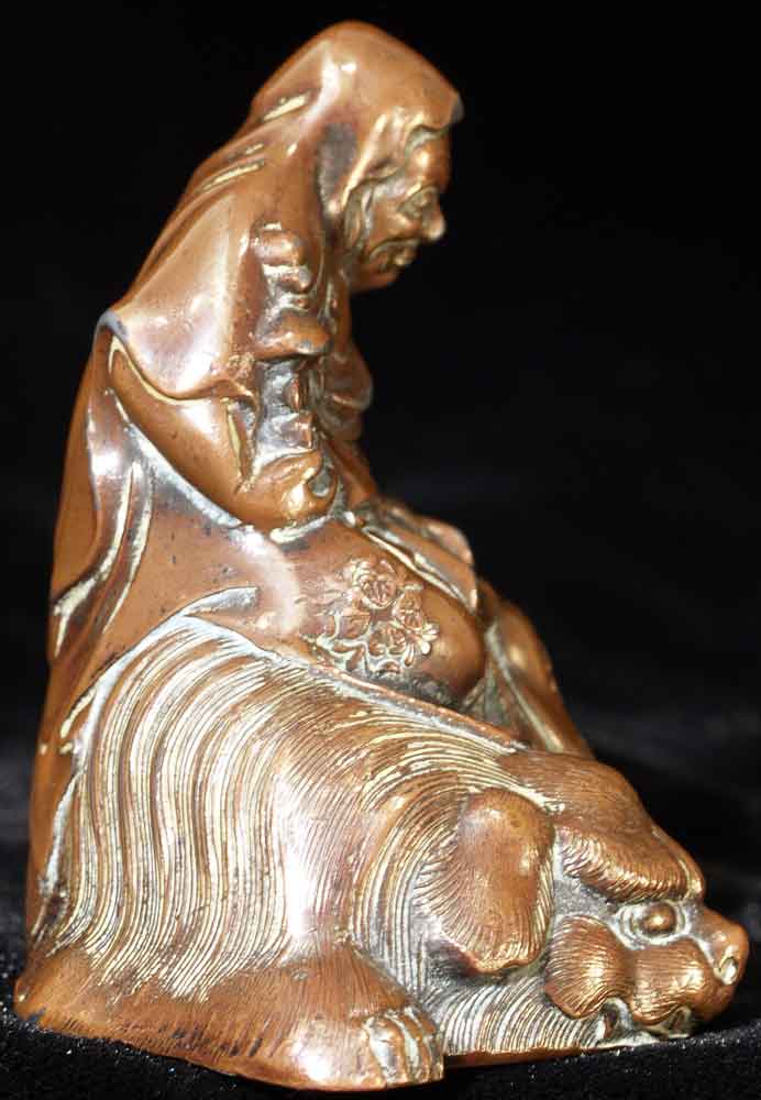 This is an old, nicely detailed, solid cast and very heavy Bodhisattva. It has wear to the patina as can be seen in the photos. It sits close to 2.5 inches taoo, by 2.5 inches wide