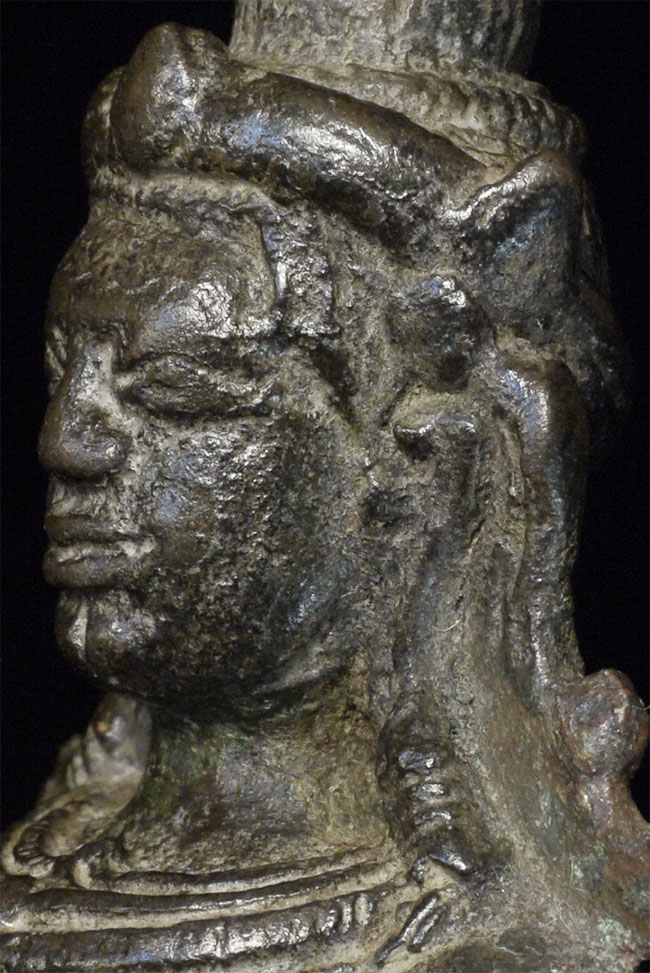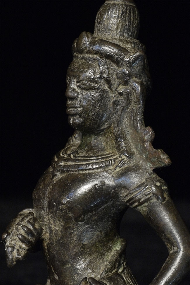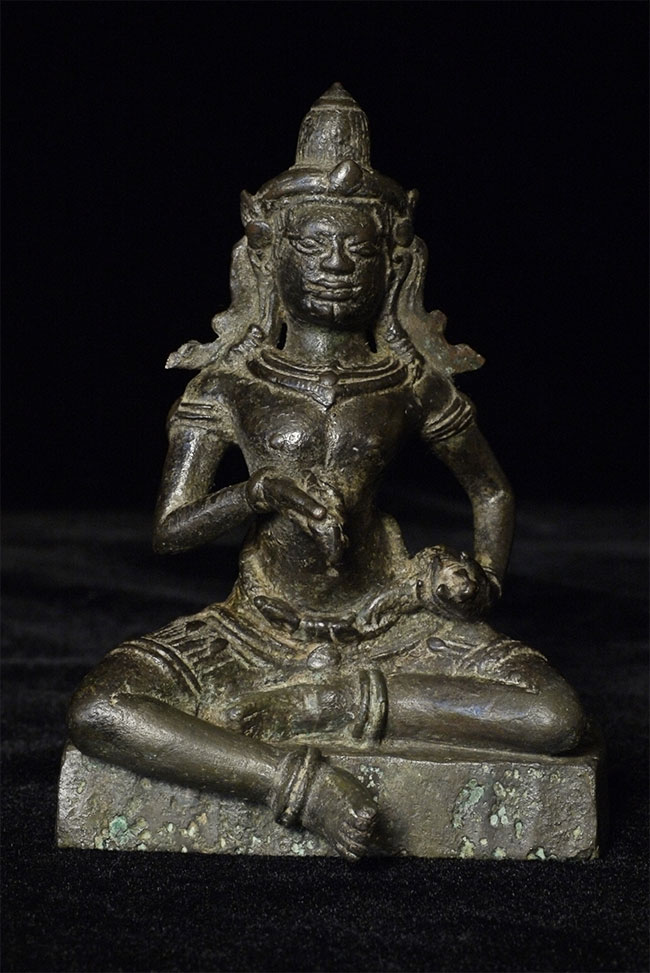 Exceptional 13thC Cambodian Bodhisattva. Unusual construction to base (base repaired). Sits 3 5/8 inches tall. Possibly Cham.
