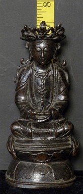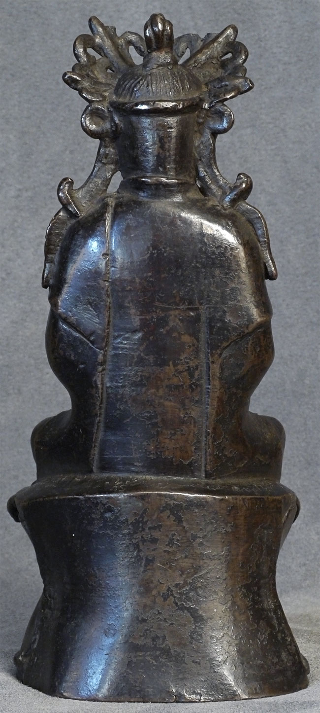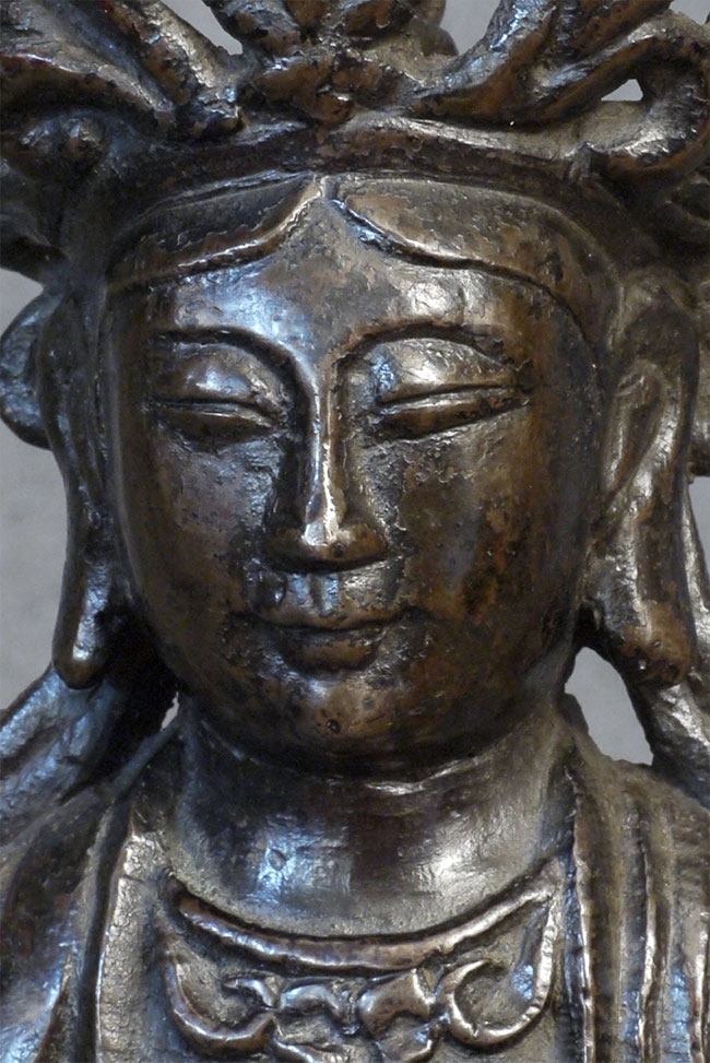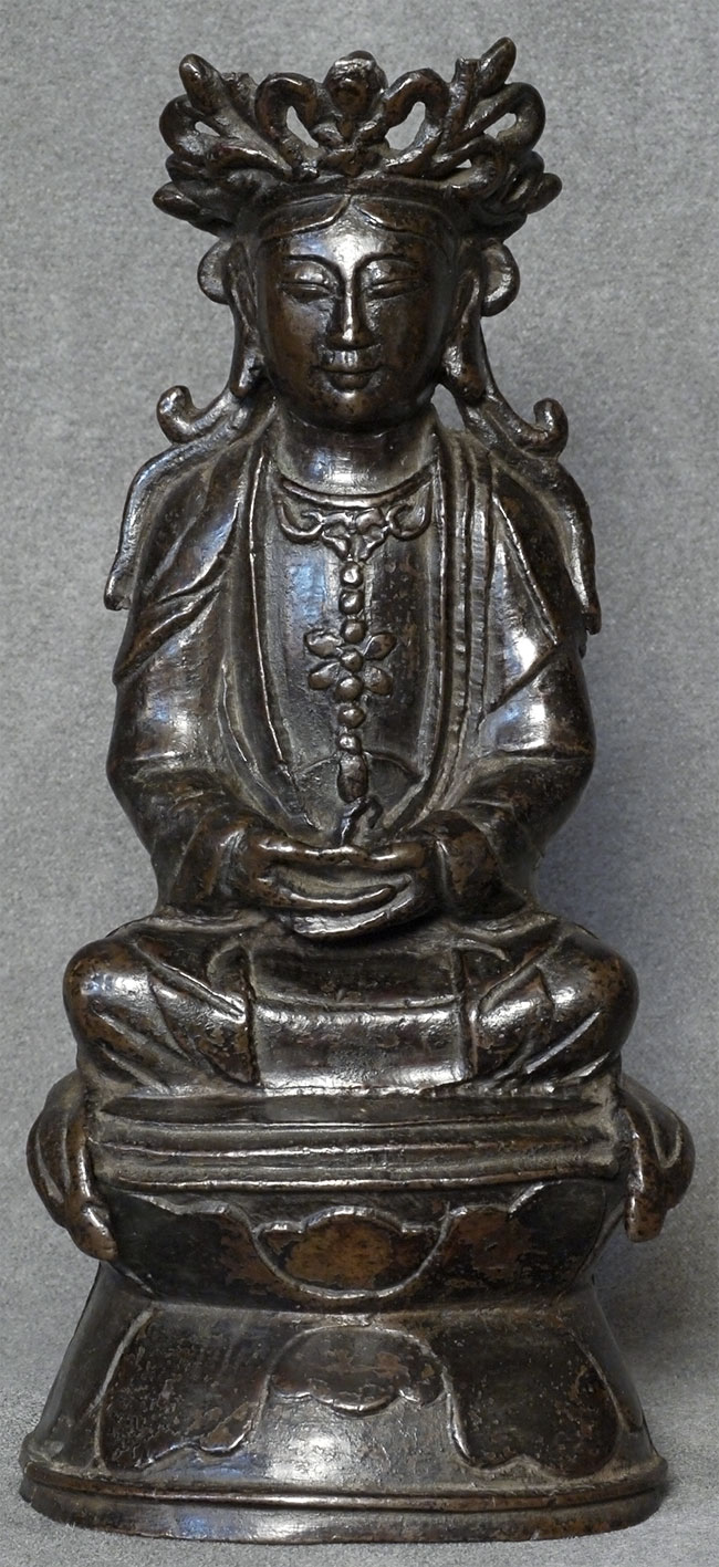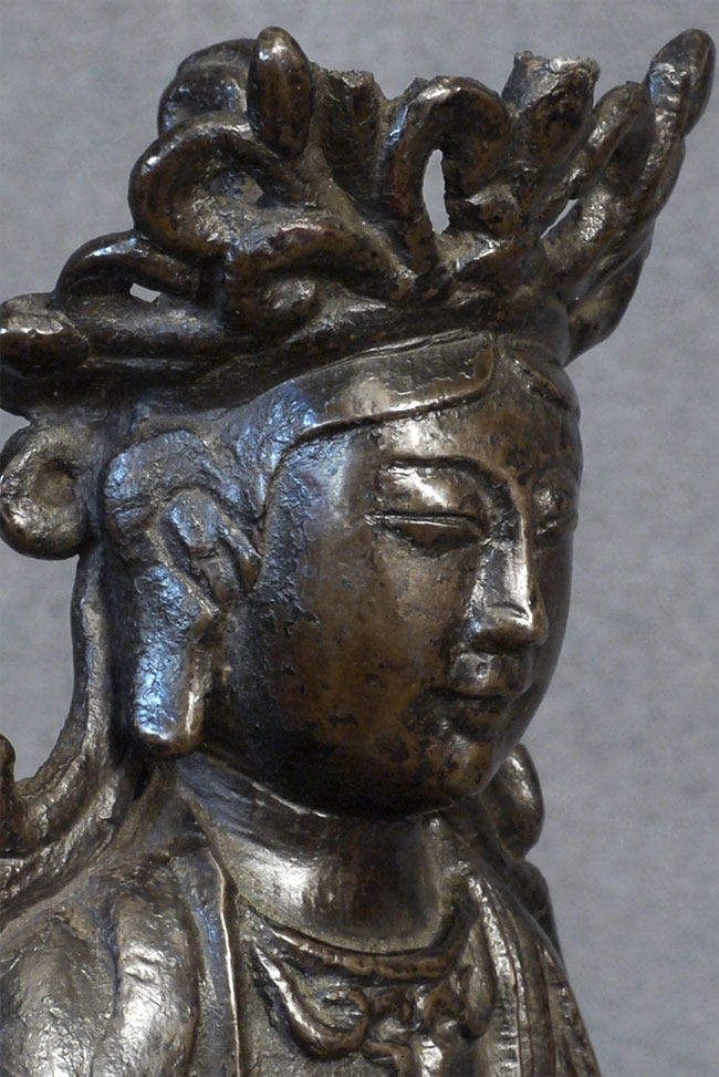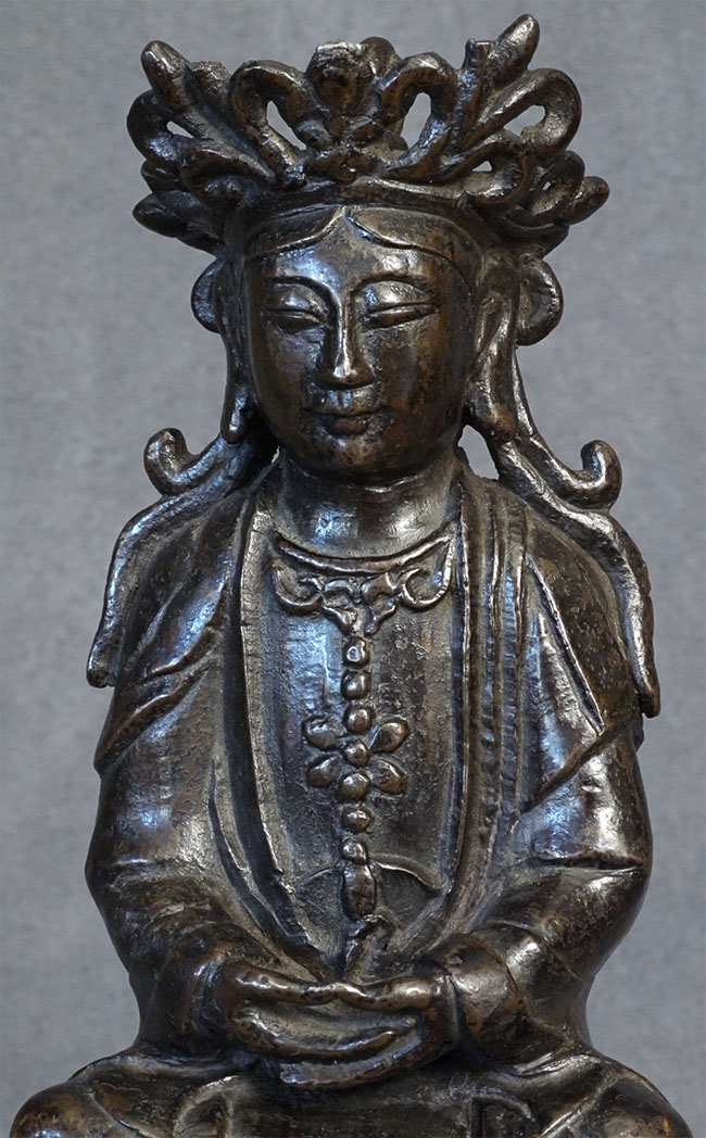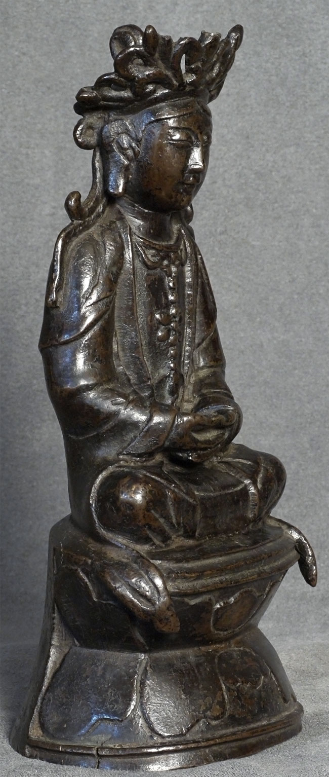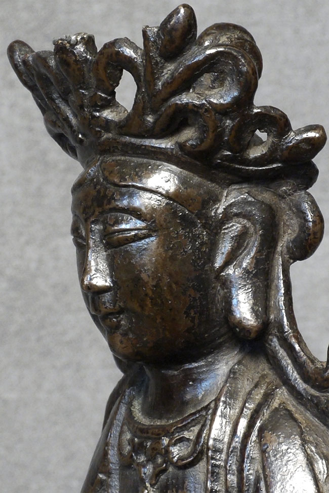 Special face on this 18thC Chinese bronze Quanyin. Some loss to the tip of the crown- condition otherwise exceptional, with beautiful chocolate patina. Very uncommon style to the lotus base and to the headdress. Real finesse, down to the arch of the thumbs. Sits 7 1/8 inches tall.