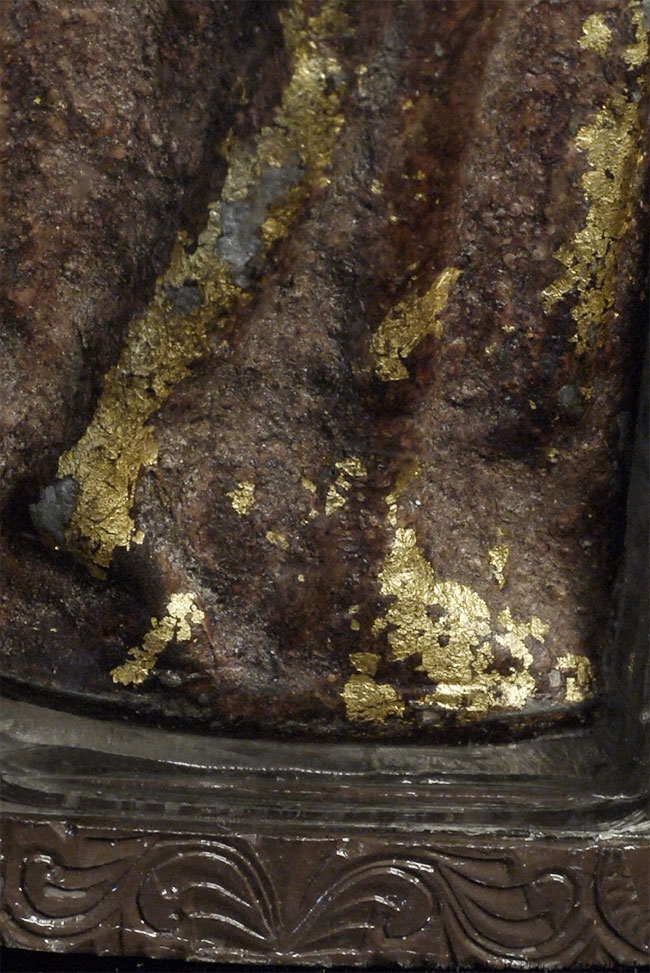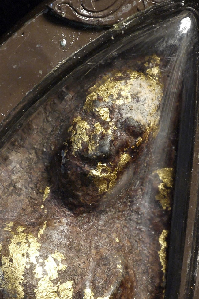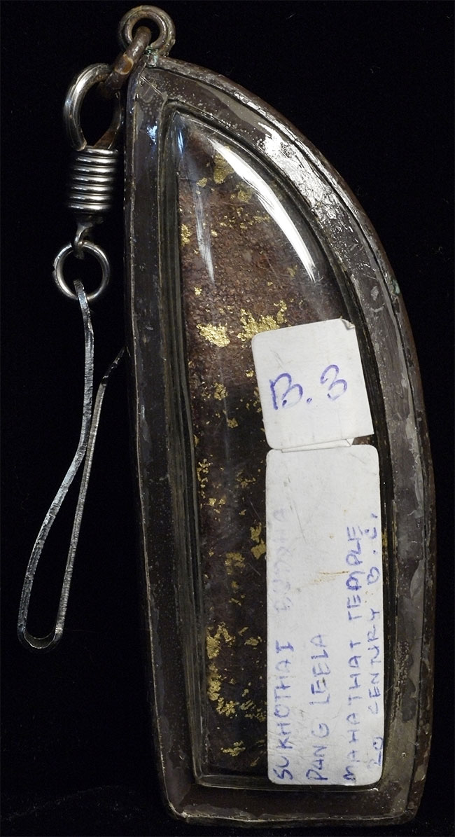 Powerful Thai bronze Sukhothai Walking Buddha Amulet. In modern case. Amulet(including frame) is 3.35 inches tall. Vast majority of this type you see are 19/20thC, but this piece looks to be a true period piece, with a classic early Sukhothai face. Strong burial patina. The writing/dating on the back is from the previous collector, who used the Buddhist calendar (this year is the year 2557, so by the Buddhist calendar the 20thC would have been approx. 600 years ago).