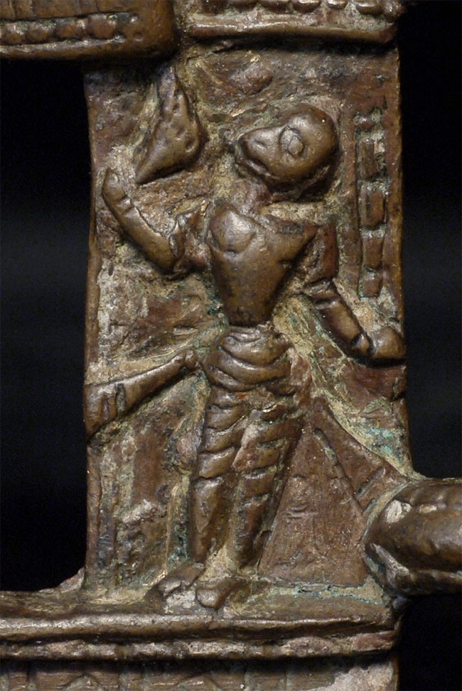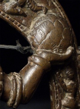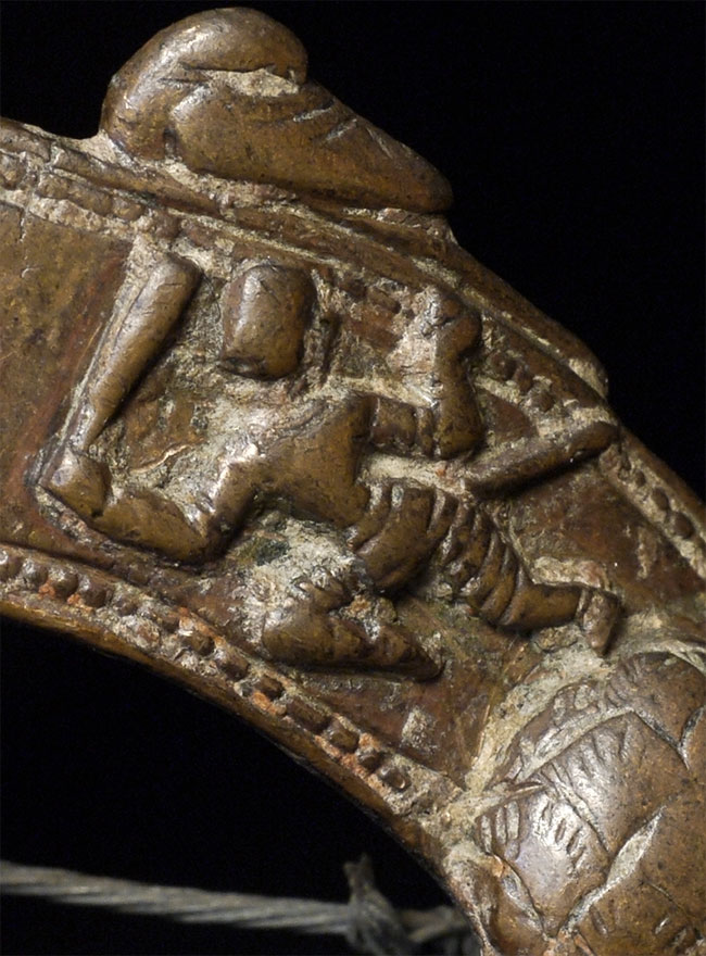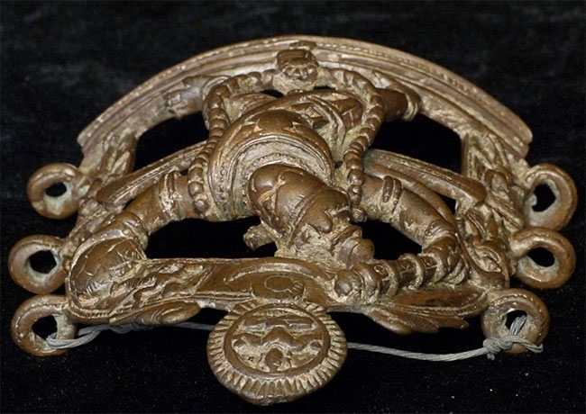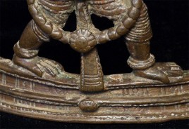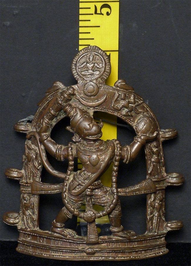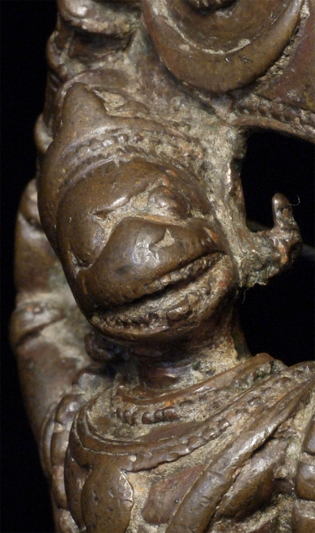 Fabulous 18thC or earlier bronze Hanuman. Appears to originally have been made to be an armband. Traces of original gilding remain. Unusual type- I have seen numerous Hanuman plaques, but never another of this type. Extremely animated face, and overall lively attitude. Stands 4 1/8 inches tall.