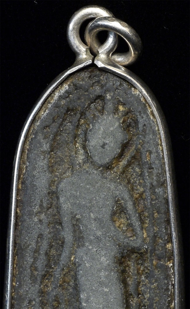 Antique Thai Sukhothai Style Walking Buddha Amulet with modern silver mount. Looks to be quite old- unsure how to date. Stands close to 2 inches tall.