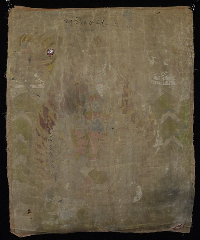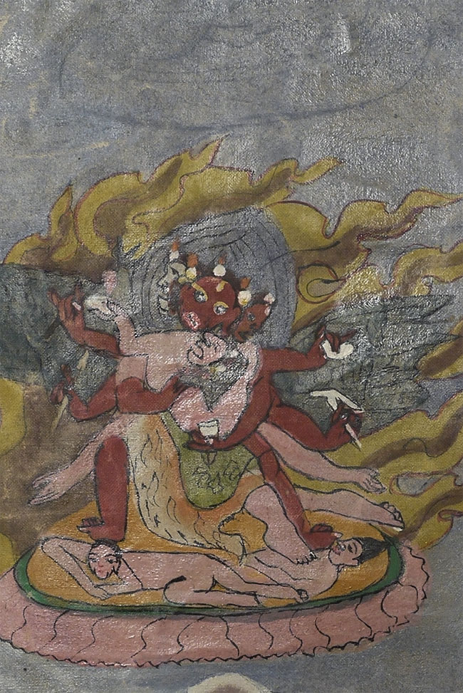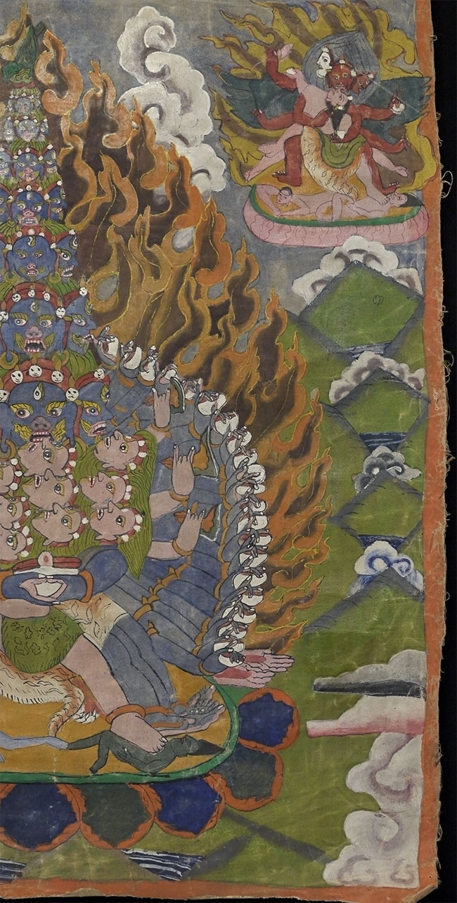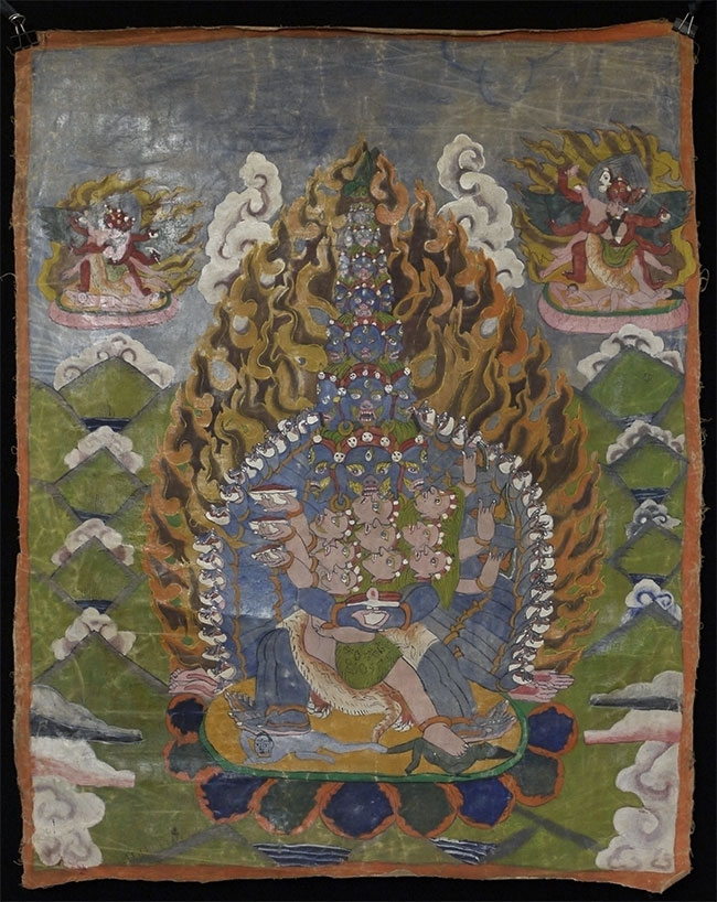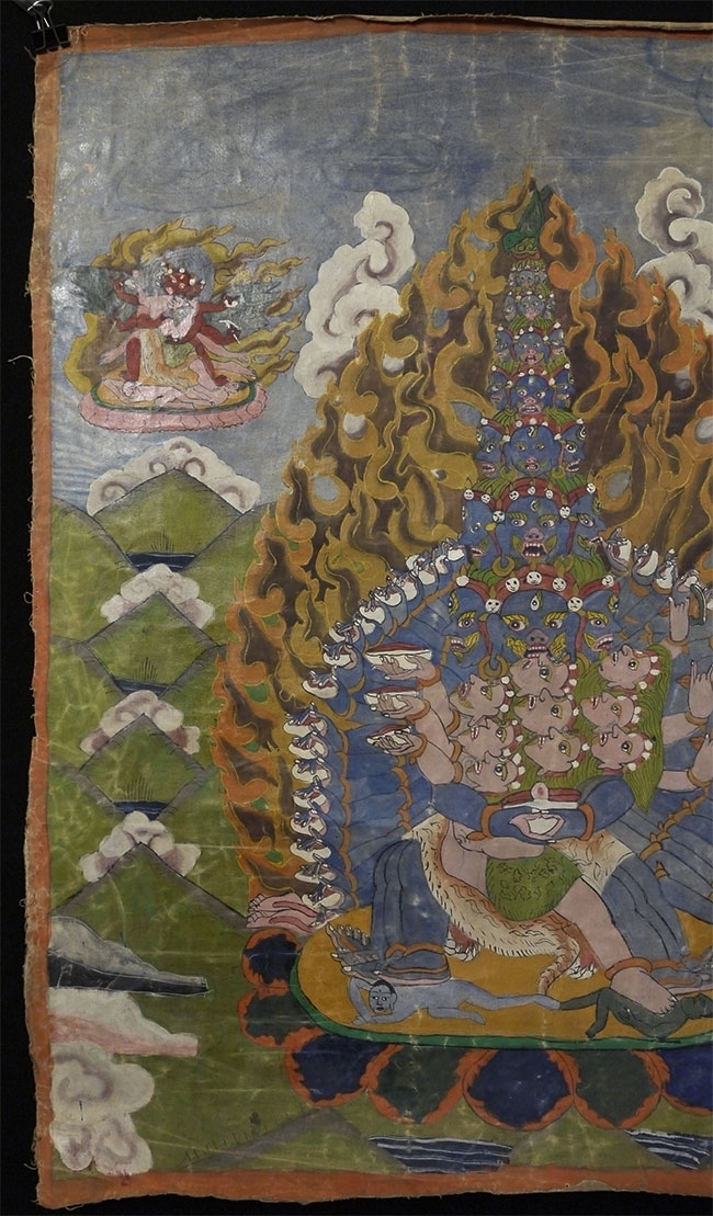 Powerful Thangka with incredible imagery unlike any other Thangka I've had. Probably early/mid 20thC, and purchased to be brought to the west before it was used for much ritual use, which is why it still has such vibrant colors. This is not a high volume tourist piece. Measures 21.5 x 27 inches. Originally in a cloth frame which was removed long ago. Very well painted.