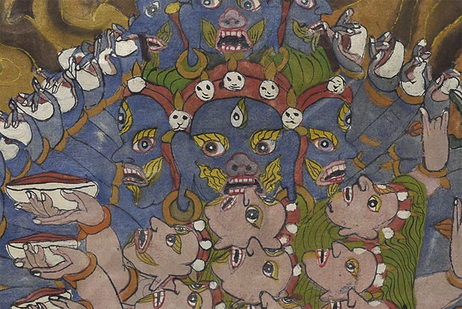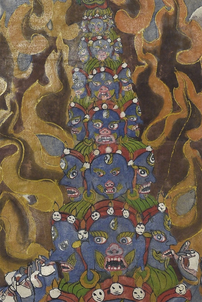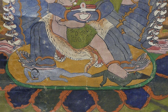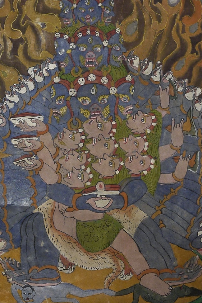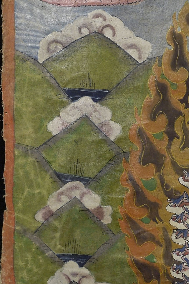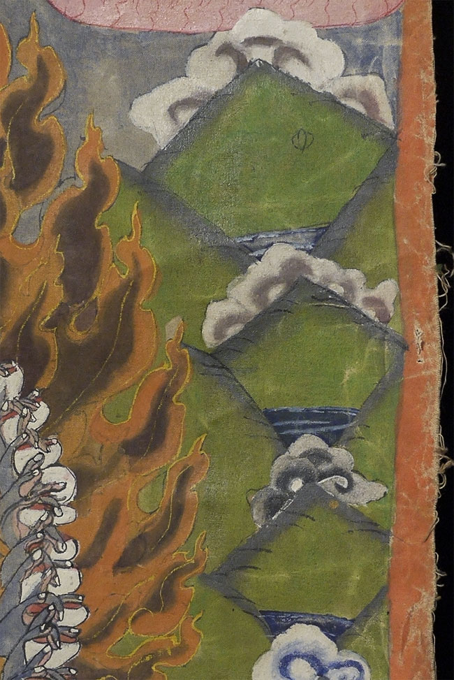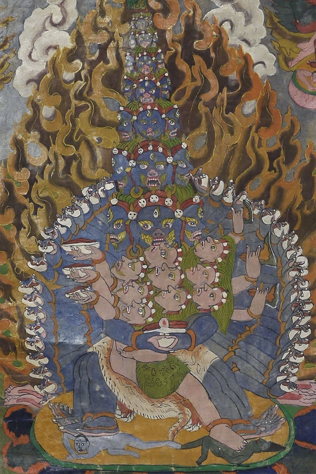 Powerful Thangka with incredible imagery unlike any other Thangka I've had. Probably early/mid 20thC, and purchased to be brought to the west before it was used for much ritual use, which is why it still has such vibrant colors. This is not a high volume tourist piece. Measures 21.5 x 27 inches. Originally in a cloth frame which was removed long ago. Very well painted.