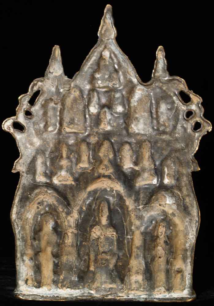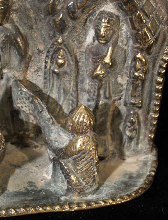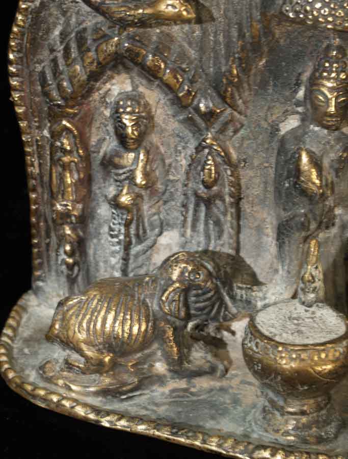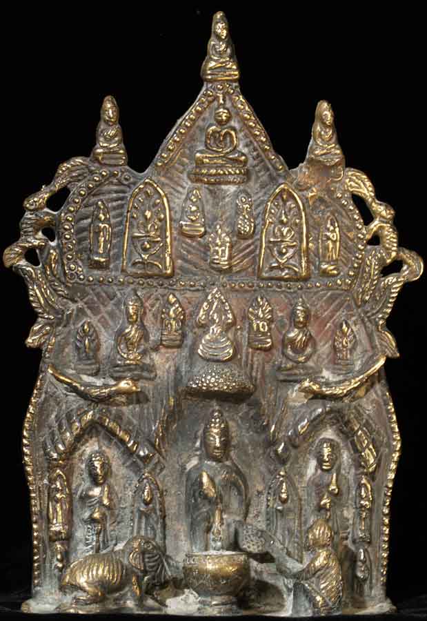Wonderful Thai antique Buddhist Shrine- this is an authentic one, unlike 95% of what you see on Ebay- it was purchased in the US from an estate, and has been in the USA for a while. It is a good 60 to 100 years old- these are hard to date exactly. It is a provincial piece, well done and is highly complex, with over 20 Buddhas, birds, squirrels, and a monkey and elephant. There are traces of devotional powder from ritual use, as well as authentic wear. It stands sturdily on its own. It is a good 9.74 inches tall by 6.75 inches wide by 2.5 inches deep