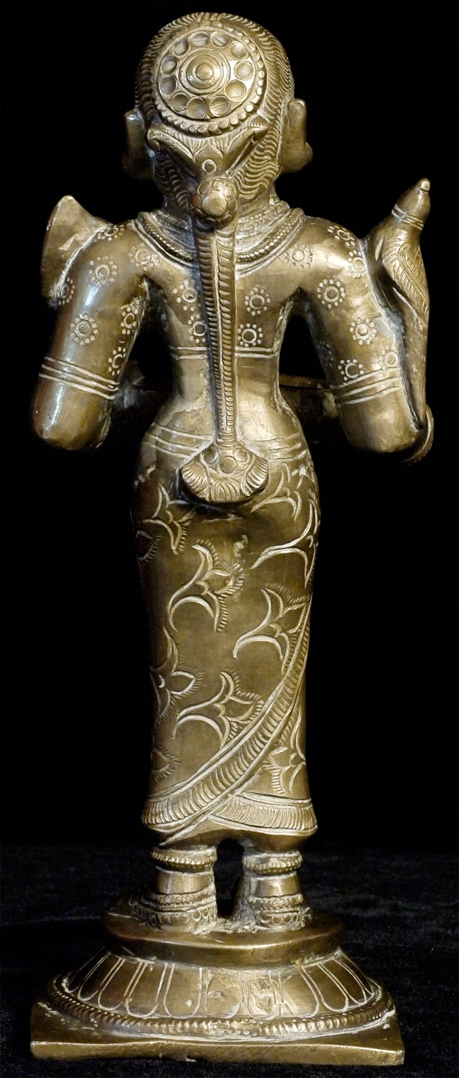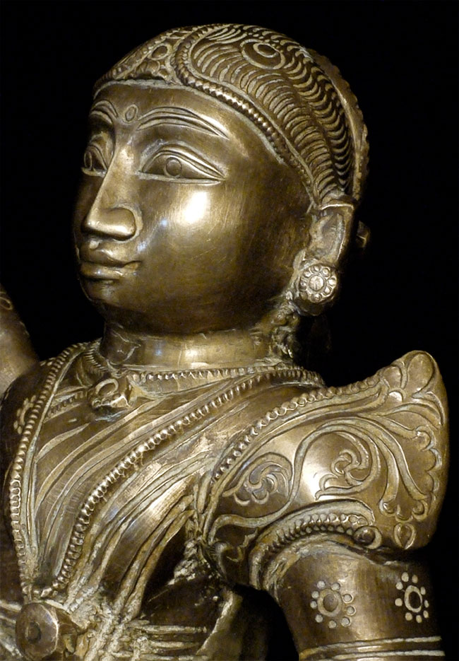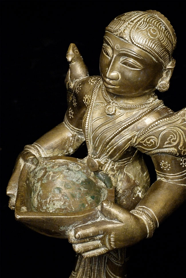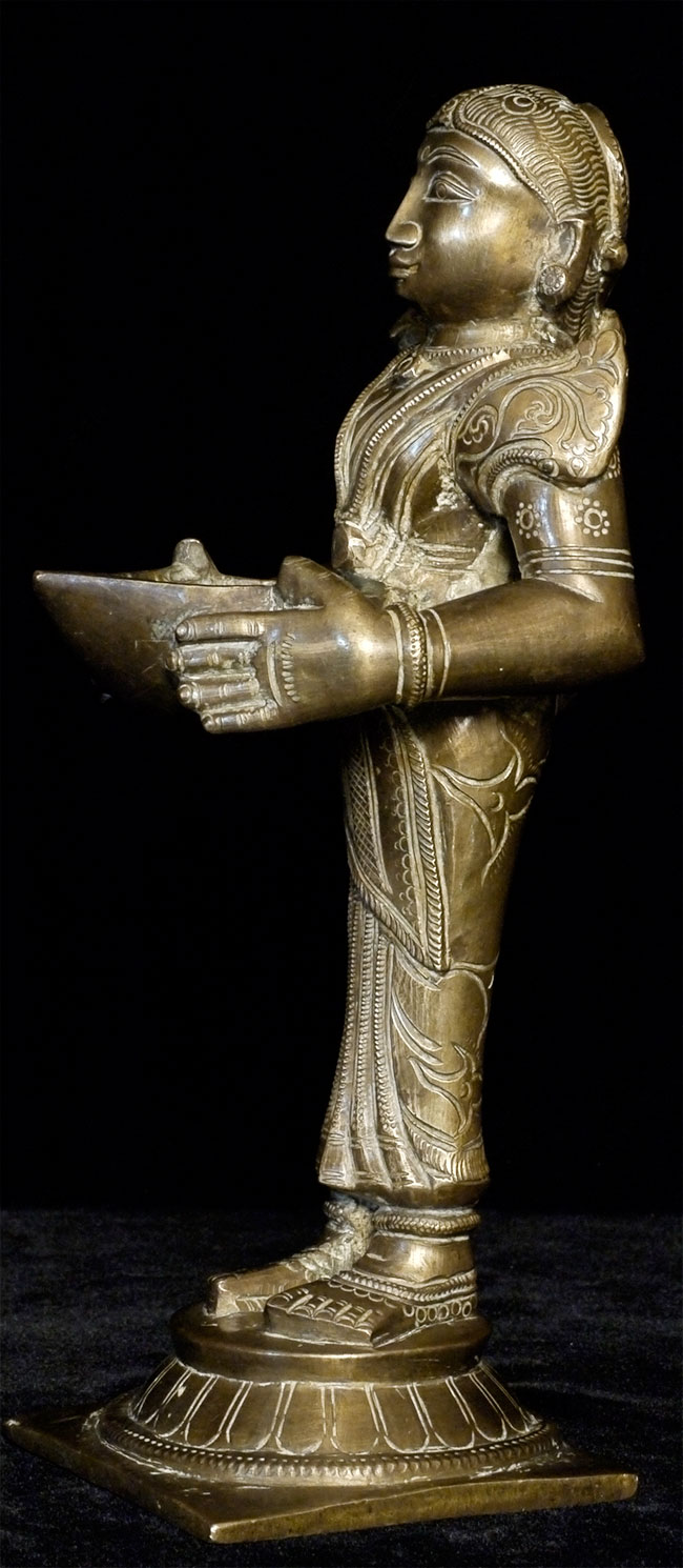 Antique Bronze Indian attendant lamp. Beautiful face. It stands 8 inches tall and is quite heavy. Remains of cleaning substance can likely be removed.